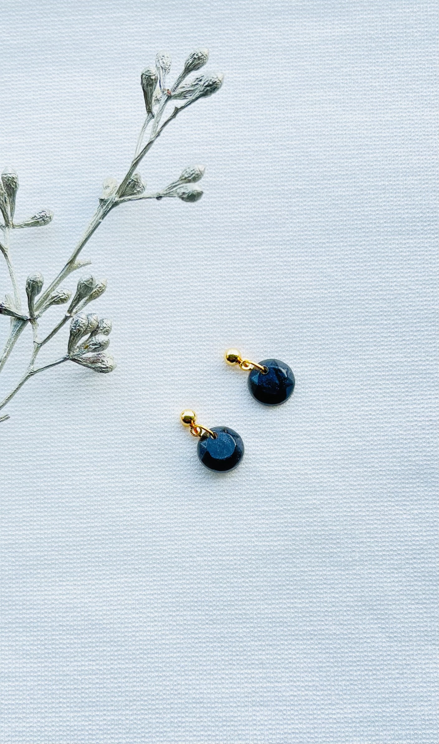 Aan 24 KRT goud vergulde RVS oorknopjes hangen mini ronde hangertjes van zwarte resin. Het is net of de hangertjes facet geslepen zijn. De oorbellen zijn licht van gewicht en hebben een totale lengte van 1,5 cm.