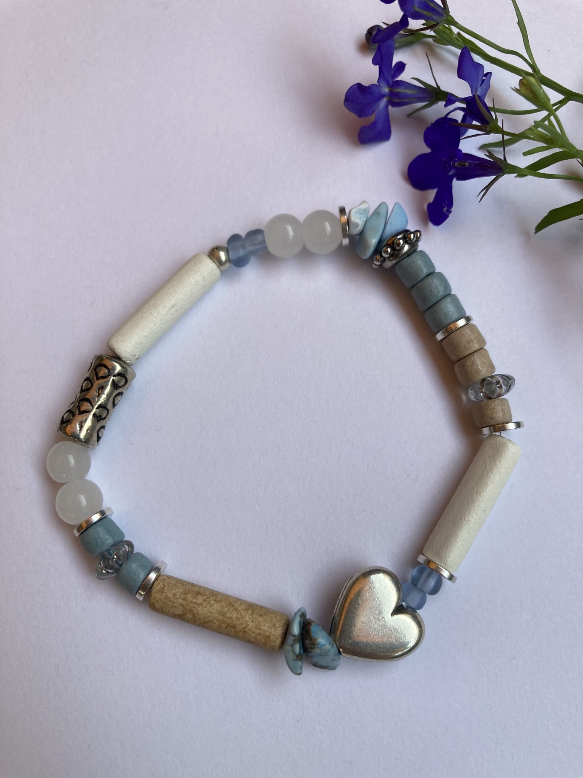 Deze armband is echt uniek. Het is gemaakt van blauwe, witte en zandkleurige Griekse keramiekkralen afgewisseld met blauwe chipstones, zilveren spacers en een zilver RVS hart.