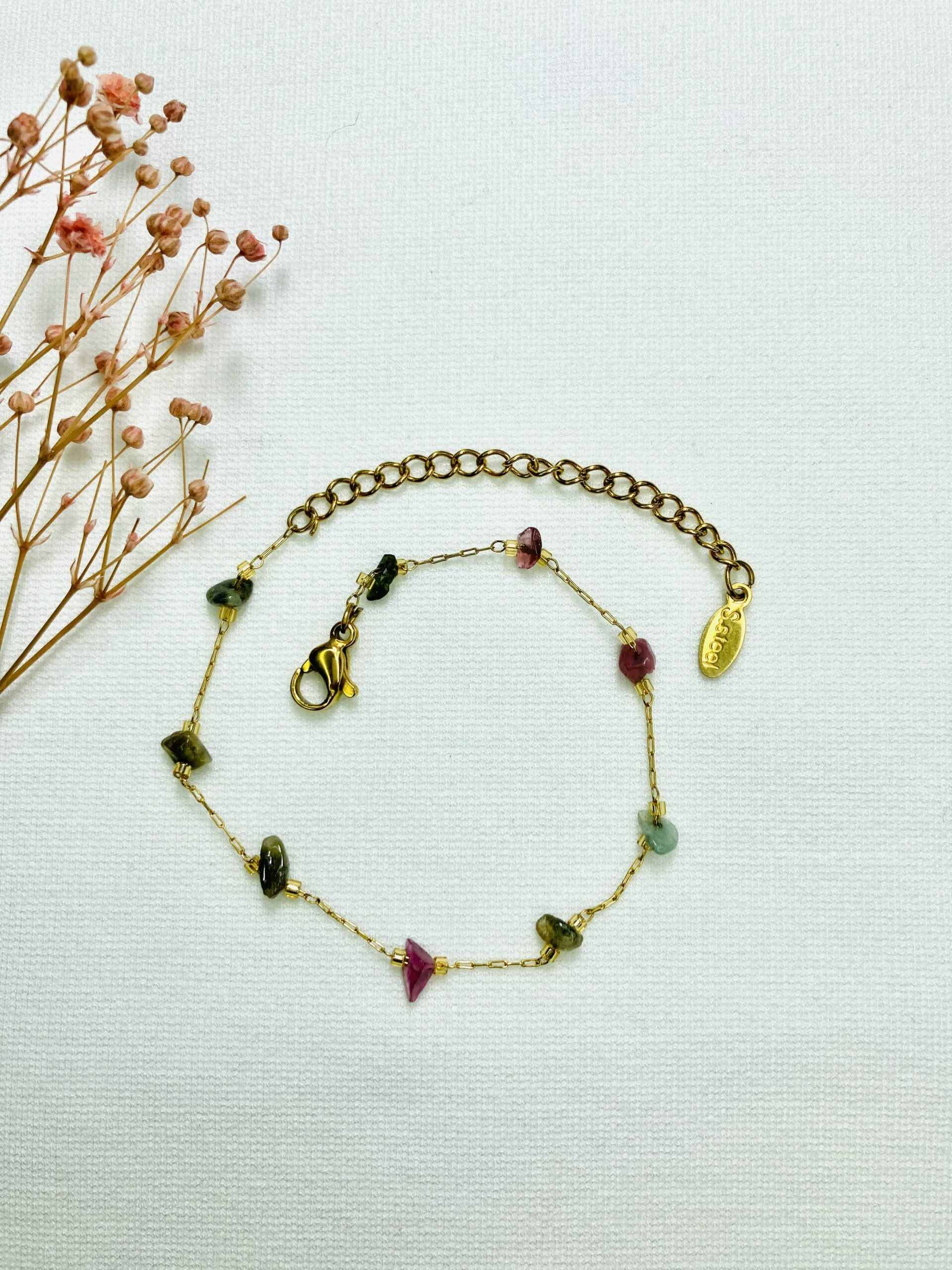 Deze kleurtjes zijn toch prachtig! Het RVS gouden armbandje valt op door de mooie chipstone kraaltjes. Het is afgewerkt met een 18 KRT verguld slotje en verlengkettinkje.