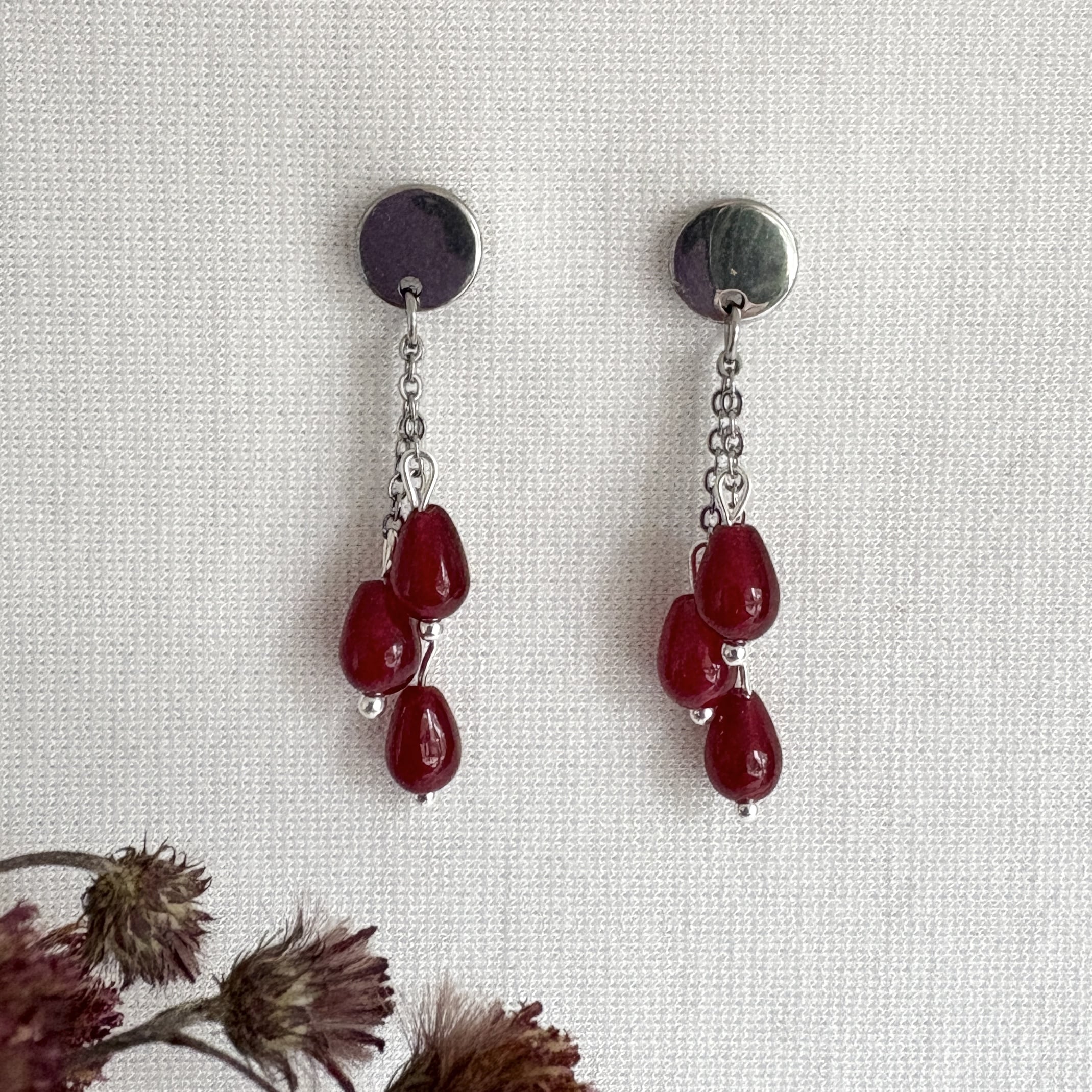 Een schattig model bordeauxrode donkerrode oorbellen met gladde jade druppels. Drie kleine druppelkralen hangen aan RVS zilveren kettinkjes die weer hangen aan een RVS zilveren oorsteker. De oorbellen zijn licht van gewicht en hebben een totale lengte van 3,5 cm.