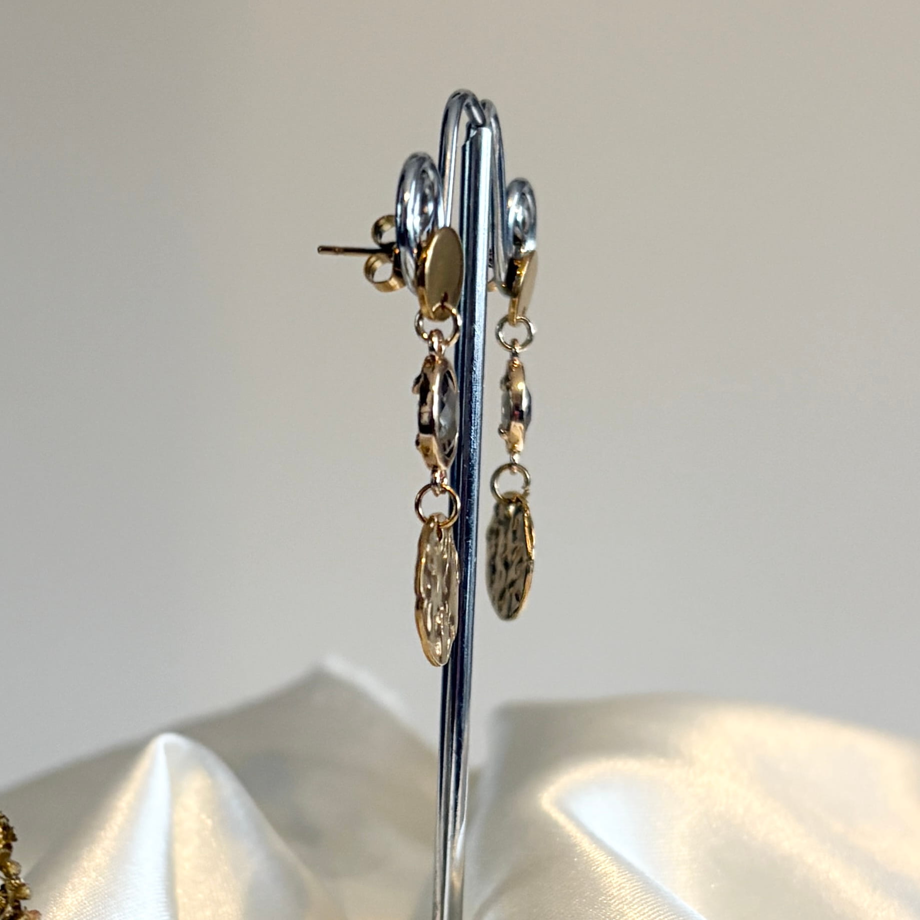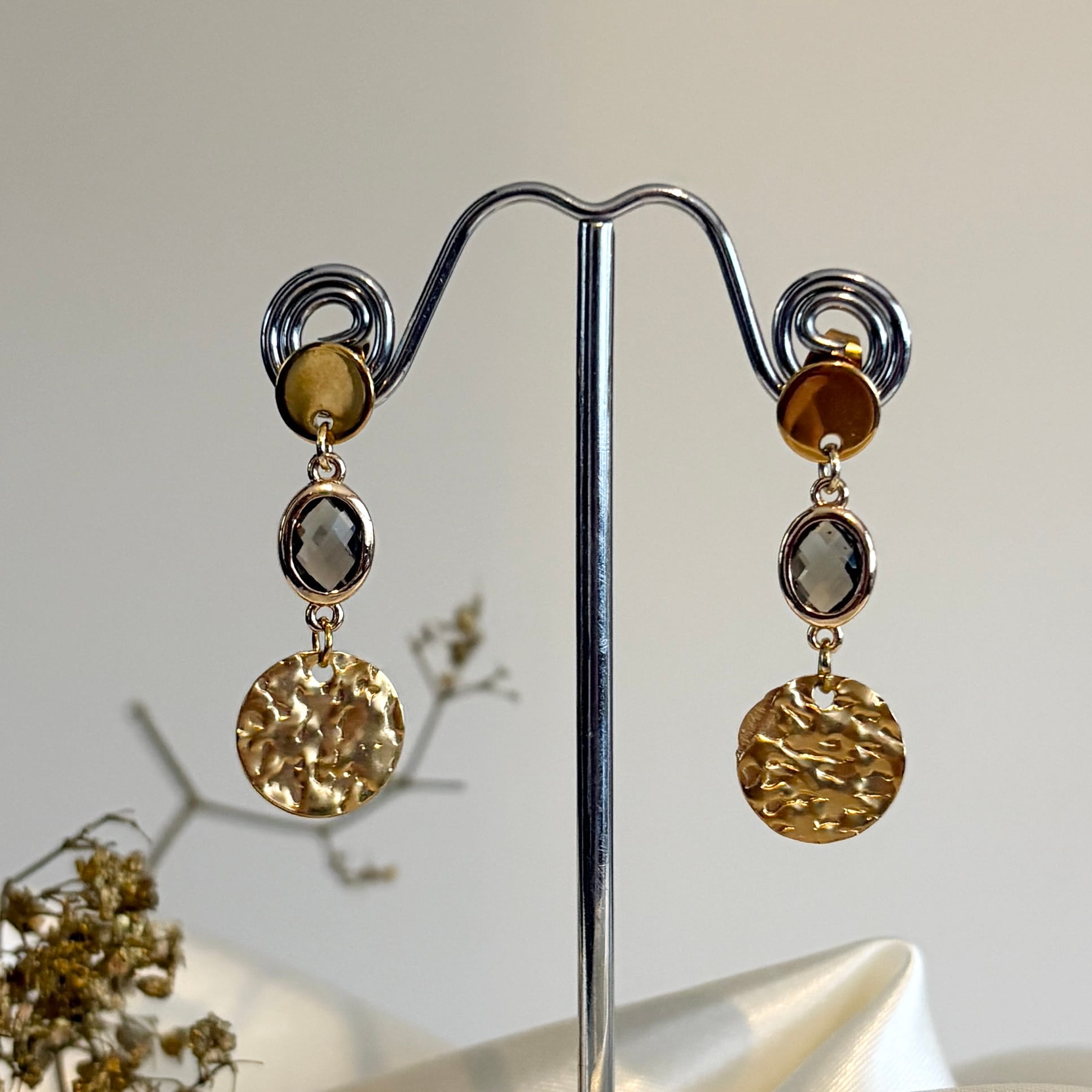 Deze bruine oorbellen hebben mooie ronde gouden RVS hangers met een oneffen structuur. De hangers zijn met een transparant bruine kristal connector verbonden aan de RVS gouden oorstekers. Subtiel van design en gemaakt van mooi materiaal maakt dat je deze oorbellen altijd kan dragen; naar een feestje of gewoon alledag. Ze zijn licht van gewicht en 4 cm lang.