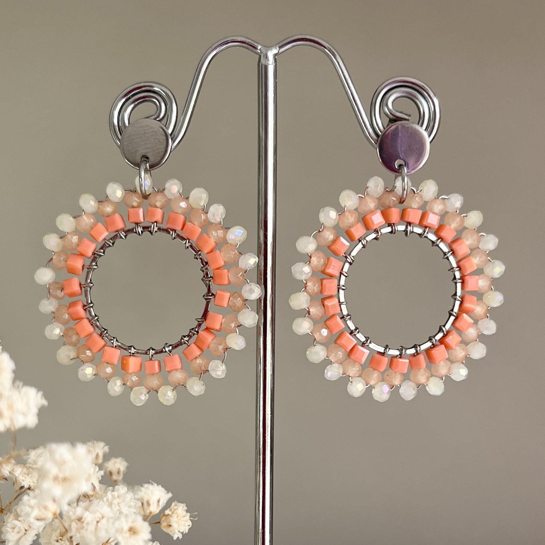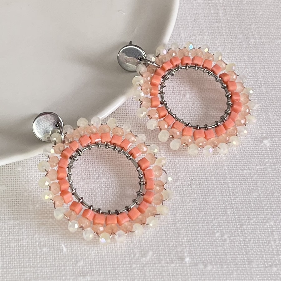 Hou je van statement oorbellen! Dan zoek je deze crème met zalm kleurige oorbellen met facetgeslepen kraaltjes! De hangers zijn mooie rond van vorm en omlijst met de hand geregen kraaltjes. Crème met zalm van kleur facetgeslepen ronde en kubuskraaltjes. Deze vrolijk gekleurde oorbellen zijn heel erg geschikt voor een feest, maar natuurlijk ook mooi voor alle dag! Ze hangen aan zilveren RVS oorstekers. Ze zijn licht van gewicht en de lengte is 4,5 cm.