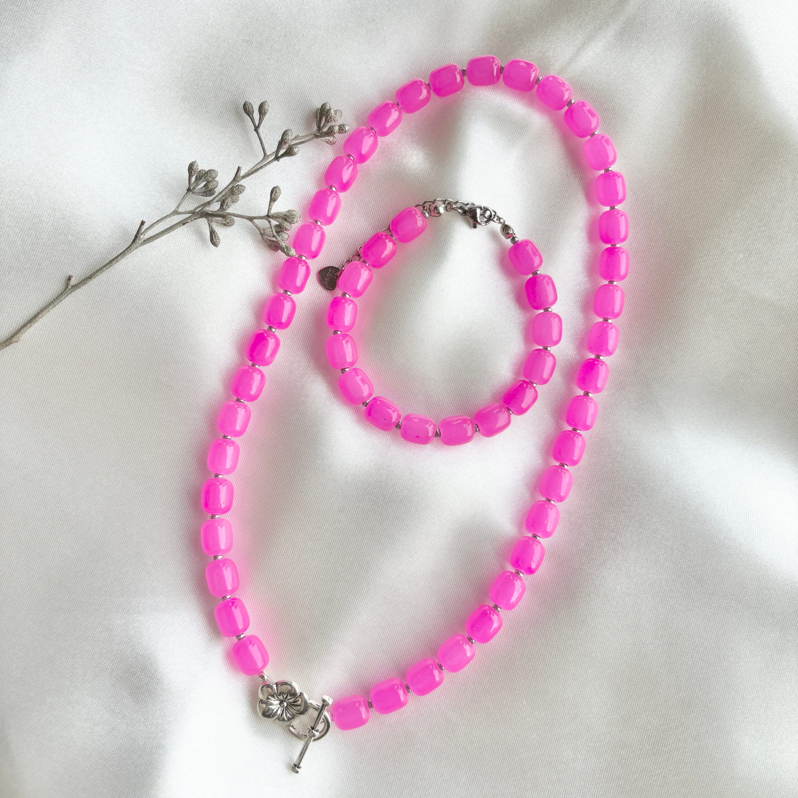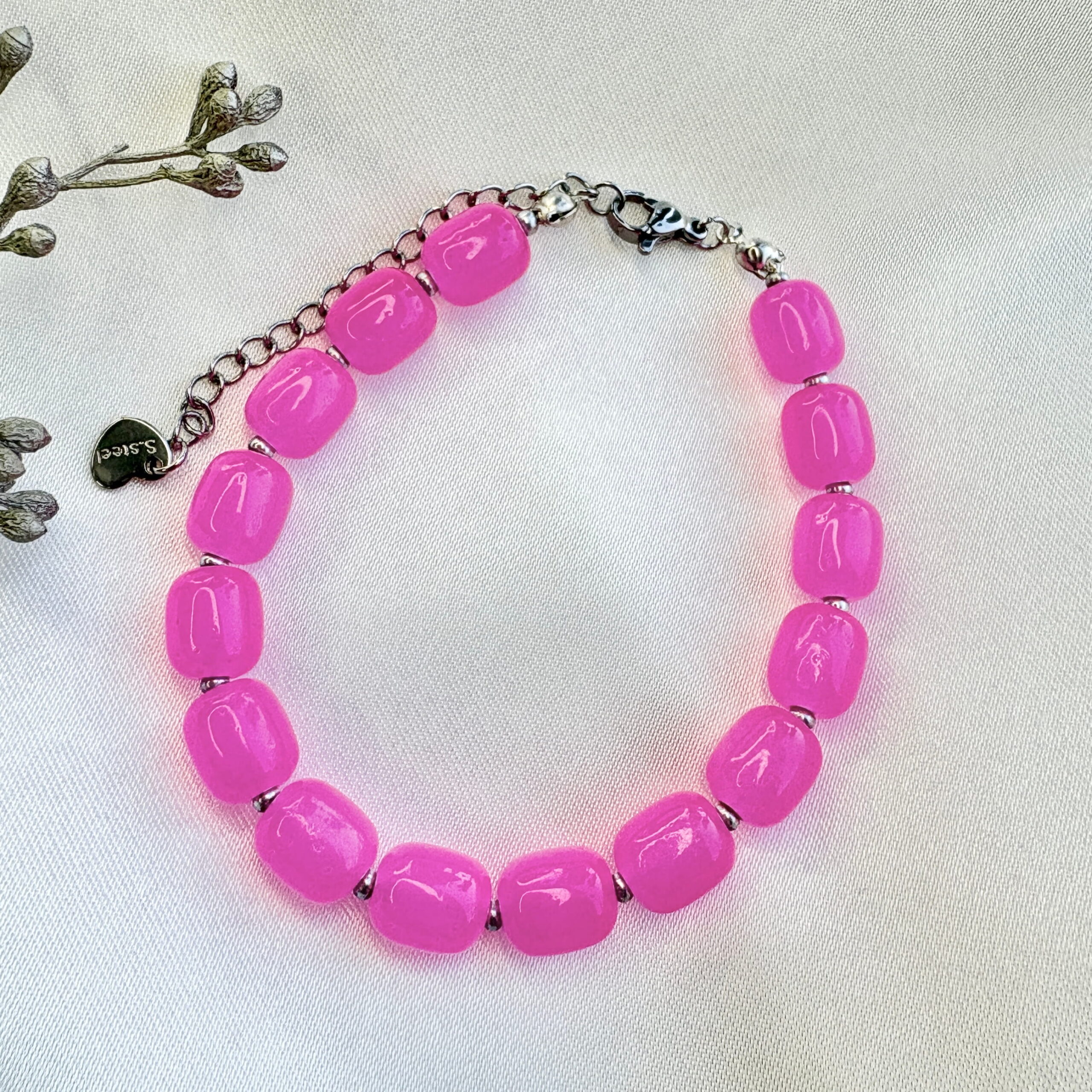 Voeg een vleugje elegantie toe aan je lente- en zomergarderobe. Deze prachtige fuchsia roze armband is de perfecte aanvulling voor dames die houden van subtiele verfijning. De vrolijke fuchsia roze tint zorgt voor een speelse touch, terwijl het ontwerp moeiteloos bij je favoriete outfits past. Laat je stijl stralen, ongeacht het weer! Combineer de armband met andere kleuren of draag ‘m solo voor een subtiel statement óf maak er een leuke sieradenset van met de bijpassende ketting. De armband is afgewerkt met een zilver RVS slotje. De lengte is +/- 15 cm + verlengkettinkje van 5 cm.