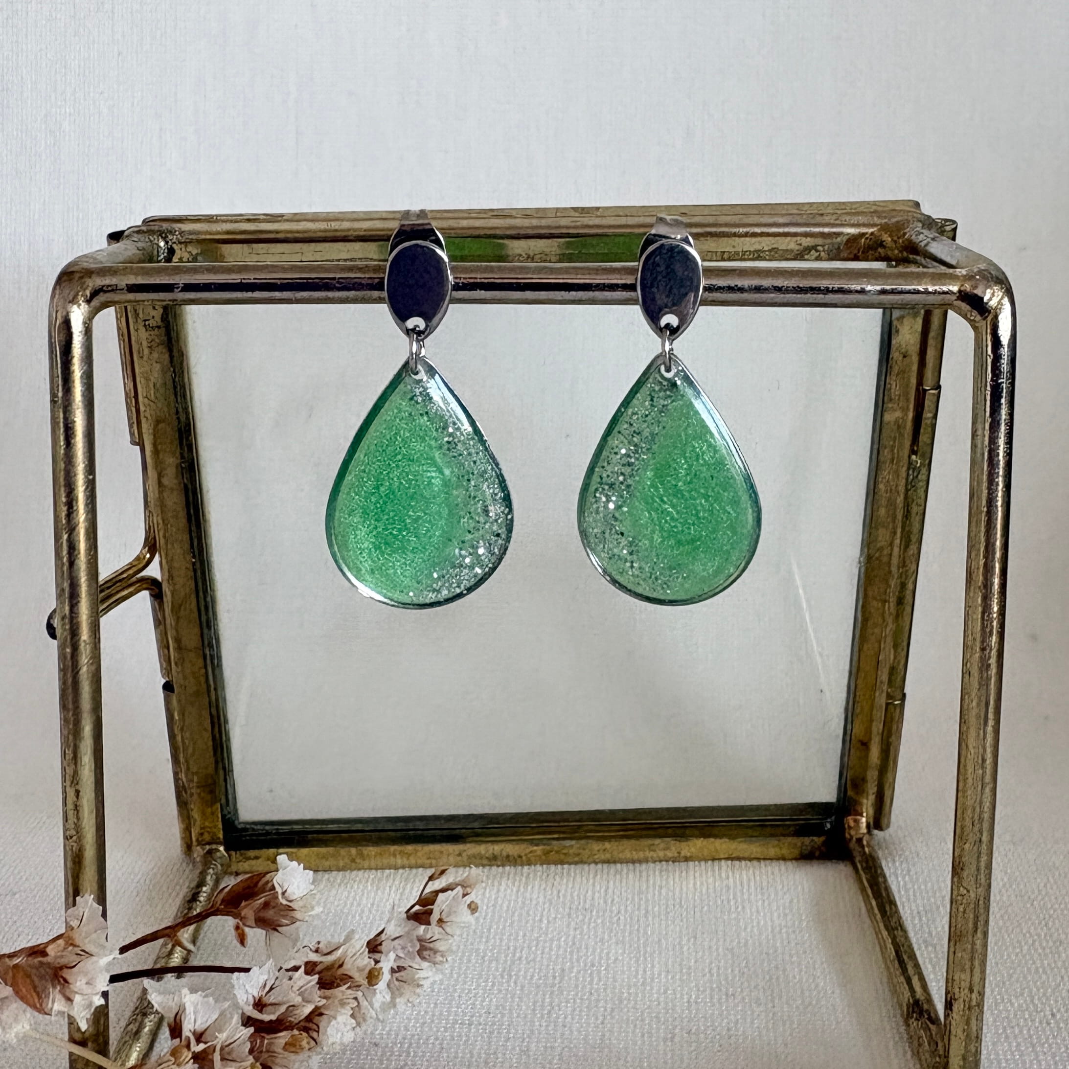 Groene resin oorbellen met subtiele zilveren glittertjes in een zilveren RVS druppelvorm. De oorbellen zijn licht van gewicht en hebben een totale lengte van 3 cm.