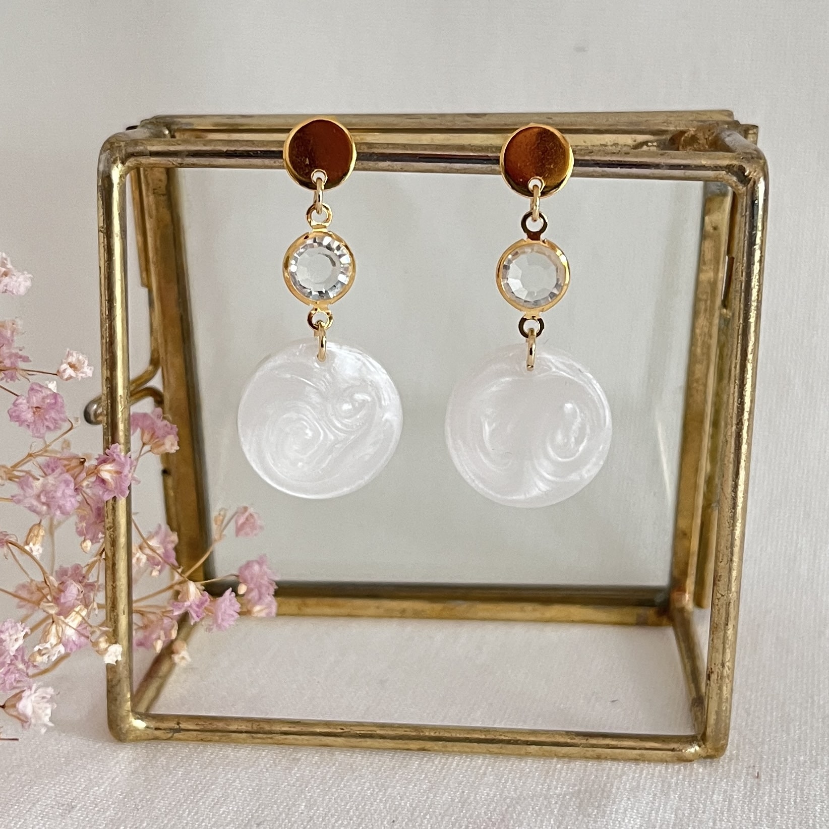 Deze oorbellen passen overal bij. Ze zijn van een mooie parelmoer witte kleur. Rond en strak van resin hangend aan een tussenstuk met kristalsteentje en RVS gouden oorstekers. Ze zijn licht van gewicht en de lengte is 4 cm.