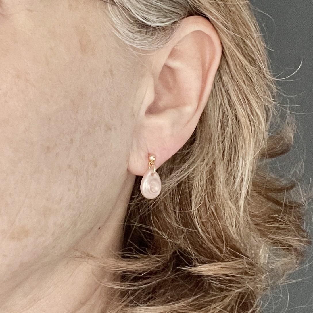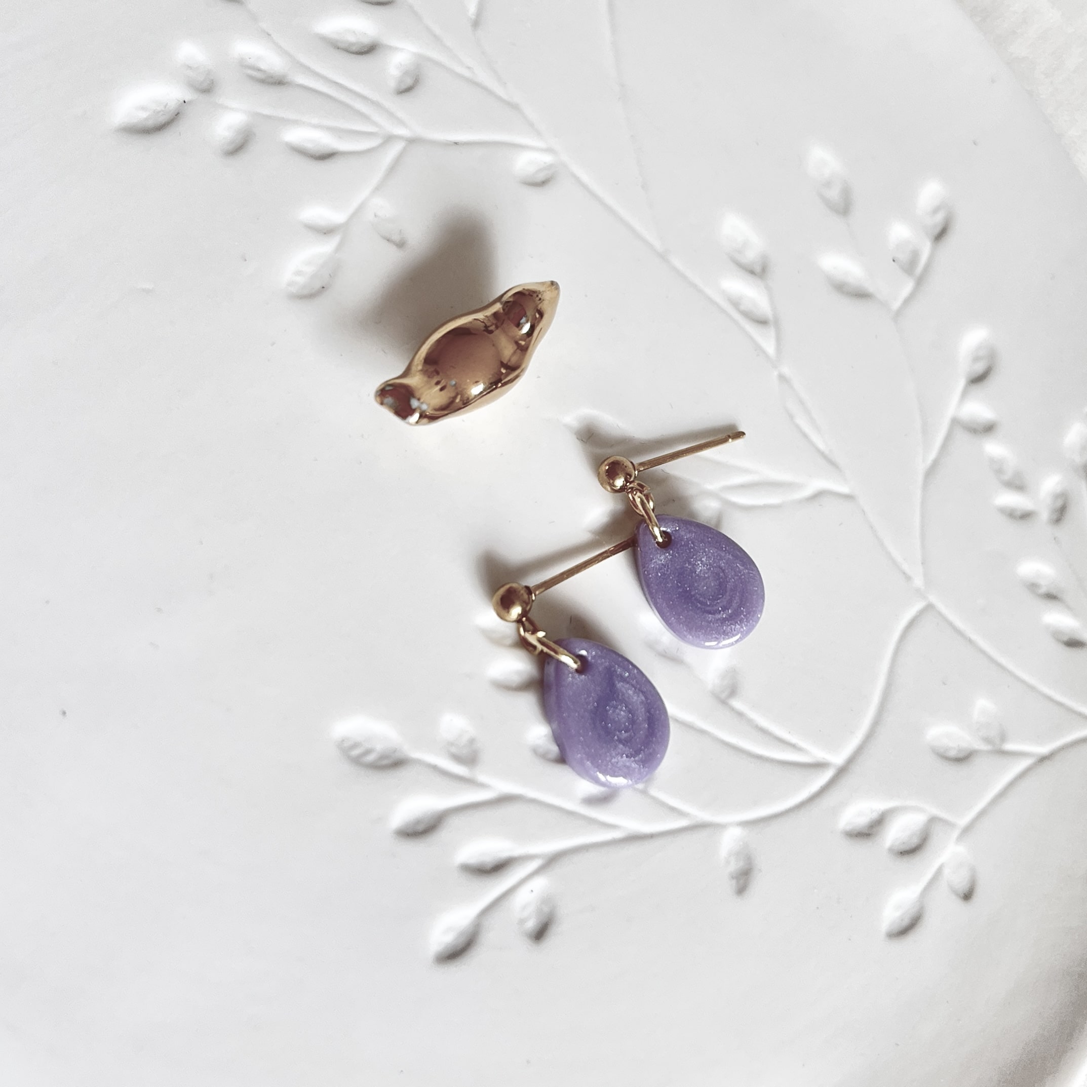 Kleine lila oorbellen in druppelvorm aan vergulde RVS gouden oorknopjes. Ze zijn licht van gewicht. De totale lengte is 1,5 cm.