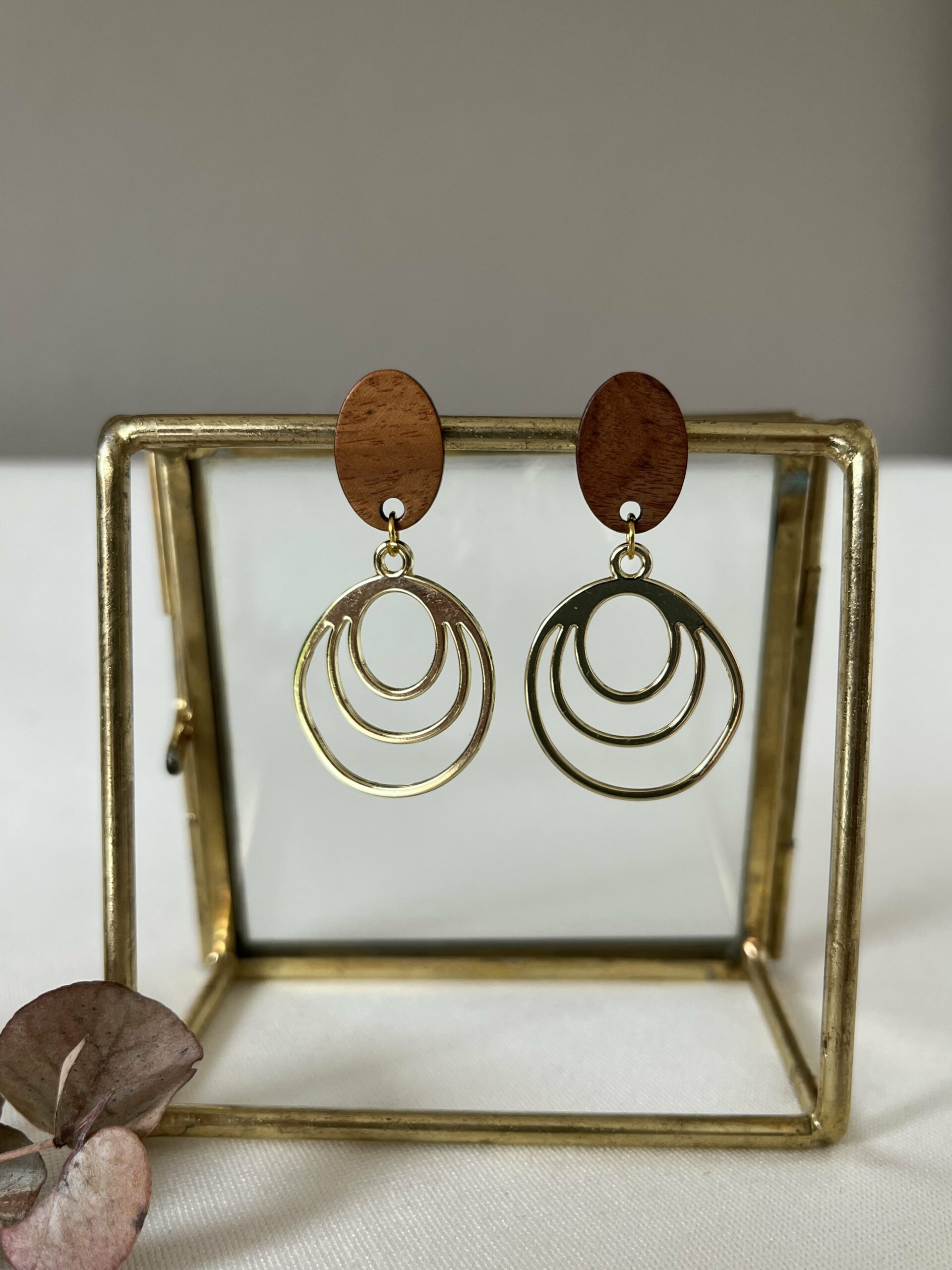 Lange slanke oorbellen van metaal aan een gouden RVS oorsteker