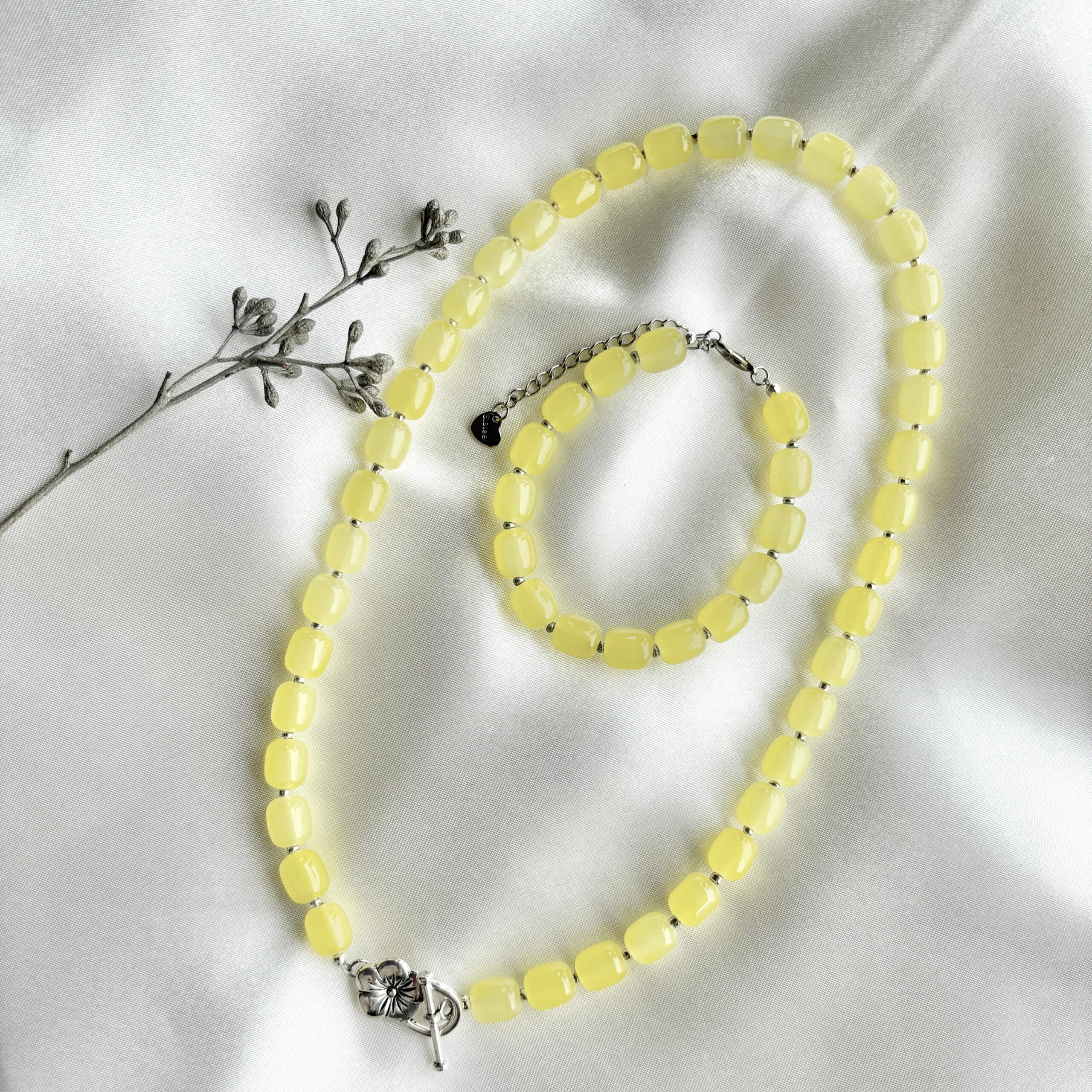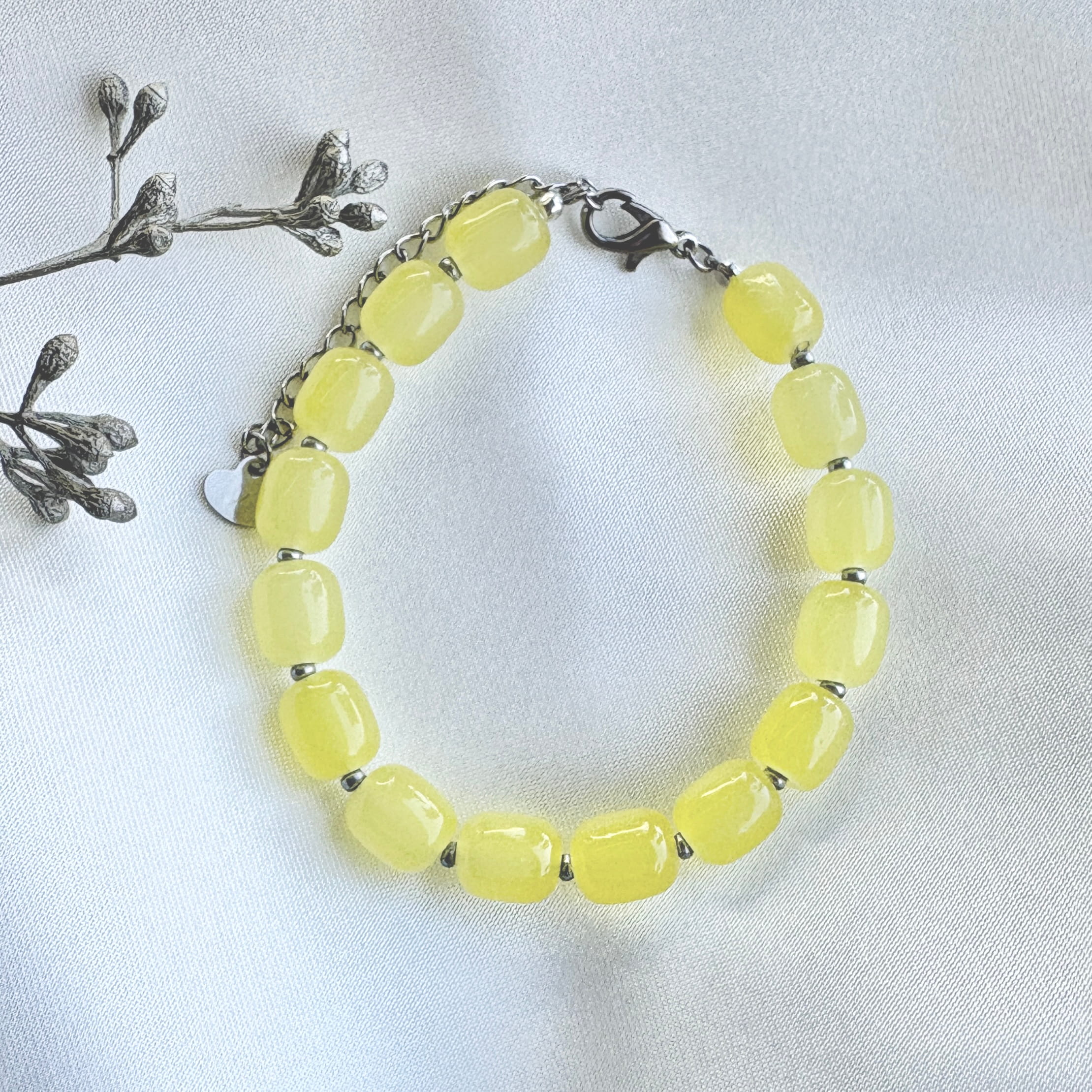 Een lichtgele kralenarmband is de finishing touch voor jouw armparty en deze lichtgele armband mag zeker niet ontbreken! De lichtgele glazen ovale kralen worden afgewisseld met zilveren miyiki kraaltjes. De frisse kleur geeft je look direct een zomergevoel en is super makkelijk te combineren. Draag de armband solo of maak er een leuke sieradenset van met de bijpassende ketting en oorbellen. De armband is afgewerkt met een zilver RVS slotje. De lengte is +/- 15 cm + verlengkettinkje van 5 cm.