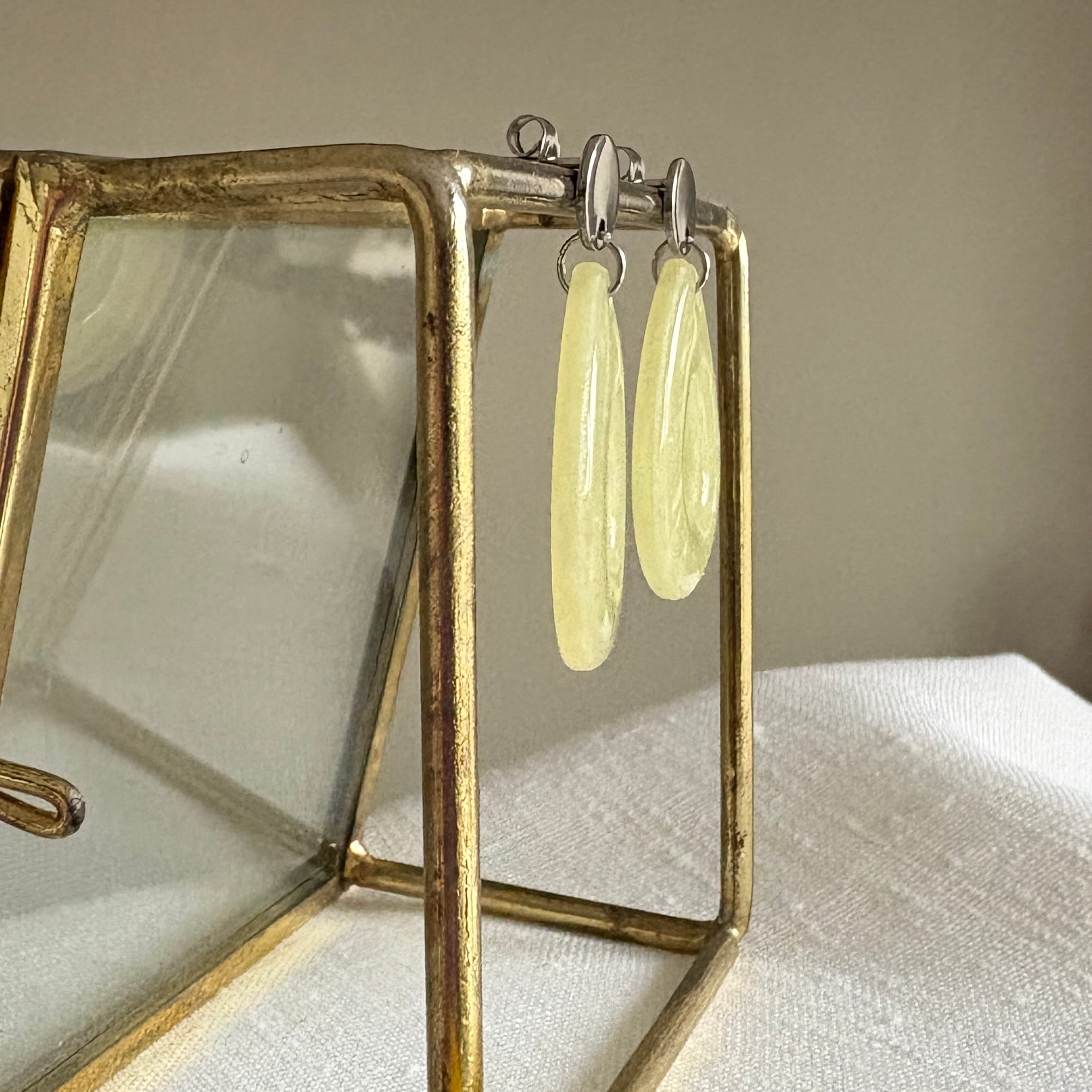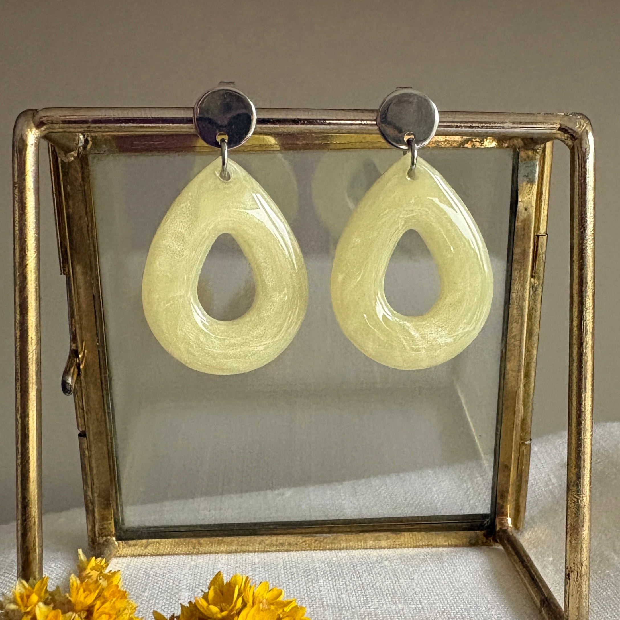 Laat je stralen met deze frisse lichtgele oorbellen van resin. Door de mooie druppelvorm en de glanzende kleur zijn deze lichtgele oorbellen echte aandachtstrekkers. Ze hangen aan zilveren RVS oorstekers, zijn licht van gewicht en hebben een totale lengte van 4 cm.