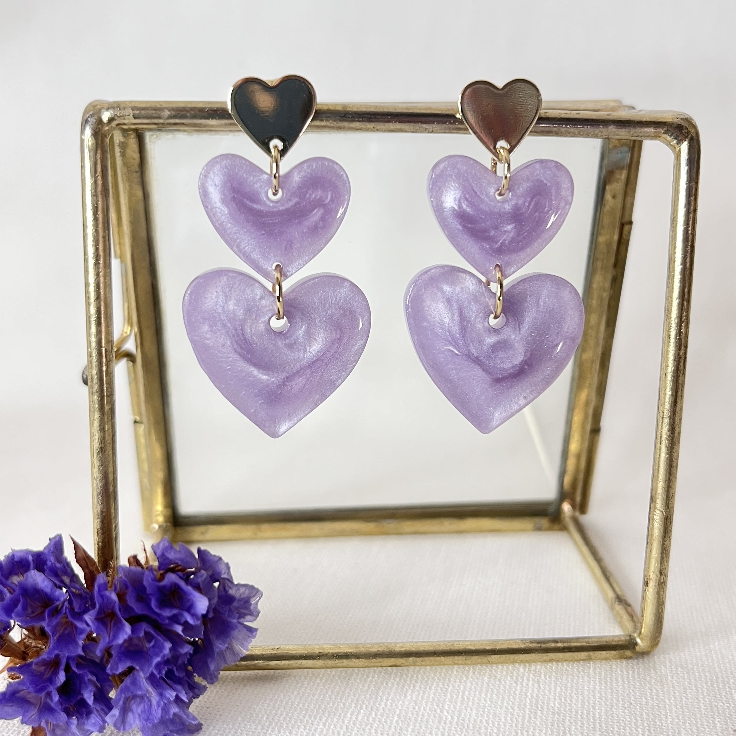 Leuke lila oorbellen van resin met 2 hartjes aan een goudkleurig hartje oorsteker