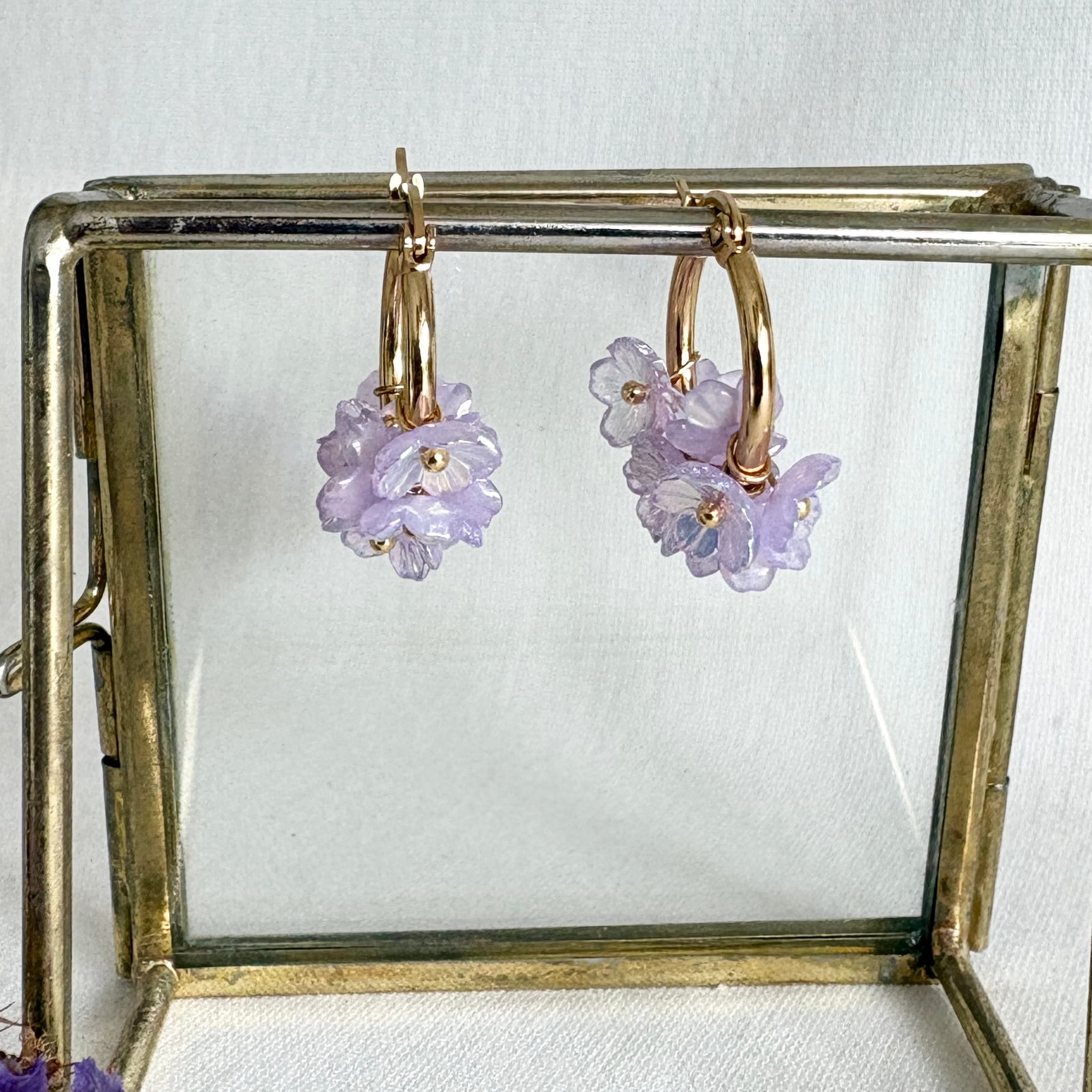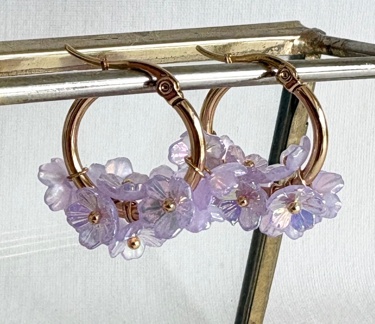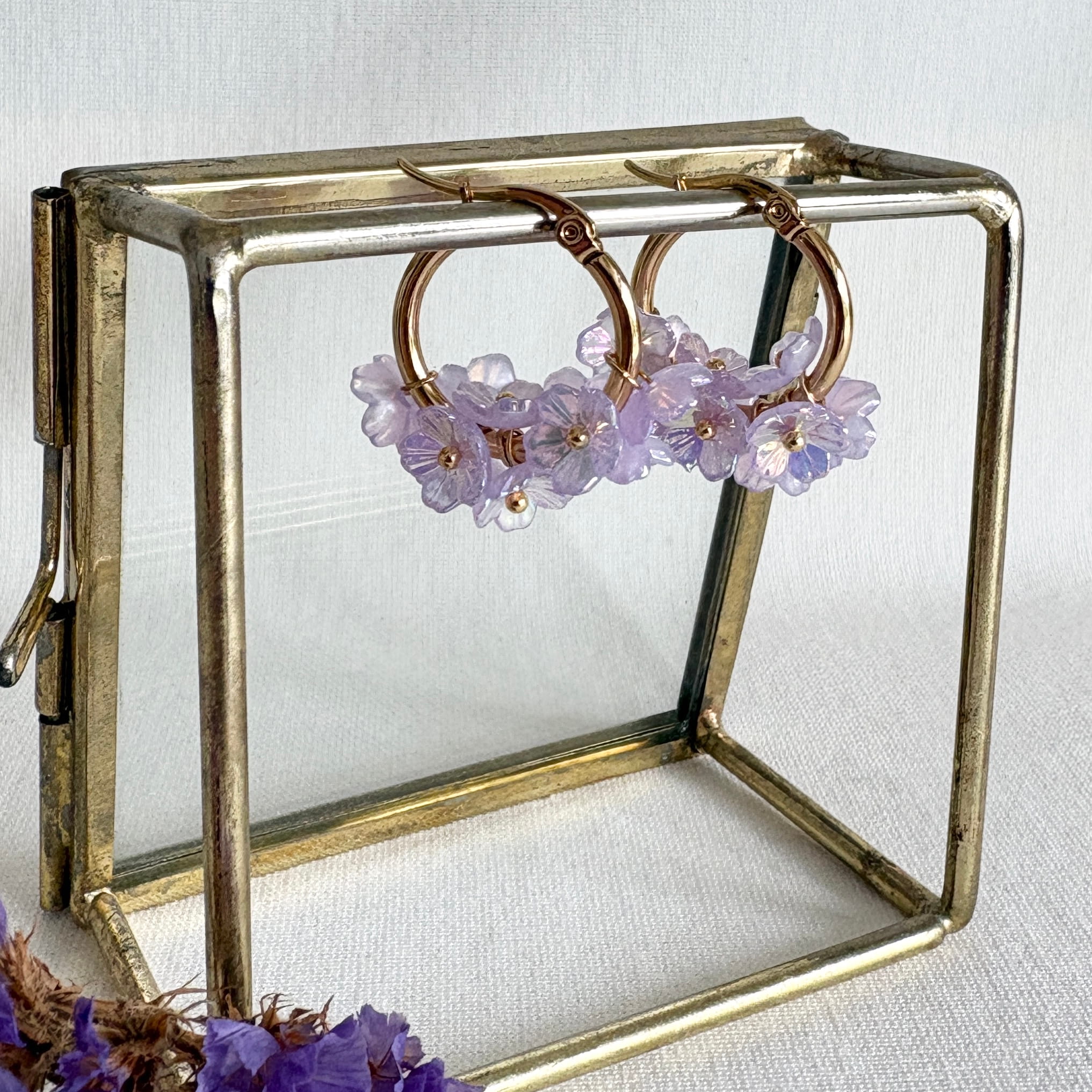 Lila oorbellen – RVS gouden creolen gevuld met lila bloemetjes