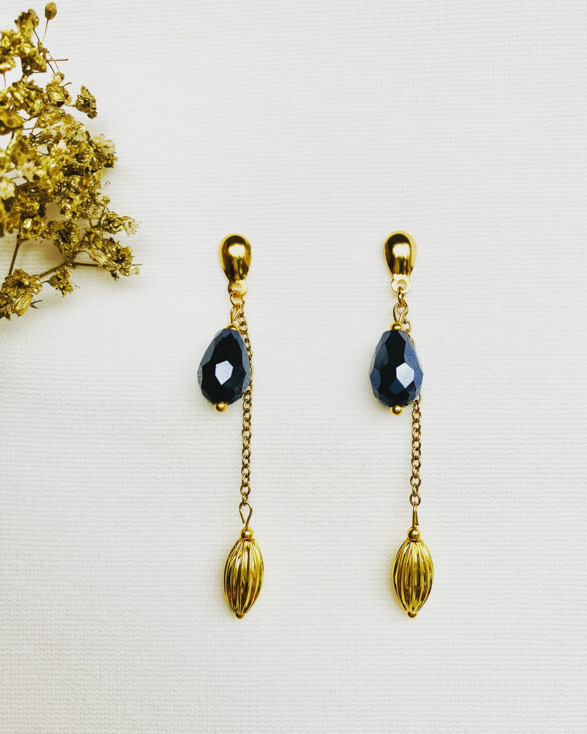 Feestelijke oorbellen van RVS gouden oorstekers met daaraan hangend een RVS gouden kettinkje en een gouden geribbelde kraal. Om het geheel af én kleurrijk te maken is de oorbel afgewerkt met een facetgeslepen glasdruppel van de kleur midnight blue. De oorbellen zijn licht van gewicht en de totale lengte is 6 cm.