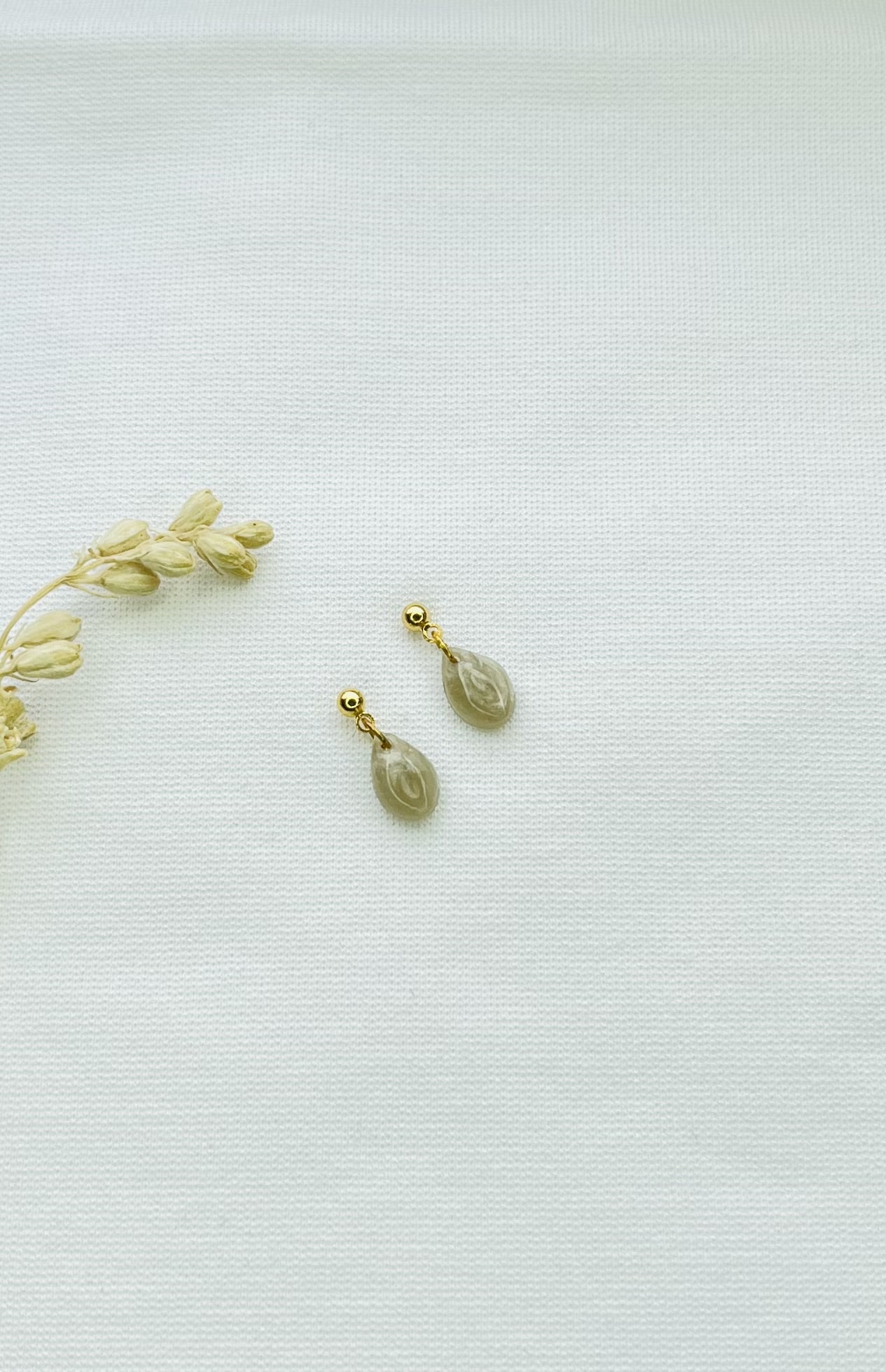 Mini naturel taupe oorbellen in druppelvorm aan RVS gouden oorknopjes