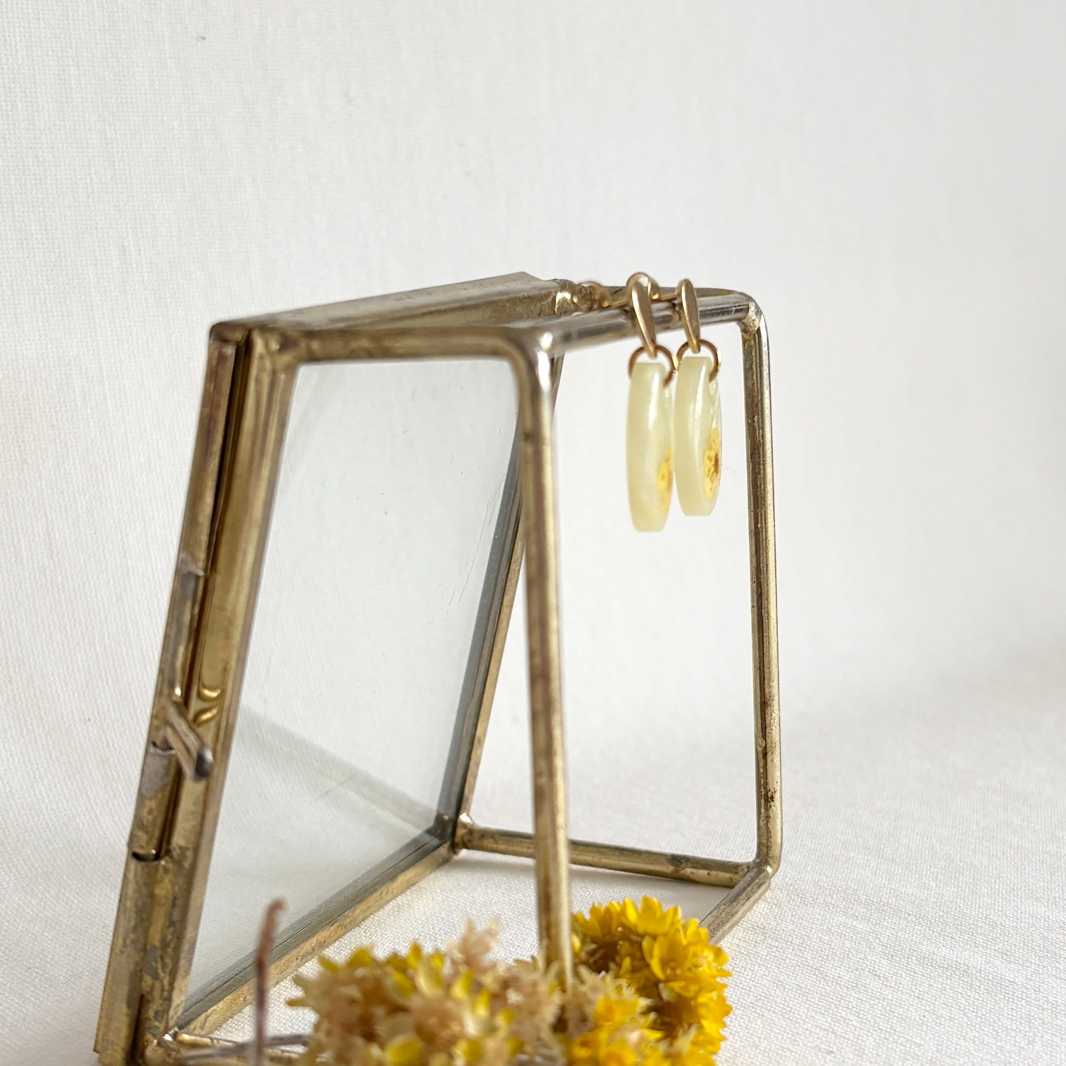 Mooi maatje lichtgele oorbellen van resin met gele droogbloem