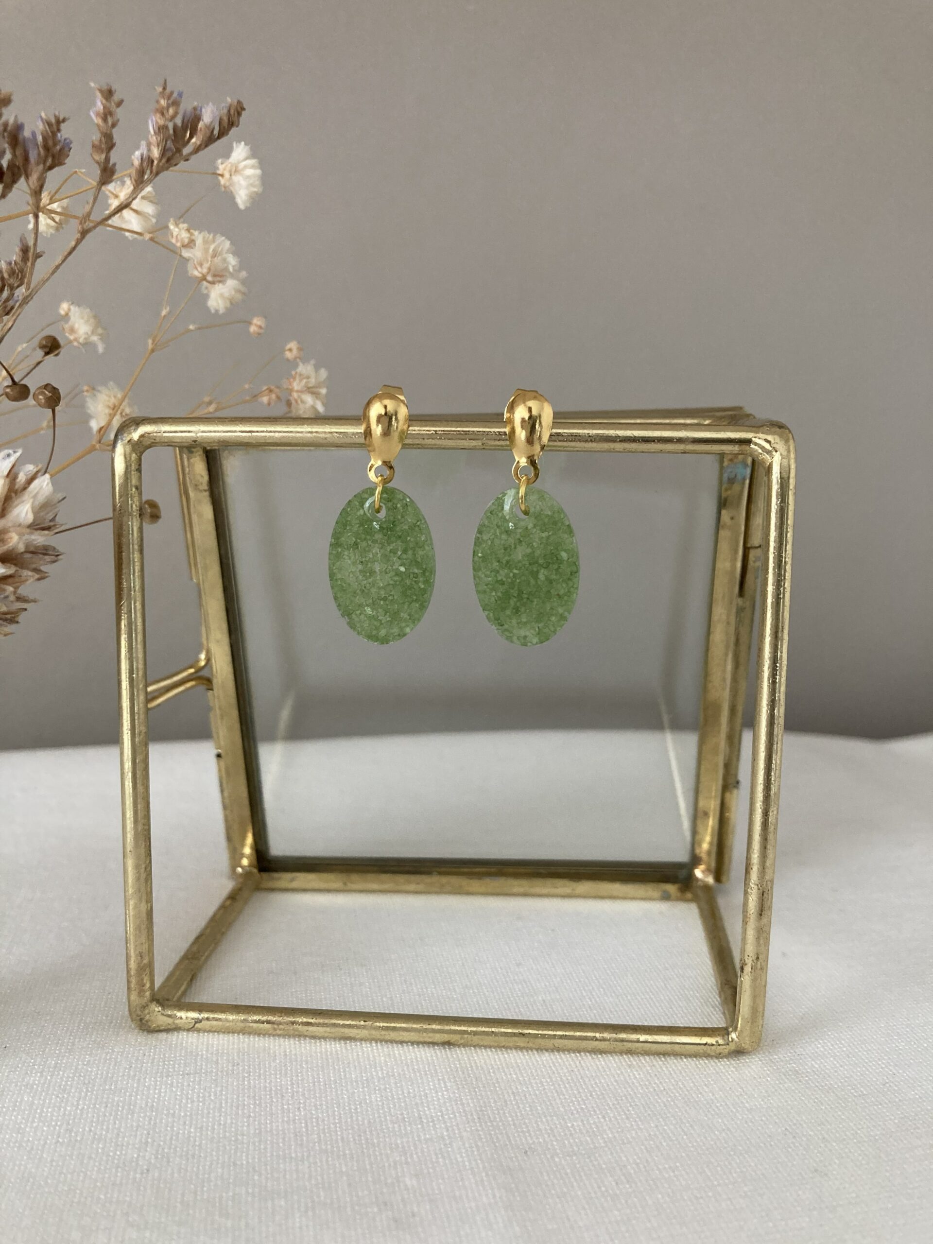 Mooi maatje ovale oorbellen van blanke resin gevuld met groene korreltjes