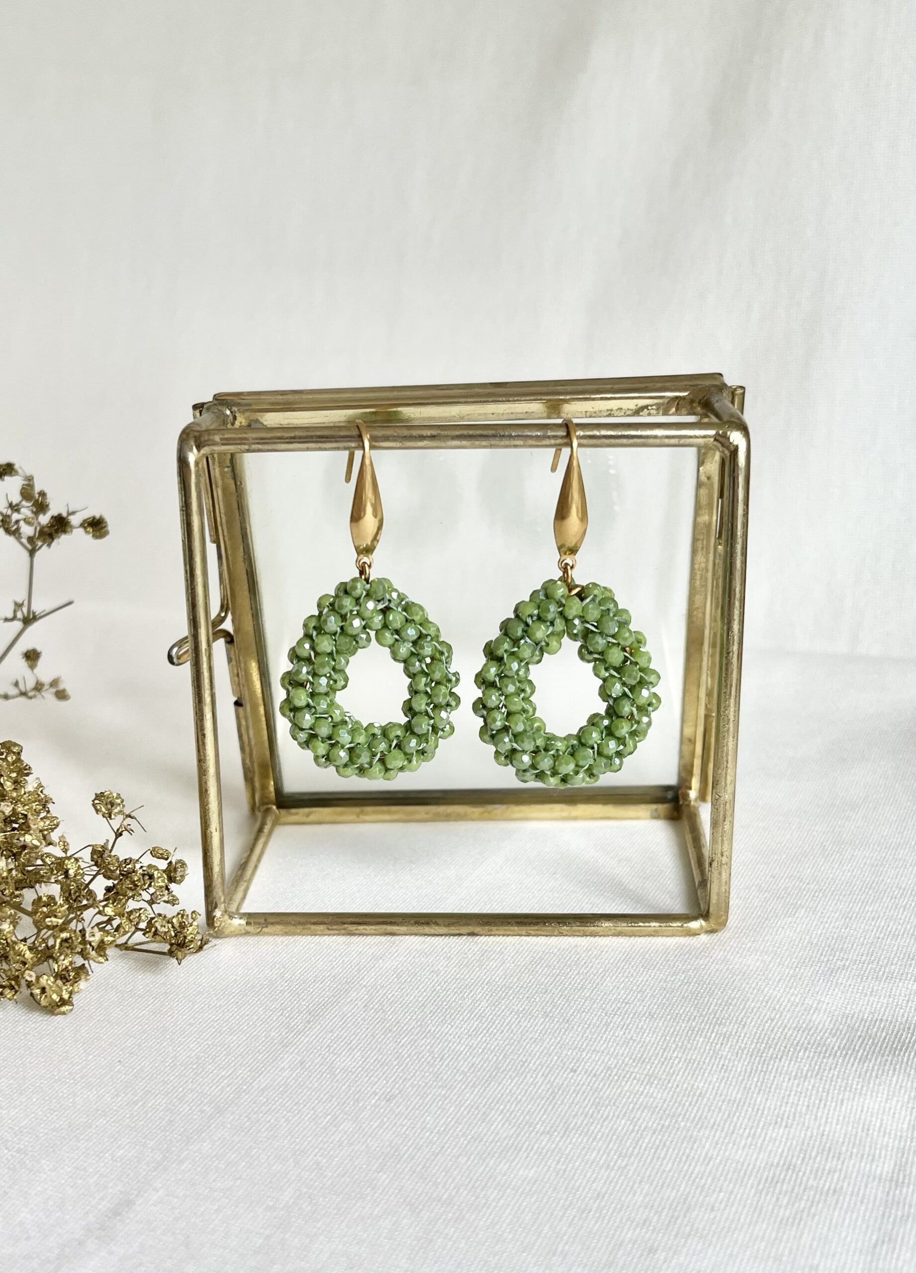 Écht mooi! Sjiek voor een feestje, maar ook gewoon mooi voor alledag! Deze oorbellen met de mooie mos- of olijfgroene facet geslepen kraaltjes zijn geschikt voor zóveel gelegenheden. Ze zijn met de hand geregen en gevormd tot een druppel. De druppels hangen aan gouden RVS oorhaakjes. Licht van gewicht en de lengte is 5 cm.