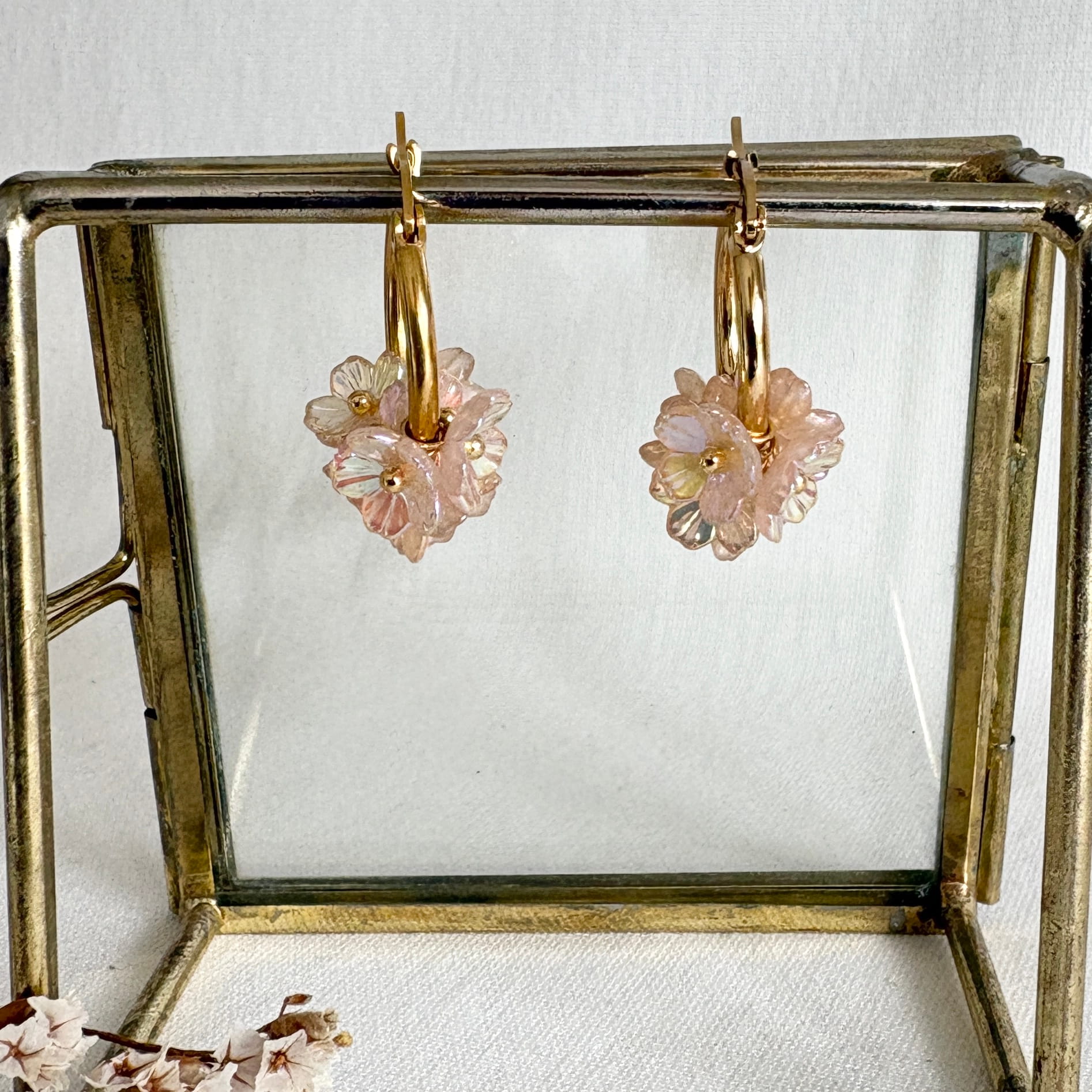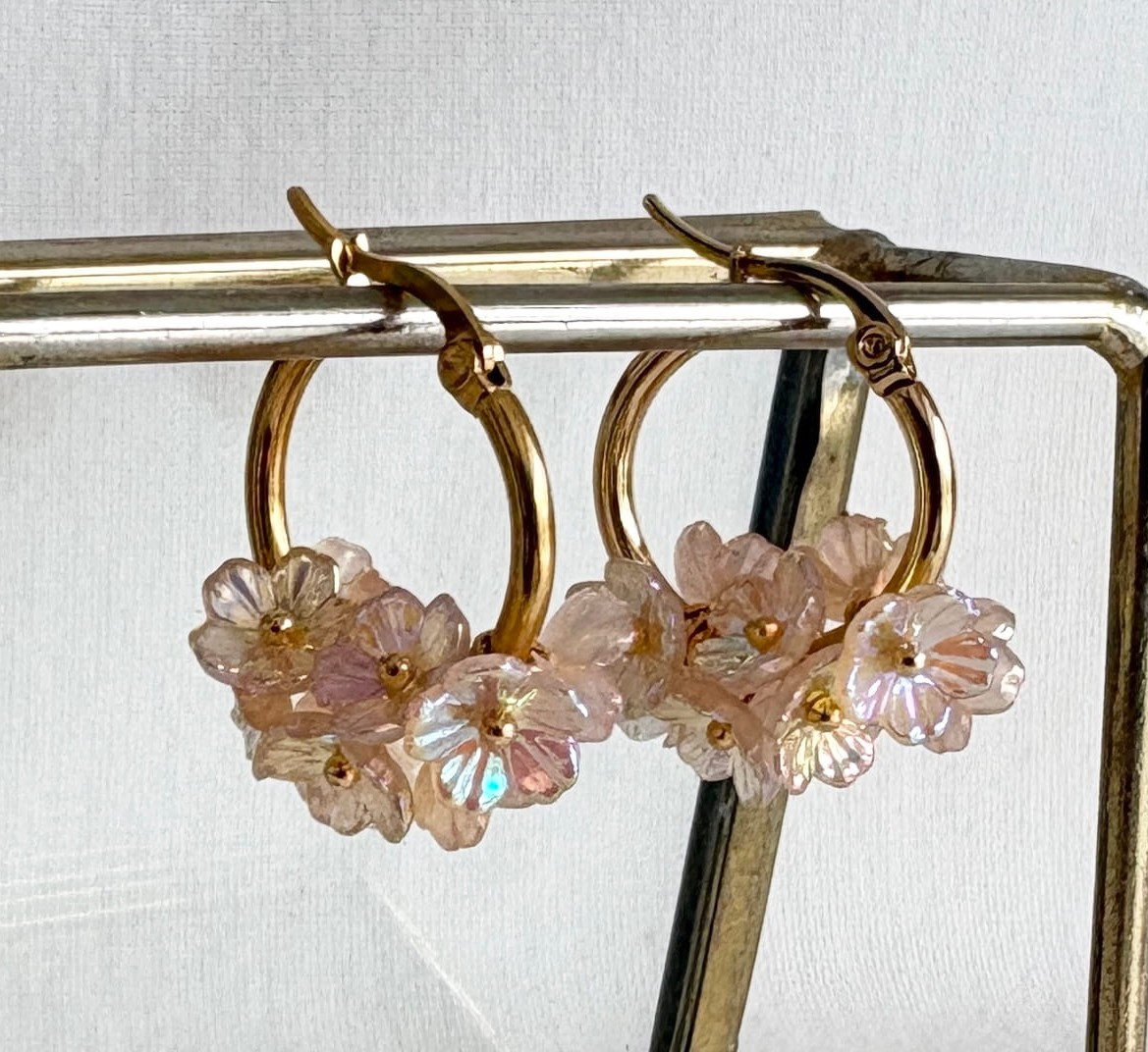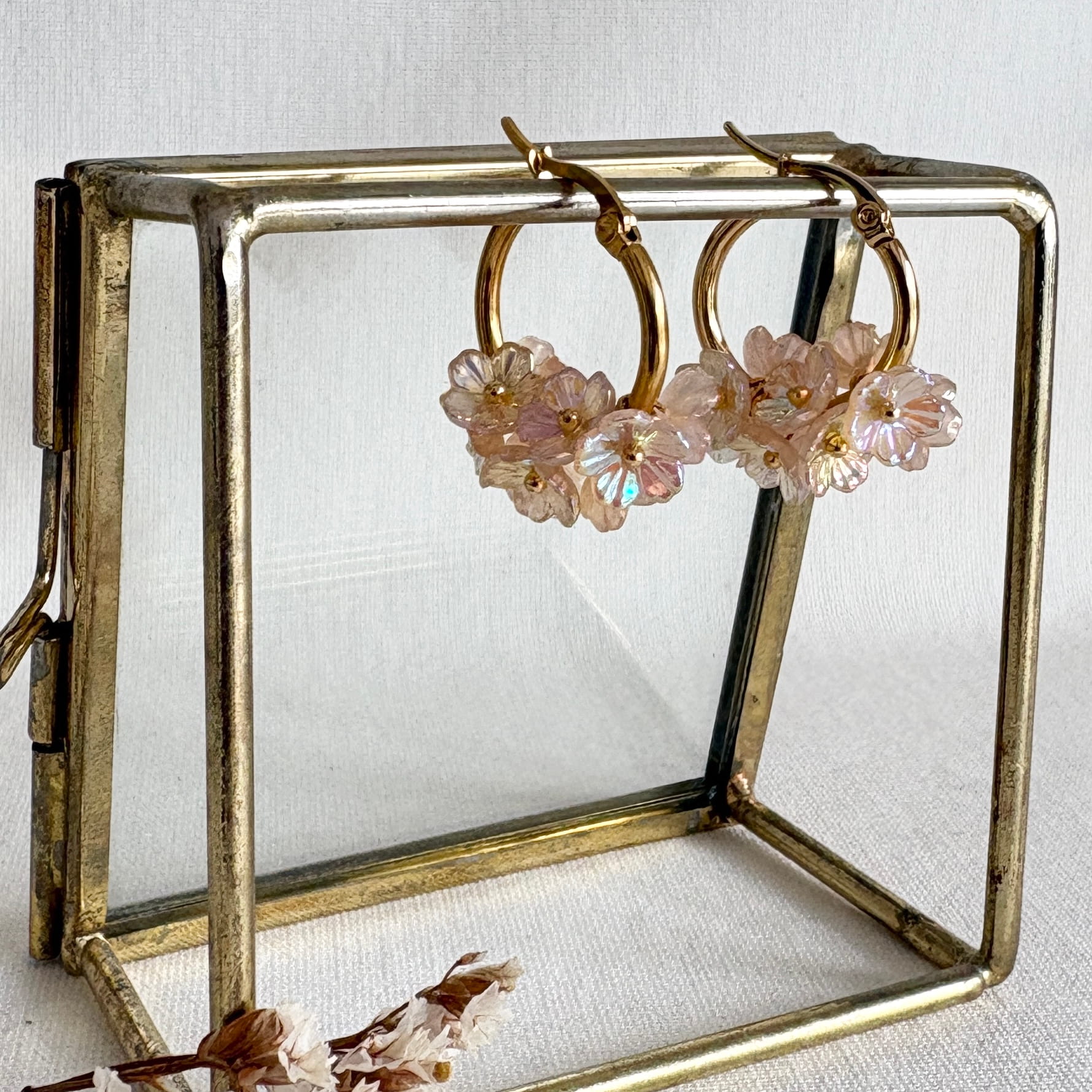 Naturel champagne beige oorbellen – RVS gouden creolen gevuld met naturel champagne beige bloemetjes