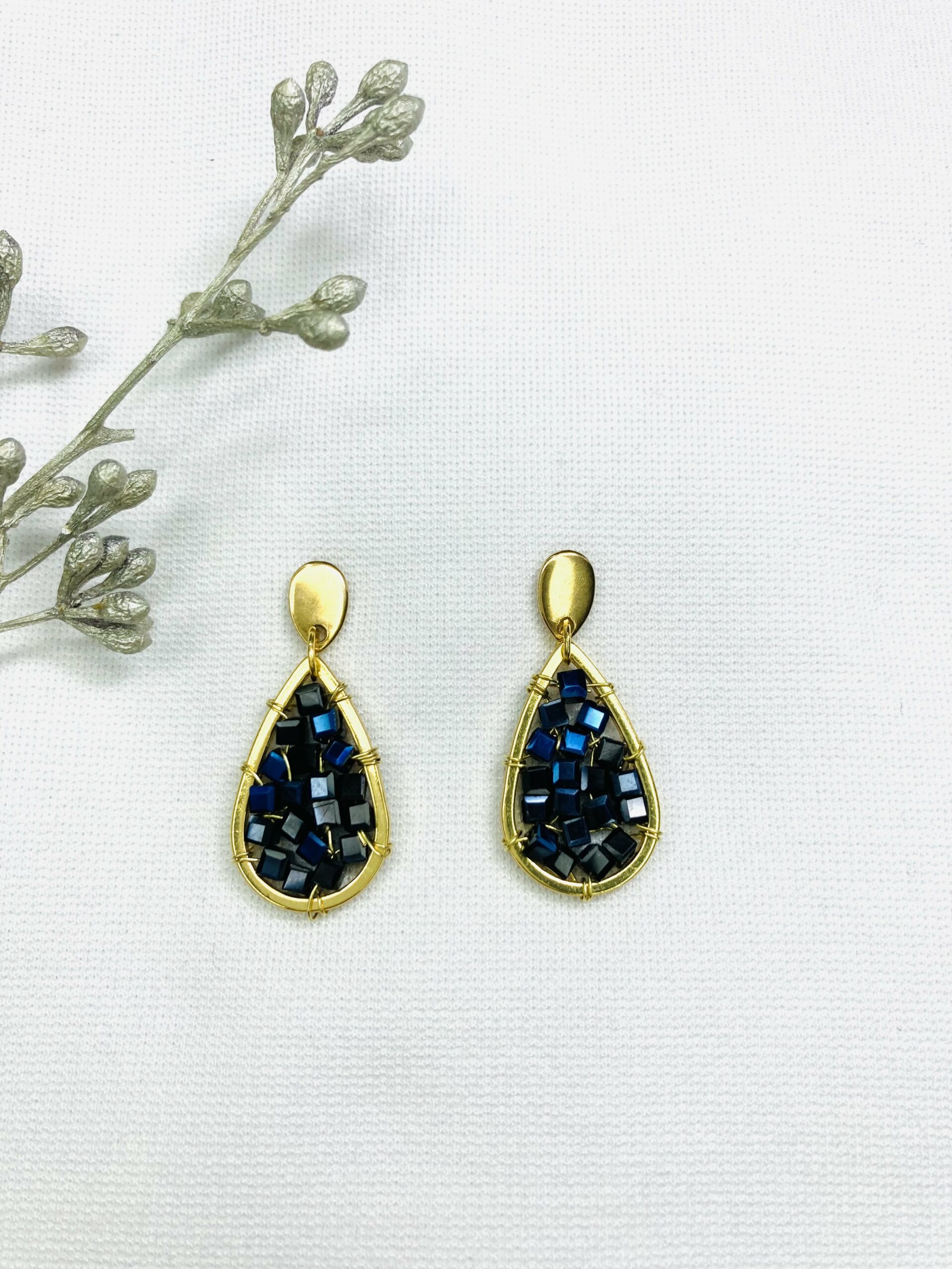 Oorbellen in druppelvorm vol geregen met donkerblauwe kubuskraaltjes