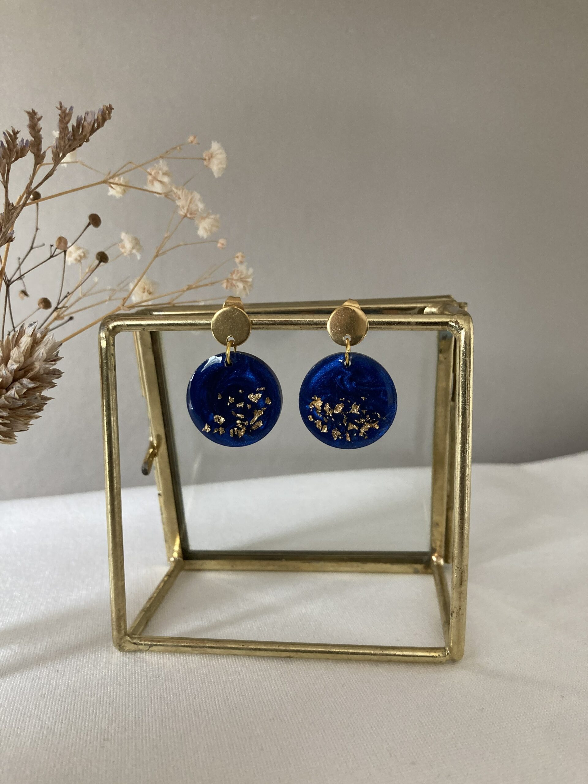Oorbellen van resin van een mooie roestbruine bronzen kleur met goudvlokjes in een ronde vorm aan gouden RVS oorstekers. De oorbellen zijn licht van gewicht en hebben een totale lengte van 2,5 cm.