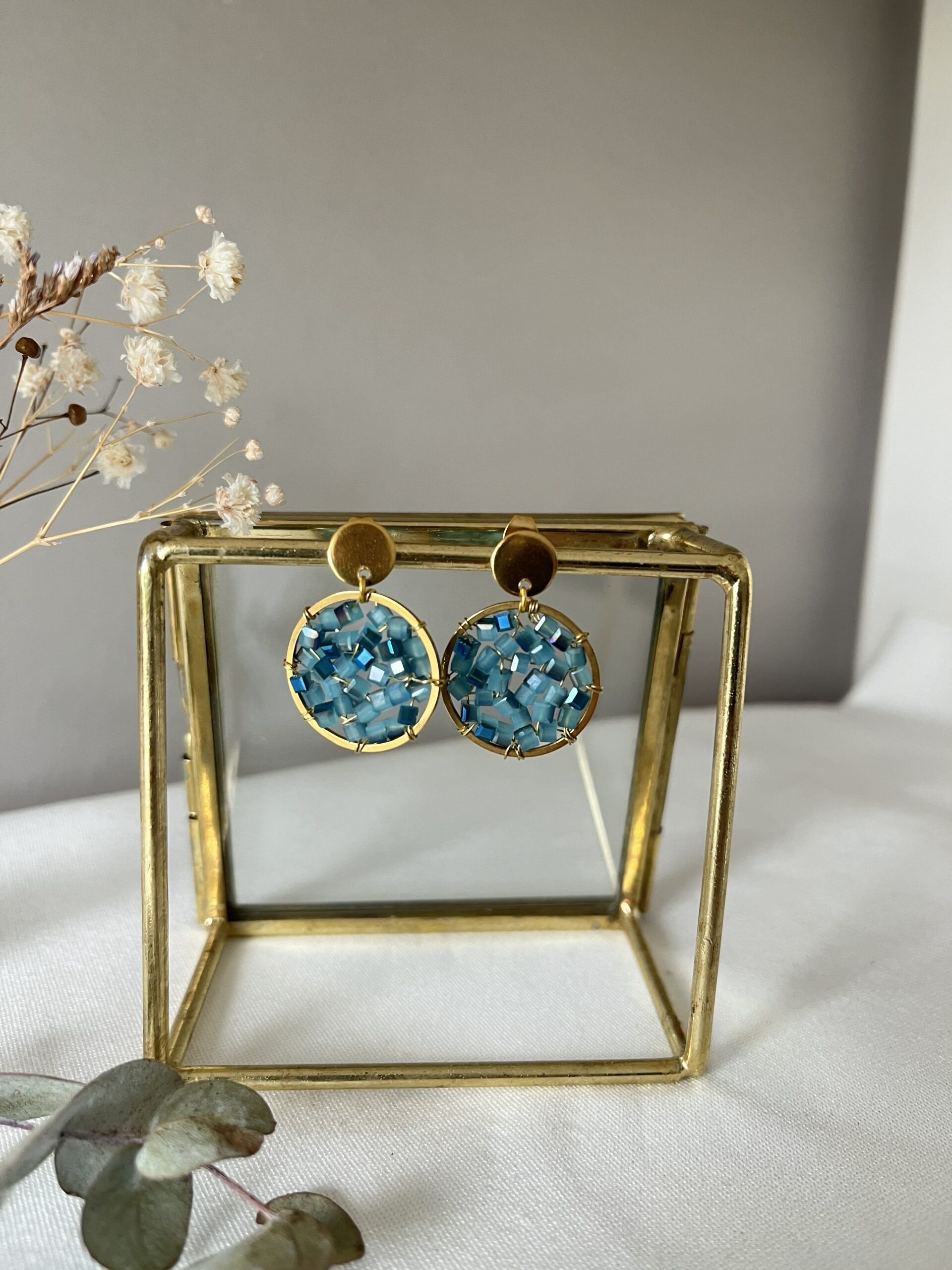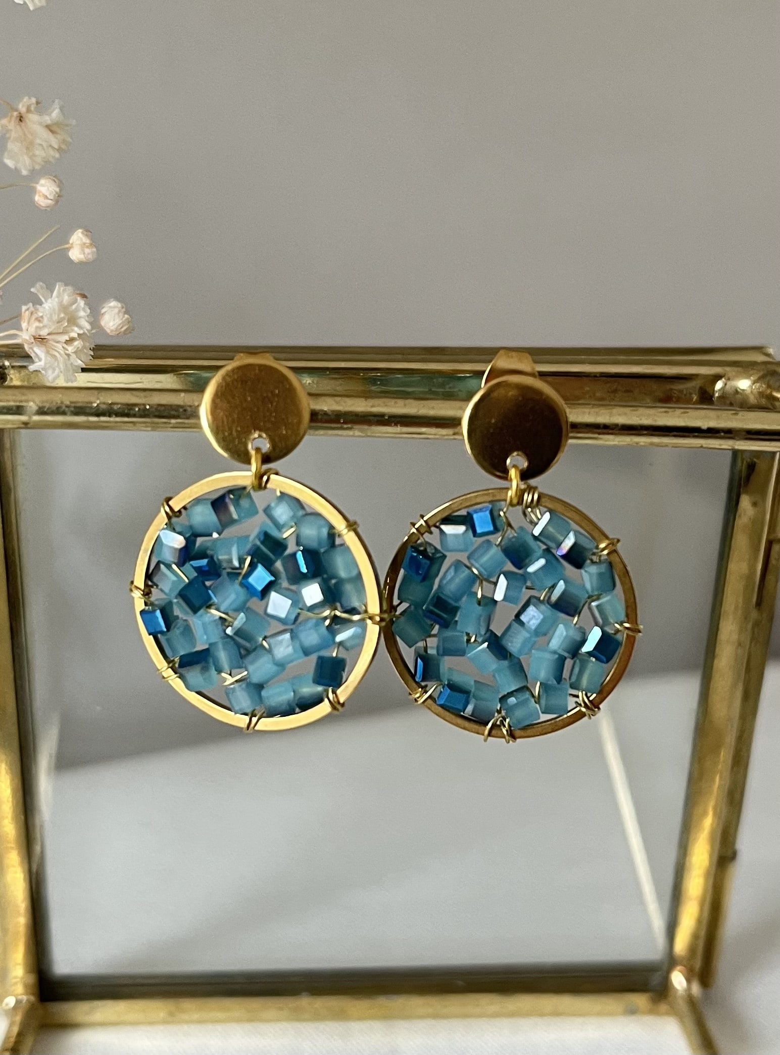 Jeansblauw! Zo’n gave kleur en die kom je niet vaak tegen bij sieraden. Maar wél deze oorbellen! De ronde hanger is vol geregen met mooie jeansblauwe kubuskraaltjes. De goudkleurig RVS oorstekers zijn ook rond. Lichtgewicht en een totale lengte van 3 cm.