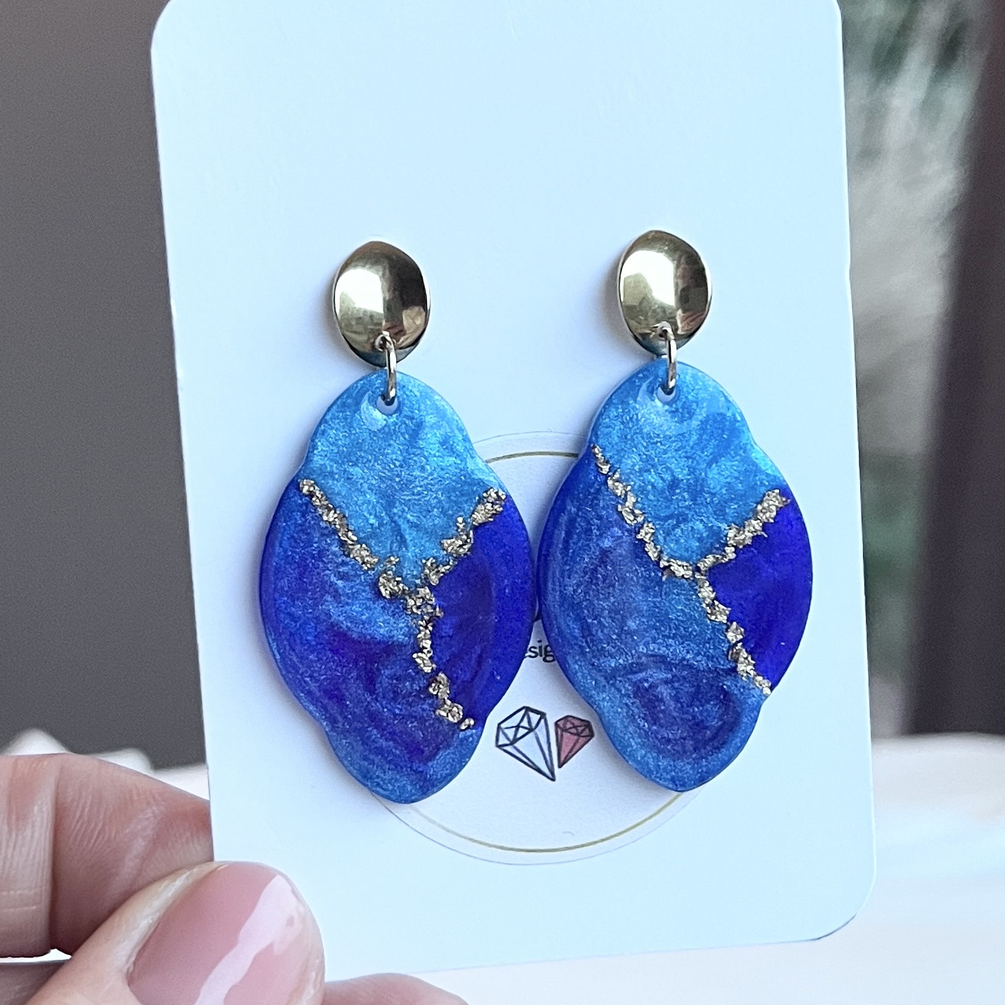 Blauwe oorbellen van resin in een ovale vorm aan gouden RVS oorstekers in bloemvorm. De oorbellen zijn licht van gewicht en hebben een totale lengte van 3,6 cm.