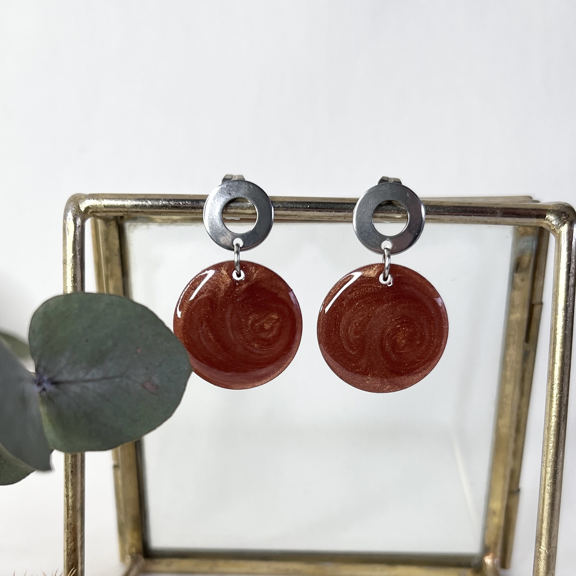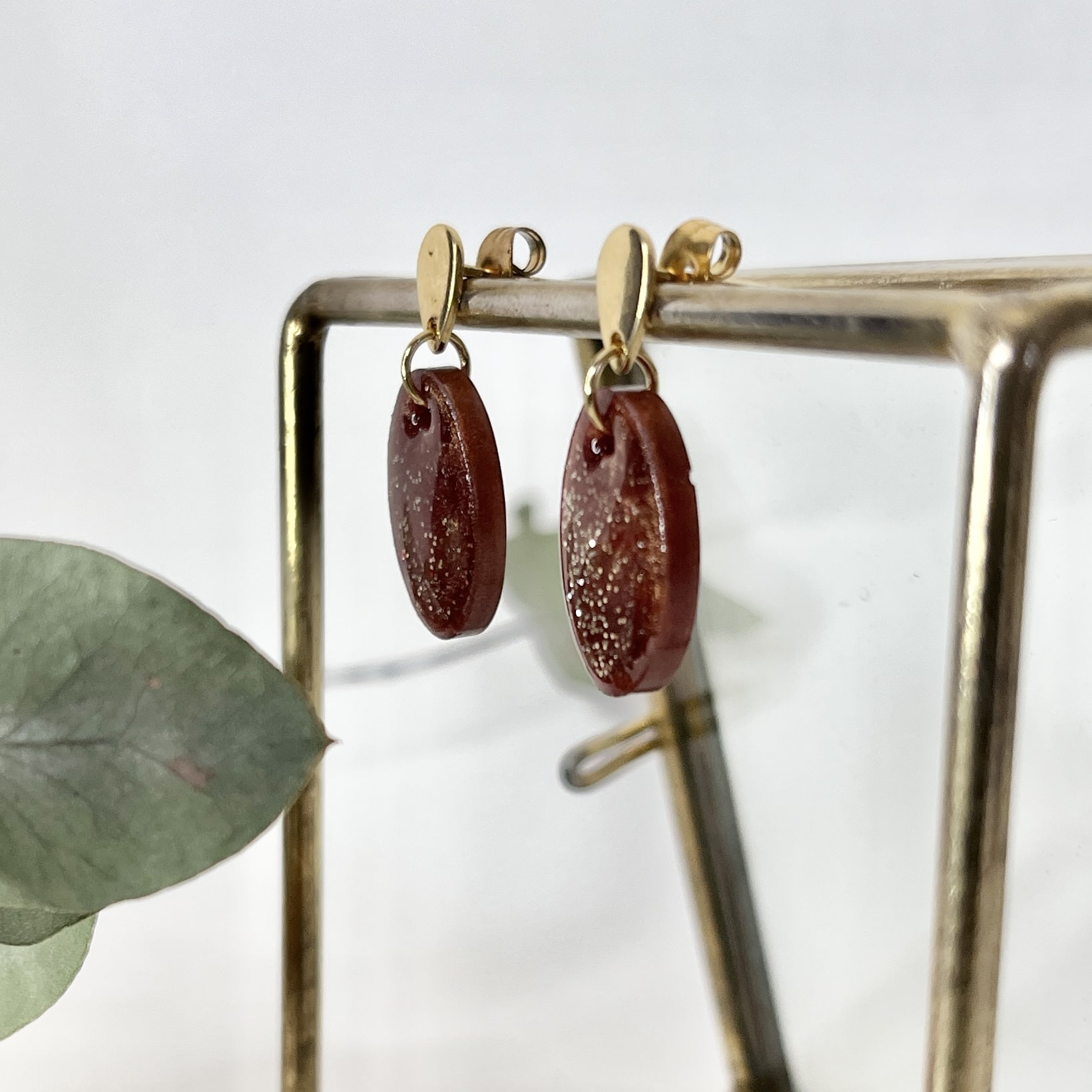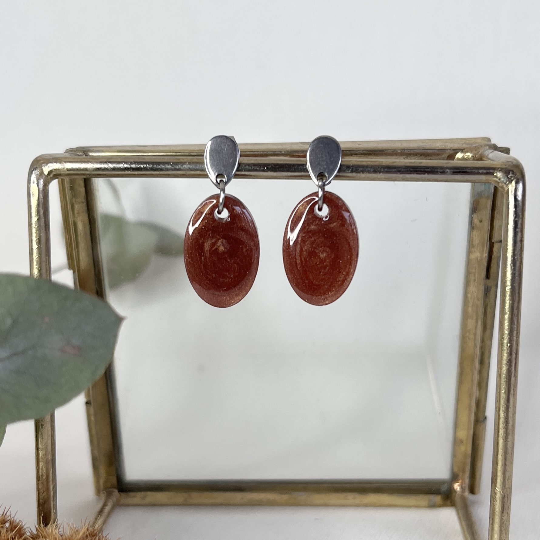Mooi ovaal en wat een kléur! Een mooie warme glanzende bruine kleur. Deze bruine oorbellen met glittertjes van resin aan gouden RVS oorstekers zijn subtiel ovaal van vorm. De oorbellen zijn licht van gewicht en hebben een leuke lengte van 2,5 cm.
