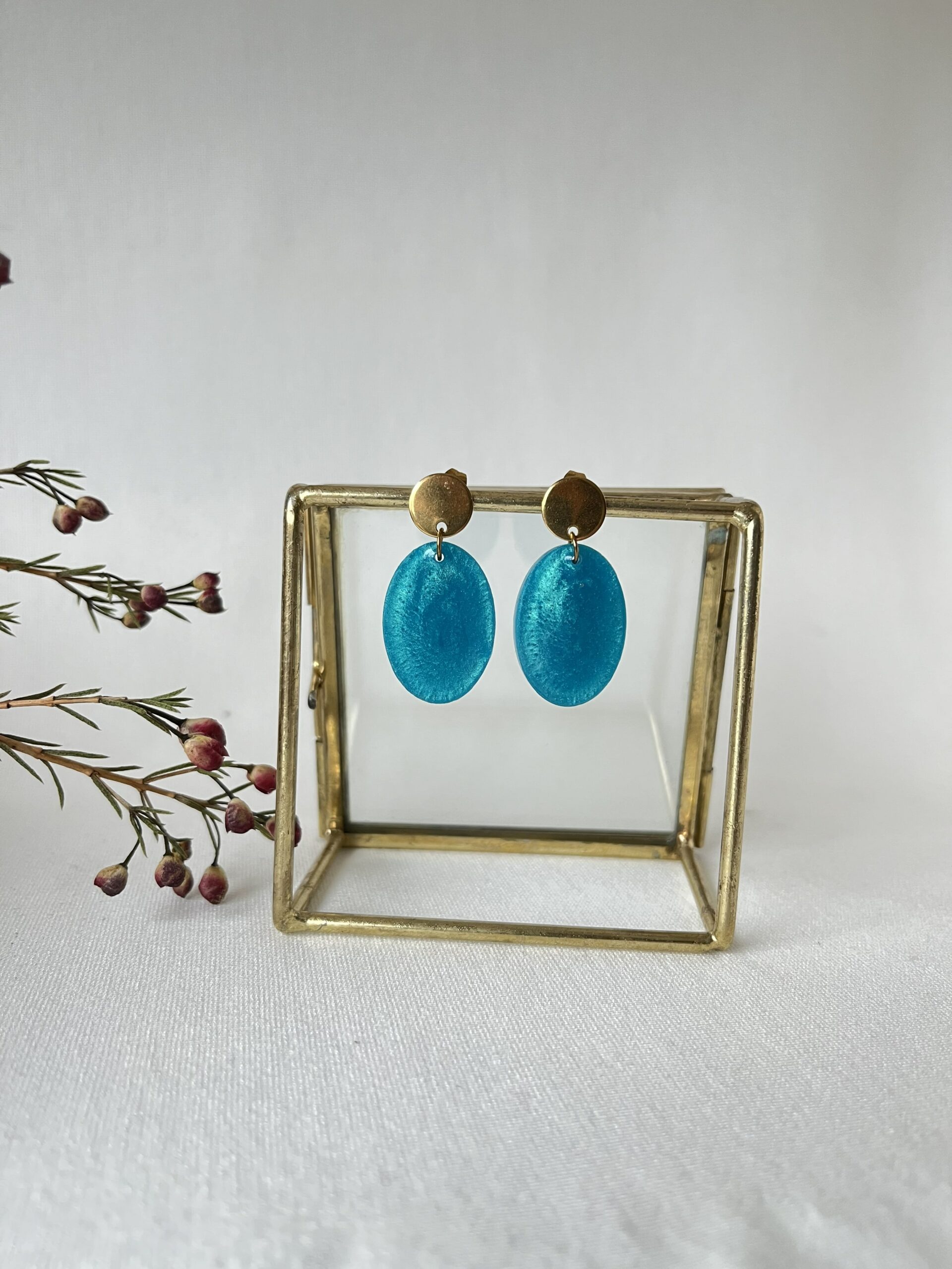 Oorbellen van resin van een mooie petrol kleur in een ovale vorm aan ronde gouden RVS oorstekers. De oorbellen zijn licht van gewicht en hebben een totale lengte van 4 cm.