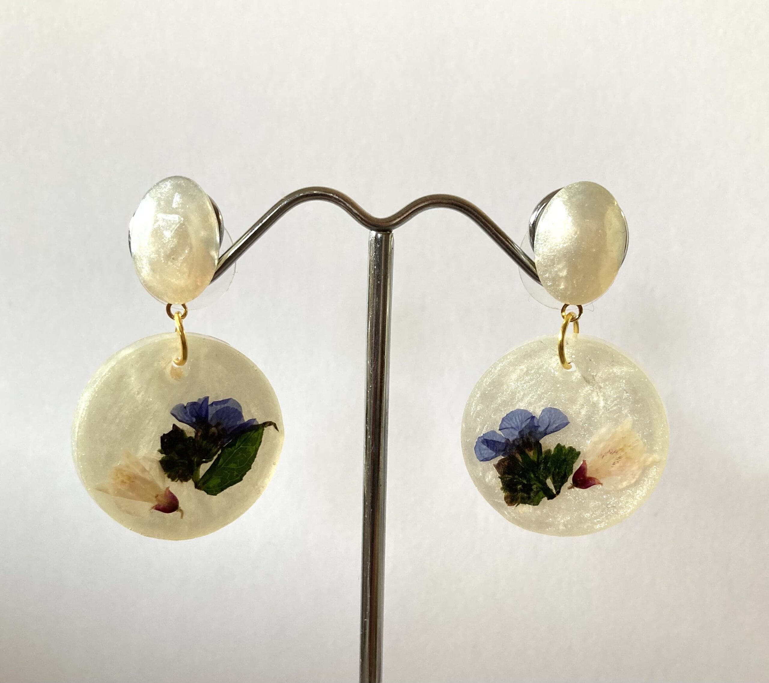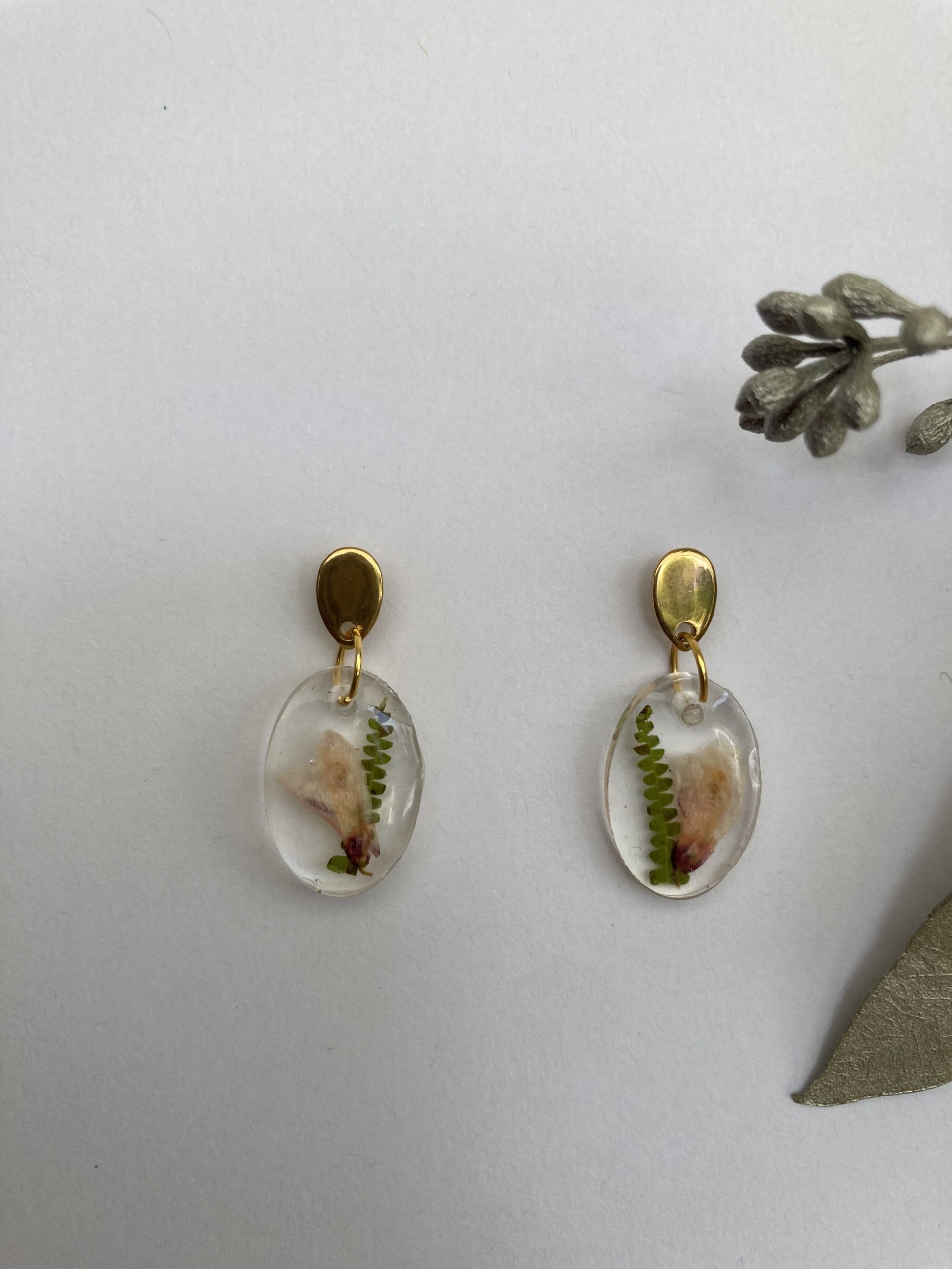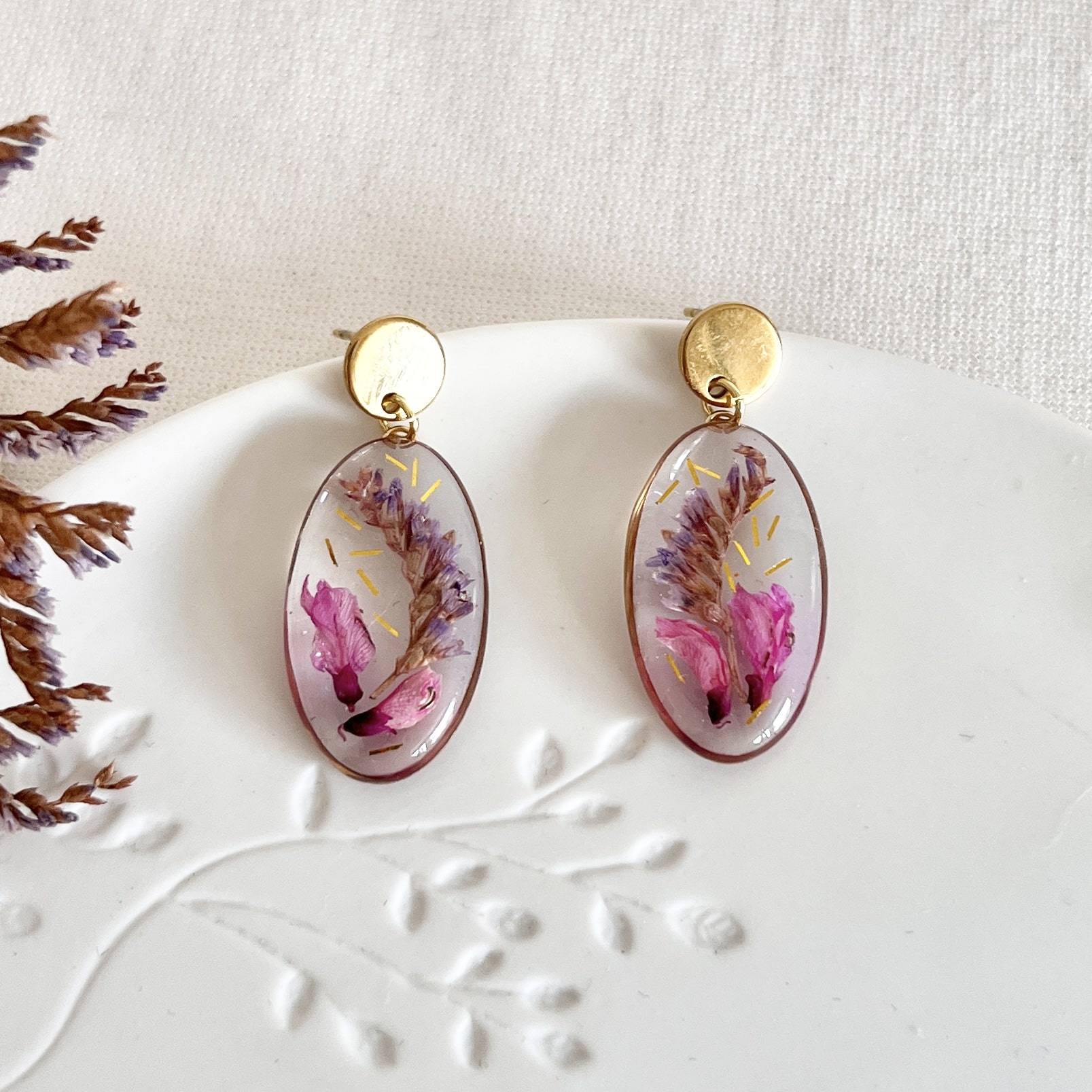 Lieve ovale oorbellen van blanke resin waarin lila en roze bloemen verwerkt zijn. De ovale gouden RVS ringen hangen aan gouden RVS oorstekers. De oorbellen zijn licht van gewicht en hebben een totale lengte van 3,5 cm.
