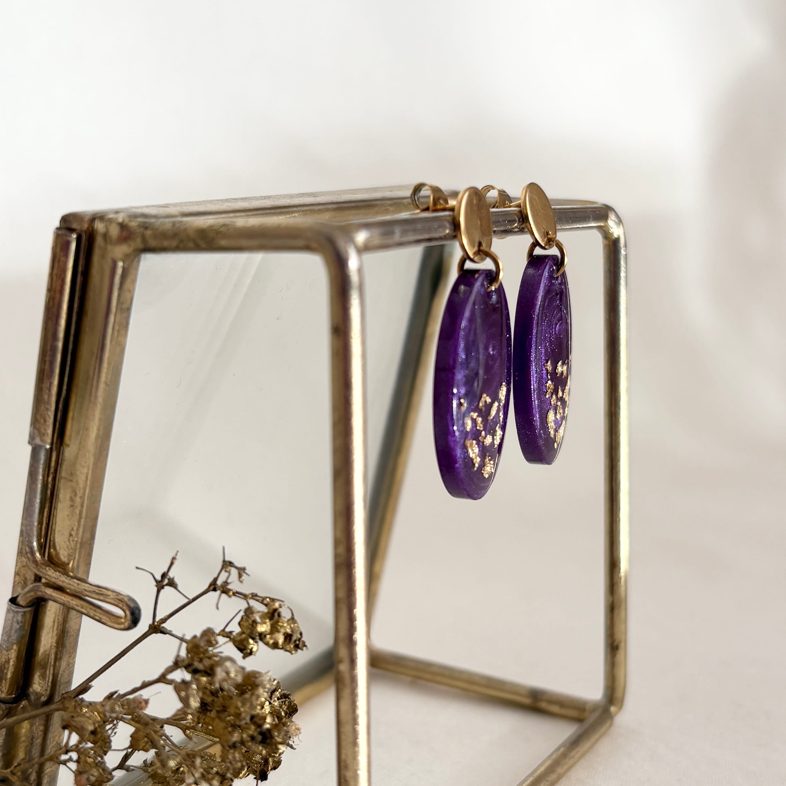 Ovale paarse oorbellen met goudvlokjes aan RVS gouden oorstekers. Ze zijn licht van gewicht en de lengte is 3,5 cm.