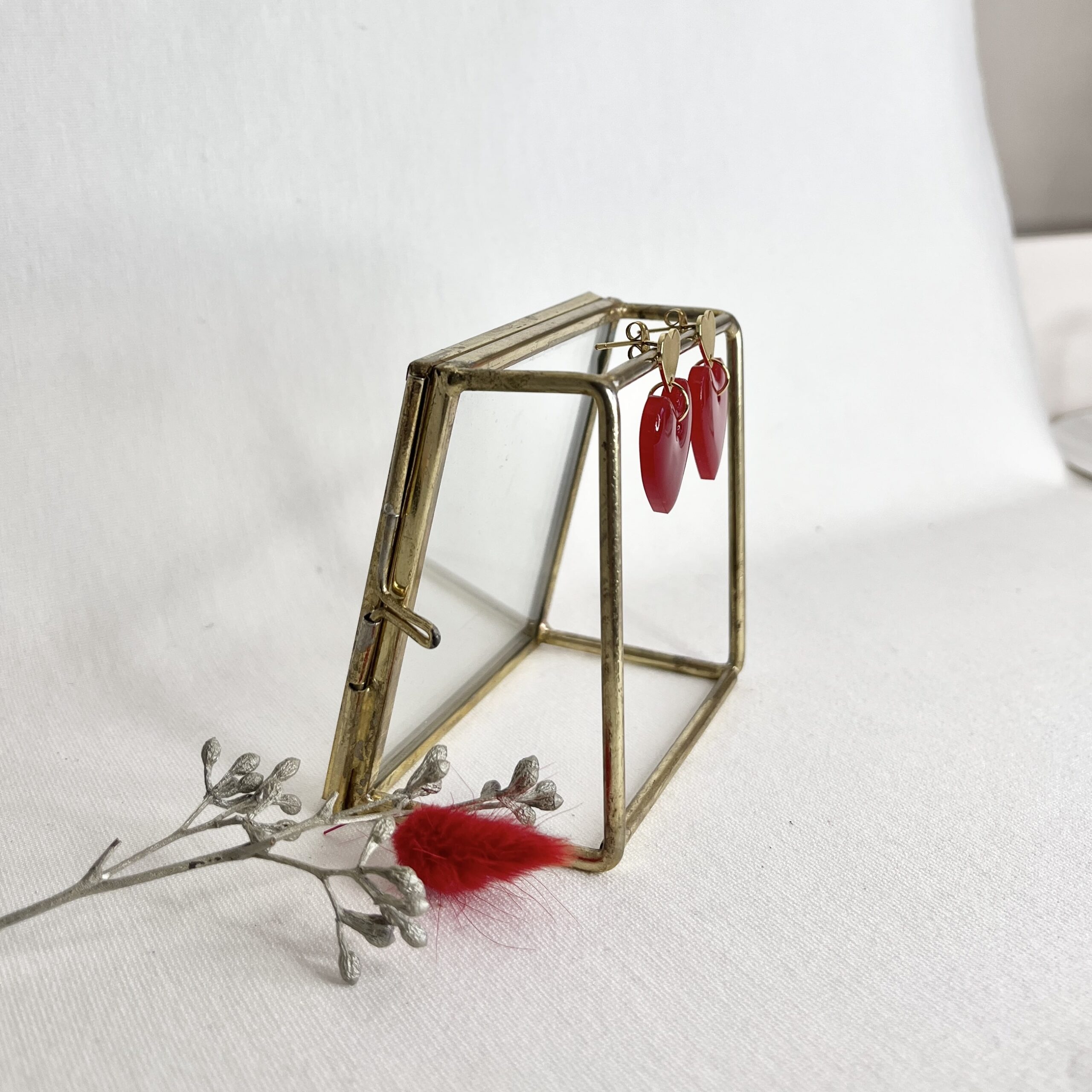 Leuke rode oorbellen in de vorm van een hartje van resin aan een goudkleurig hartje oorsteker. Licht van gewicht en lengte is 2,5 cm.