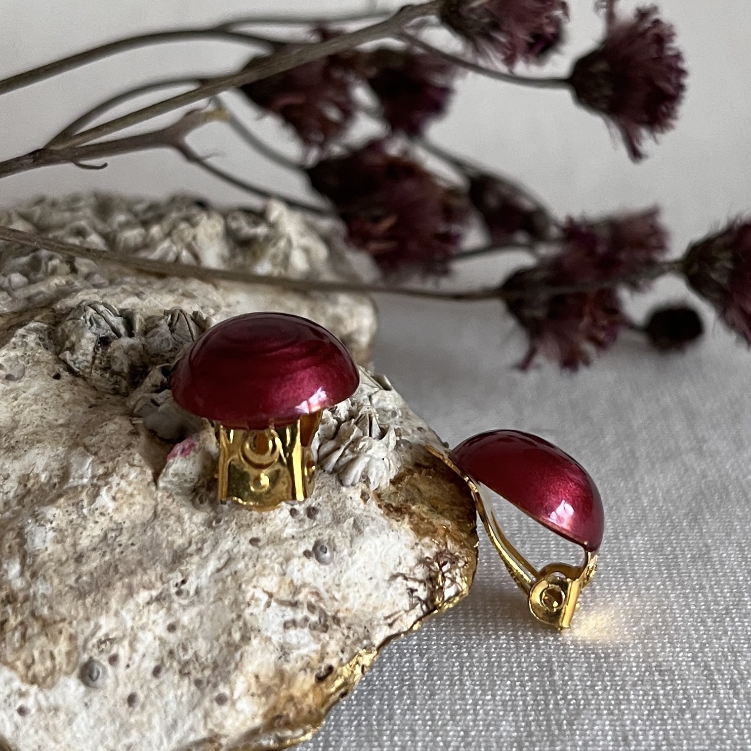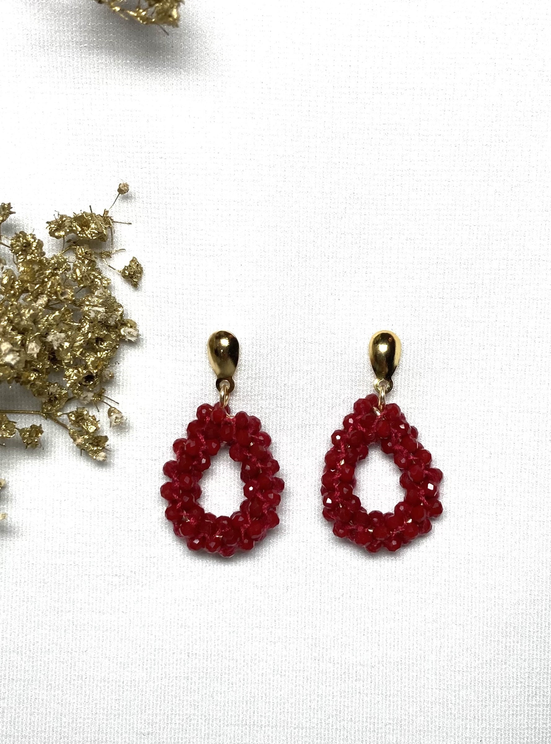 Rode oorbellen in druppelvorm vol geregen met warmrode kubuskraaltjes. Lichtgewicht met een lengte van 2,8 cm.