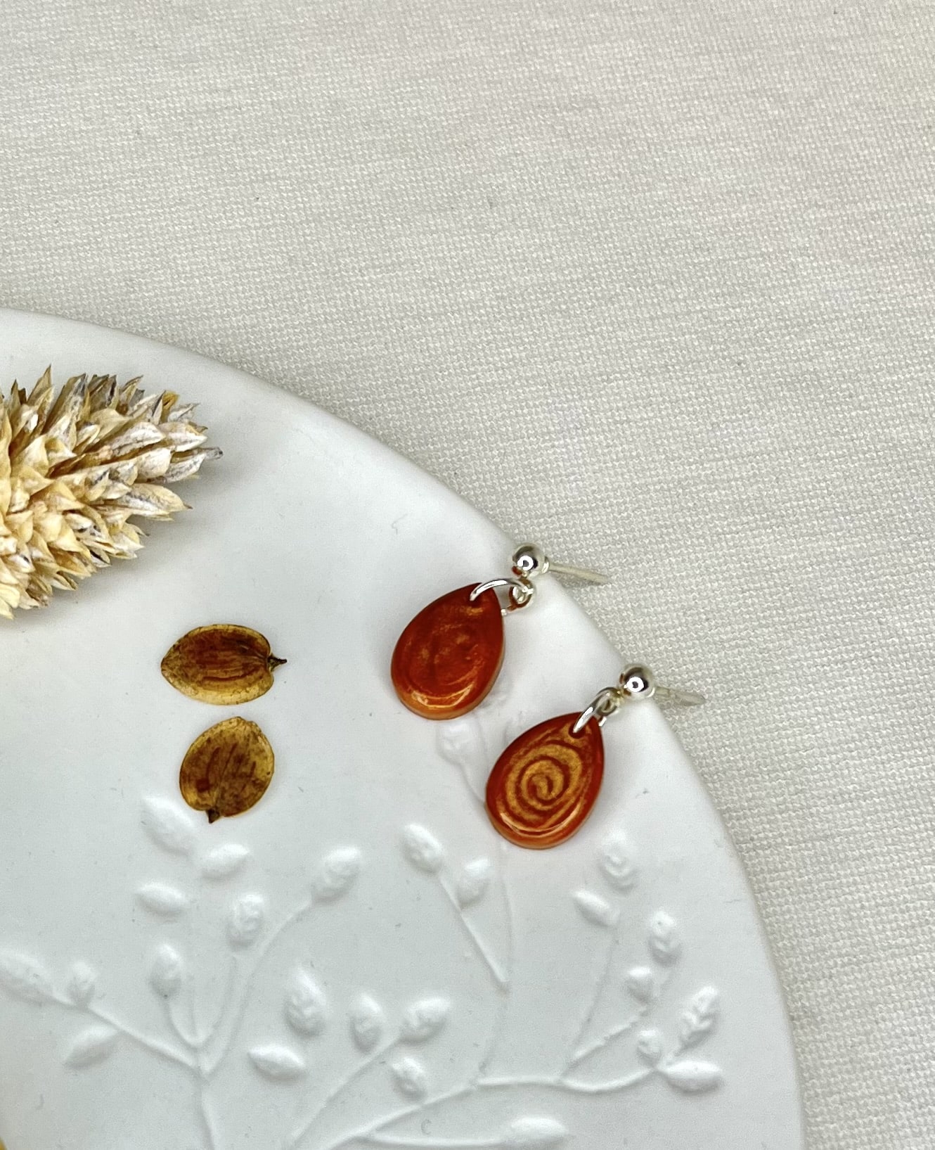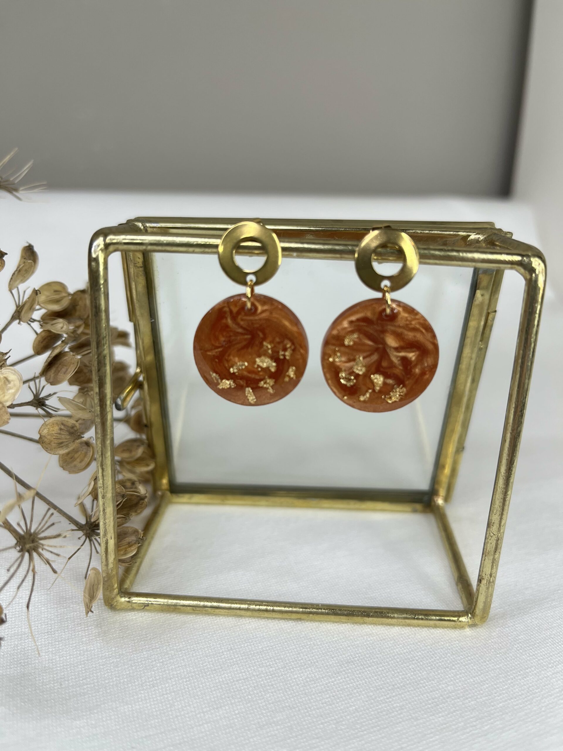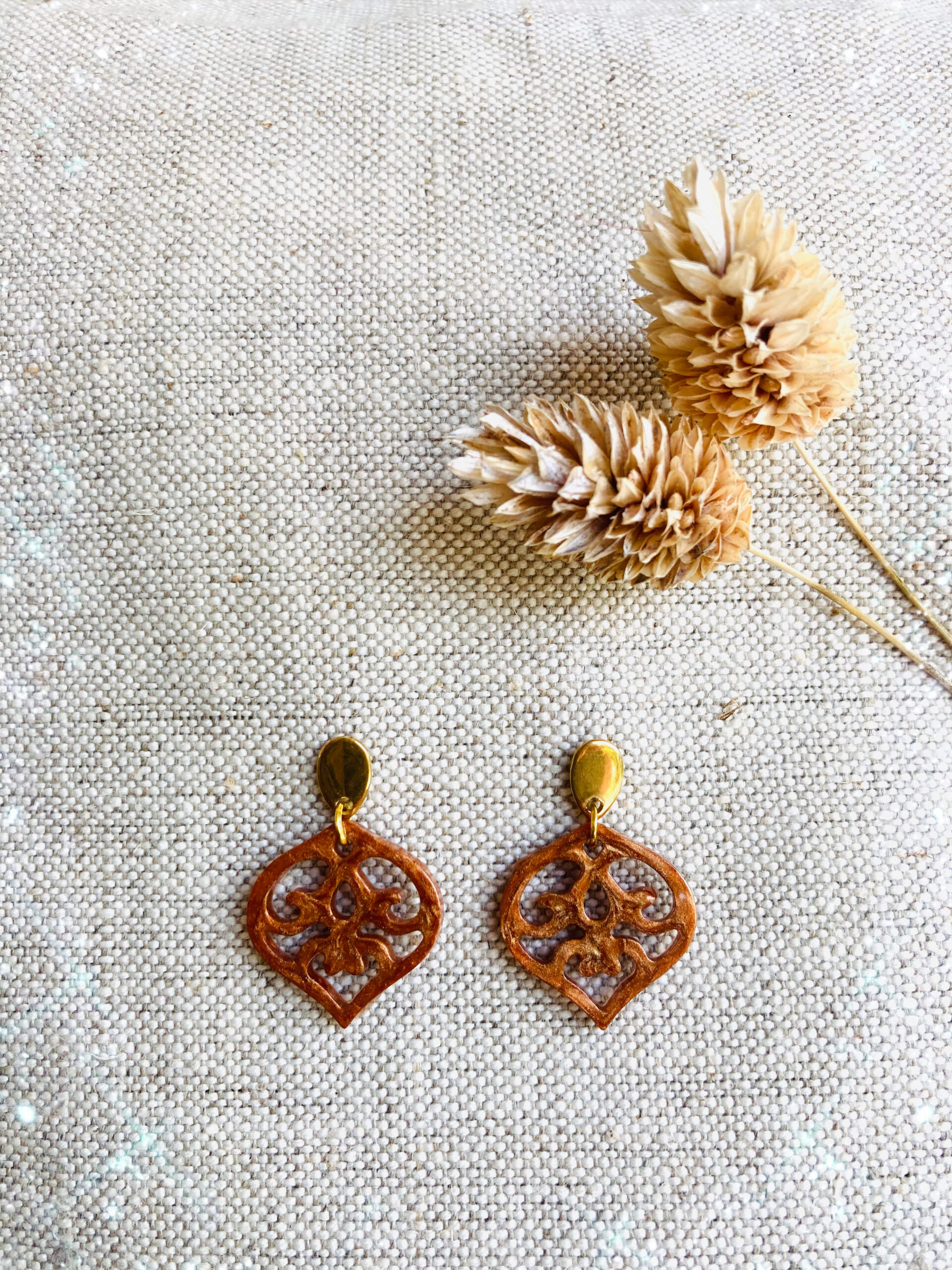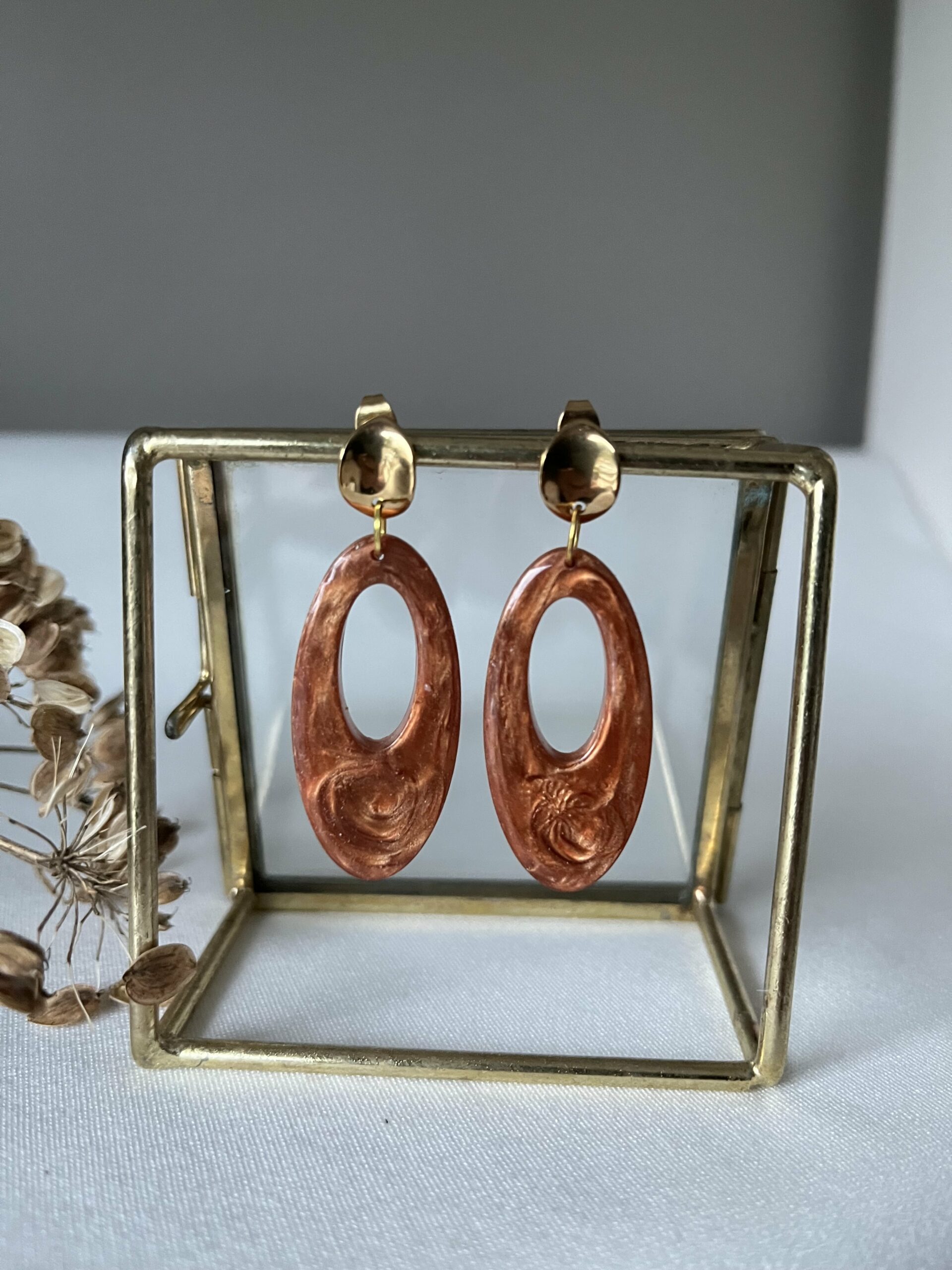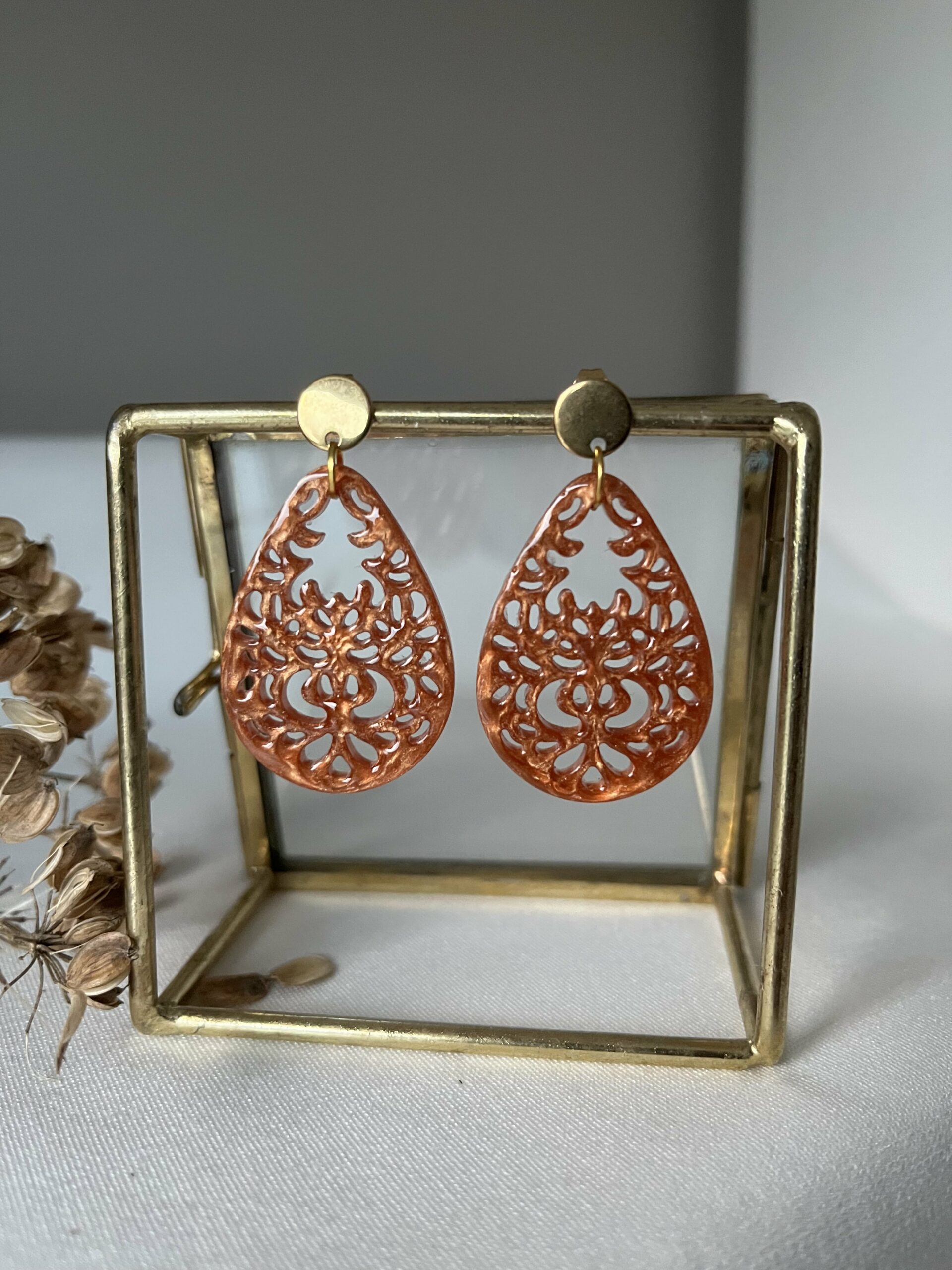 Leuke roestbruine oorbellen van resin met gouden RVS oorstekers. De filigraan hangers lijken net van kant gemaakt. De oorbellen zijn licht van gewicht en hebben een totale lengte van 5 cm.