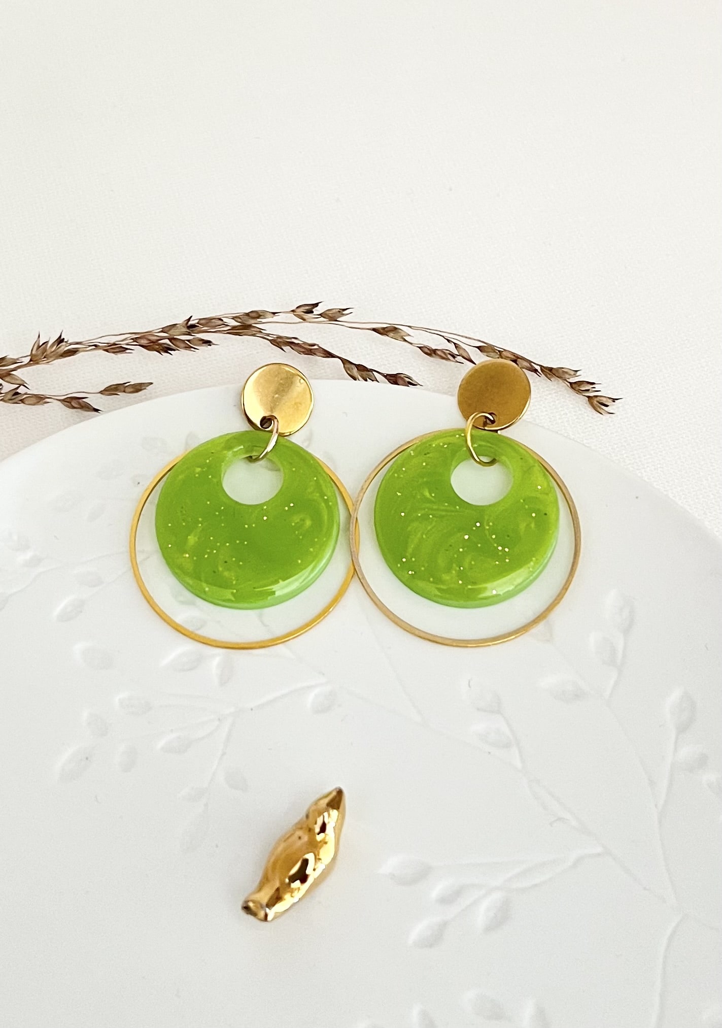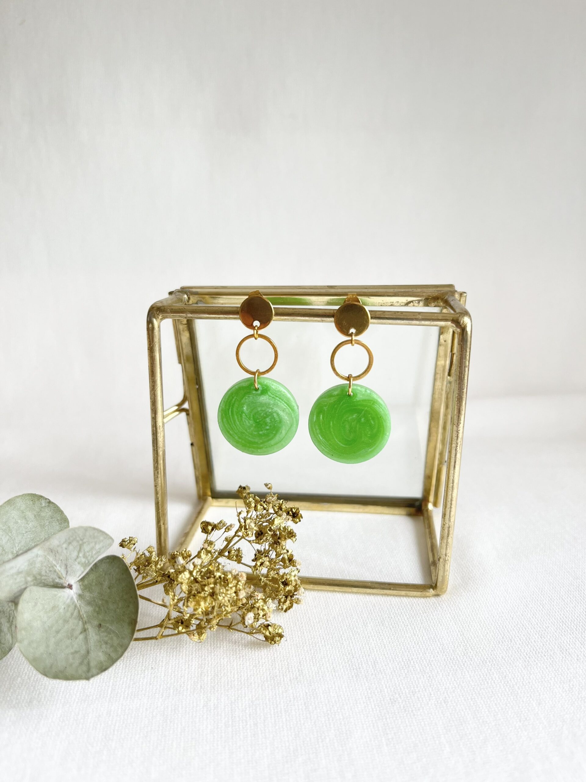 Hippe ronde appeltjes- of lente groene oorbellen van resin aan een RVS ringetje. Verkrijgbaar in goud- en zilverkleur. De oorbellen zijn licht van gewicht en hebben een totale lengte van 4 cm.