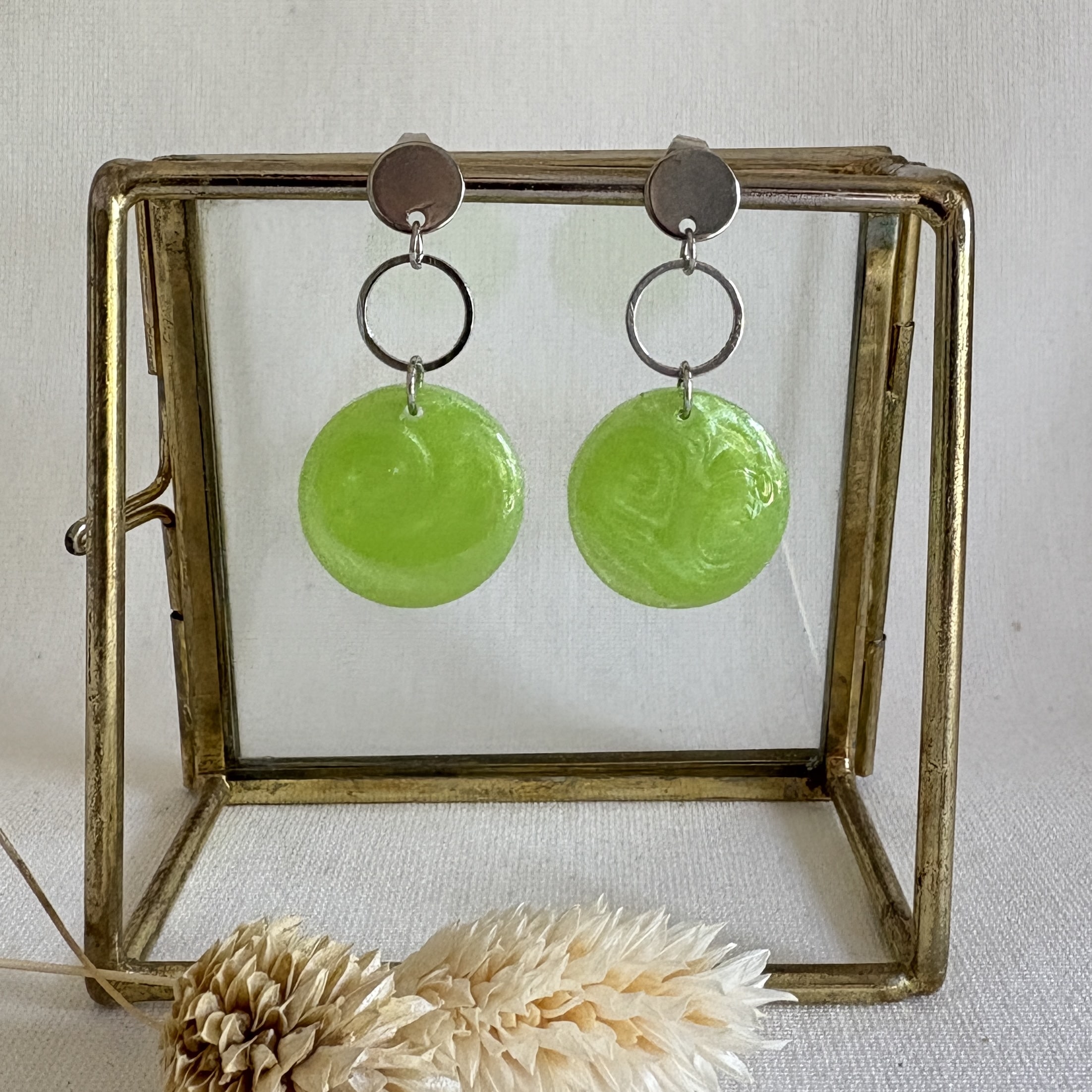 Hippe ronde appeltjes- of lente groene oorbellen van resin aan een RVS ringetje