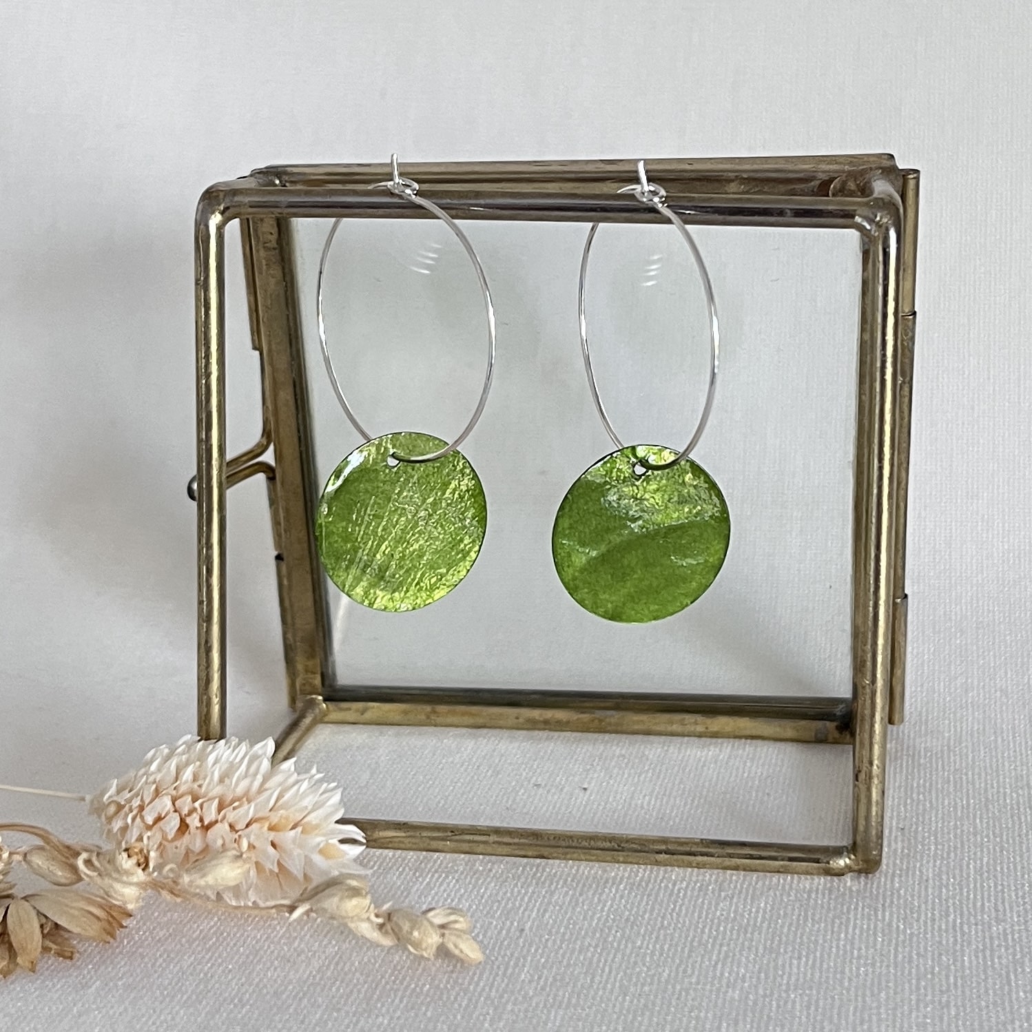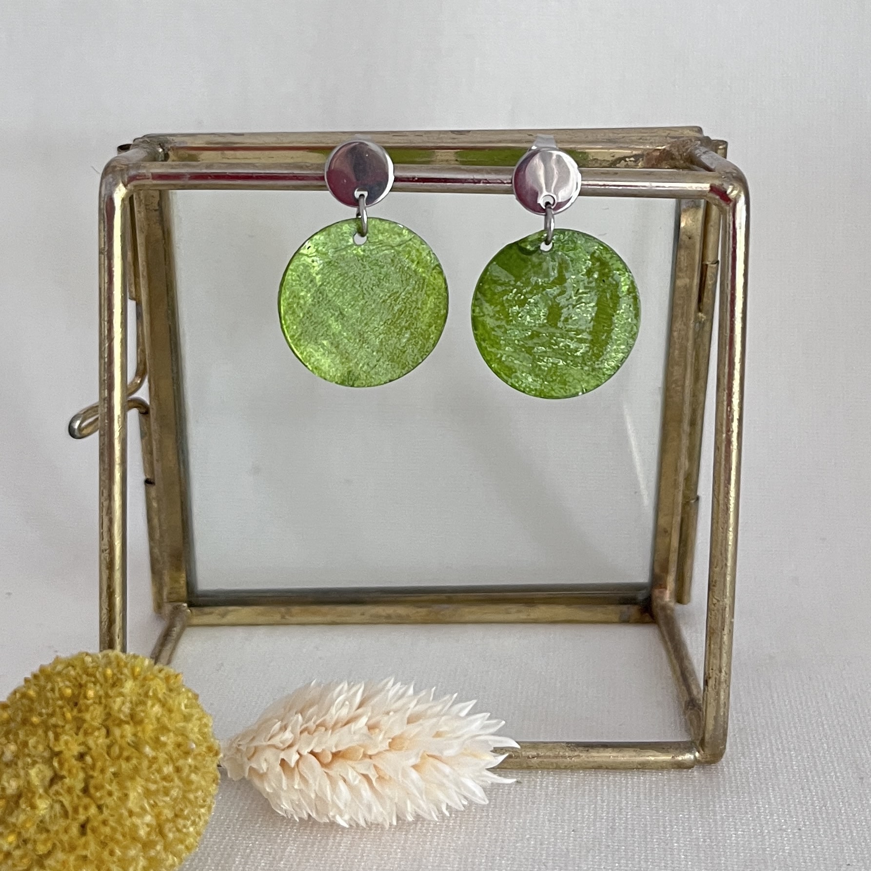Deze oorbellen passen perfect bij de leuke zomerjurkjes van nu.  Fris groen van kleur, rond en strak van resin aan gouden of zilveren RVS ringetjes en oorstekers. Ze zijn licht van gewicht en de lengte is 4 cm.