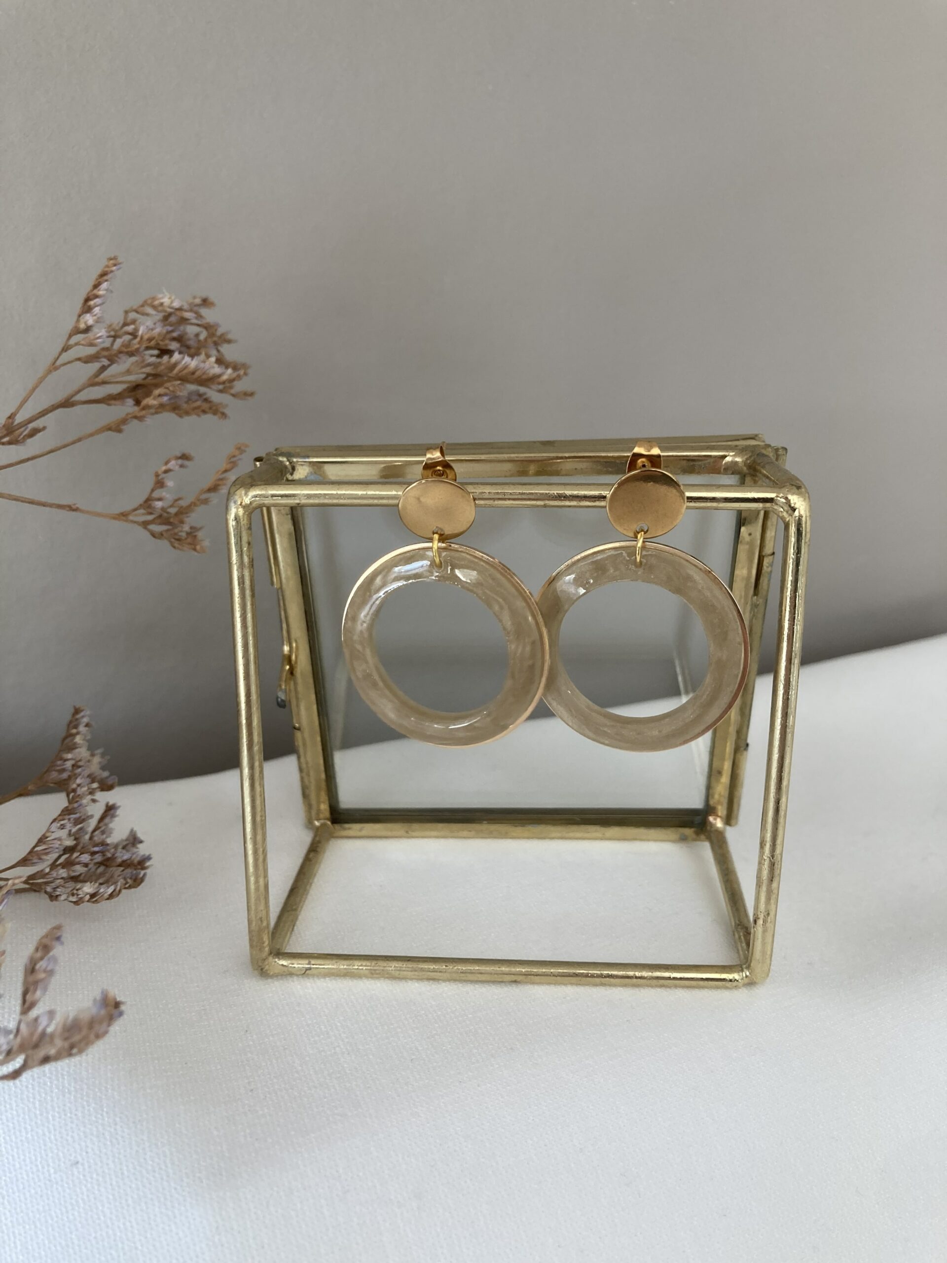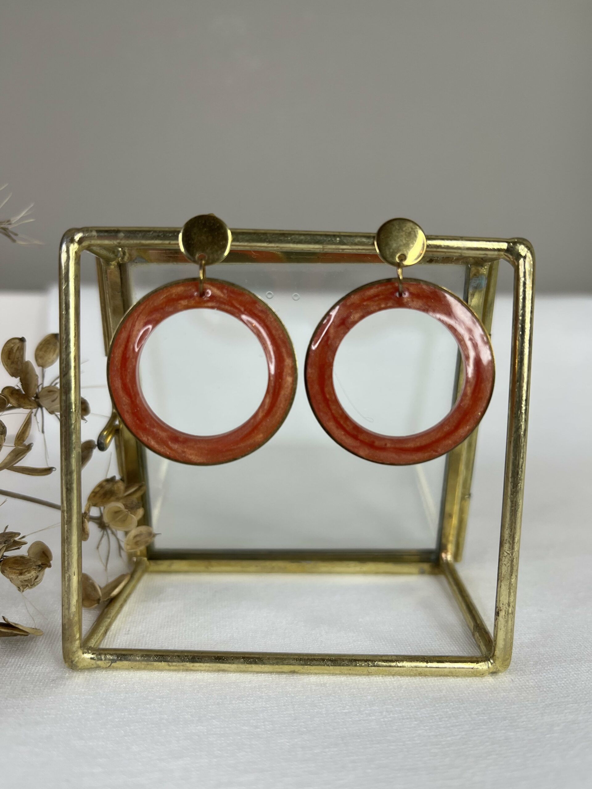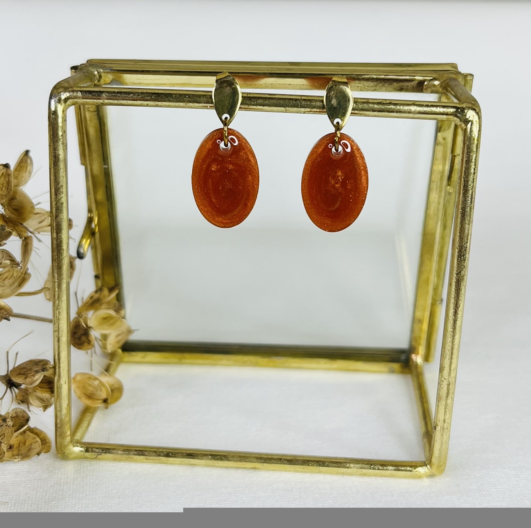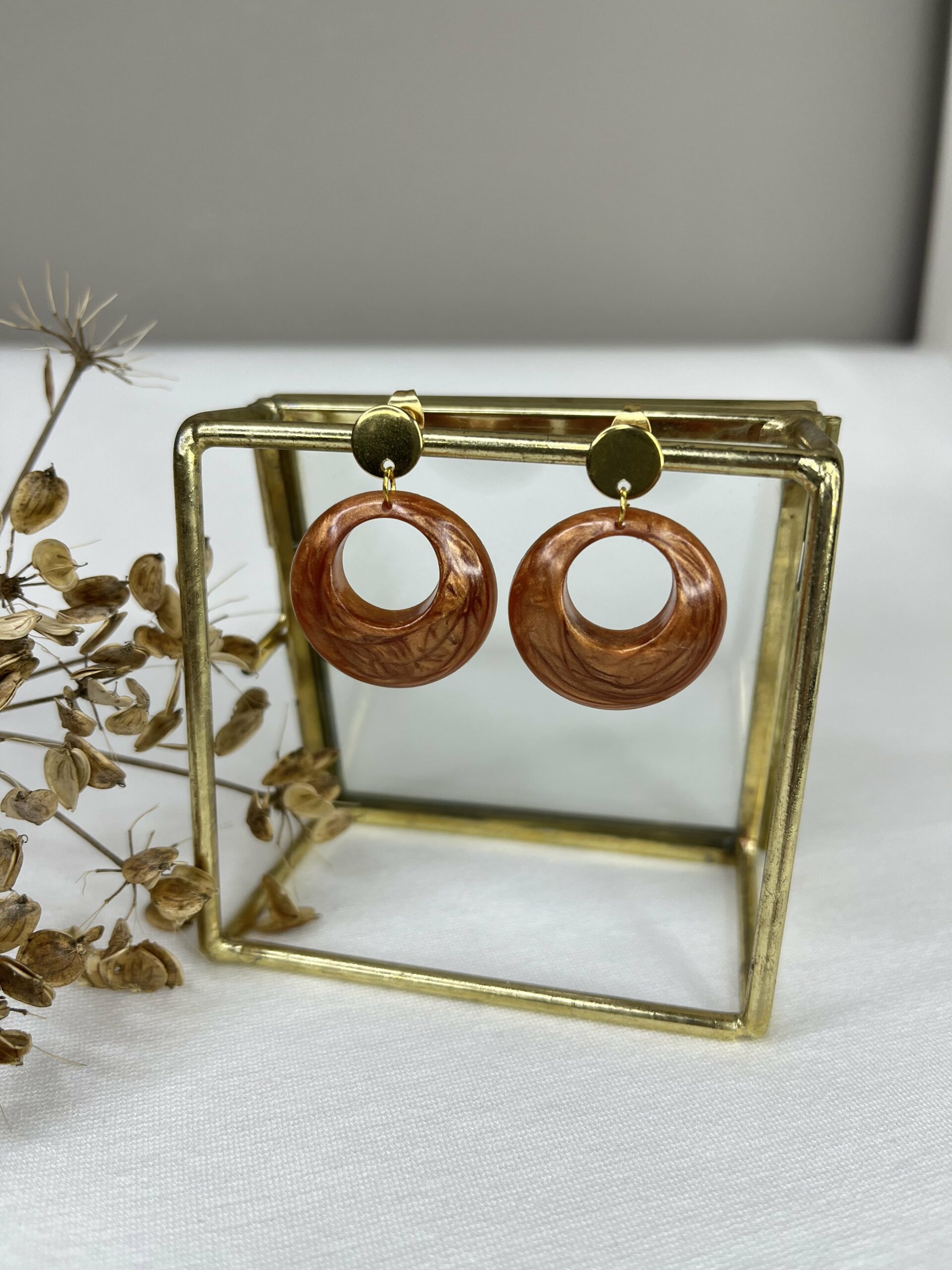 Als je deze ronde en strakke oorbellen bekijkt, zie je de glanzende roestbruine kleur in verschillende schakeringen terugkomen. De goudkleurige RVS ring omarmt de mooie glans. Gemaakt van resin, met gouden RVS oorstekers. Daarom blijven ze licht van gewicht. Ze hebben een totale lengte van 4 cm.