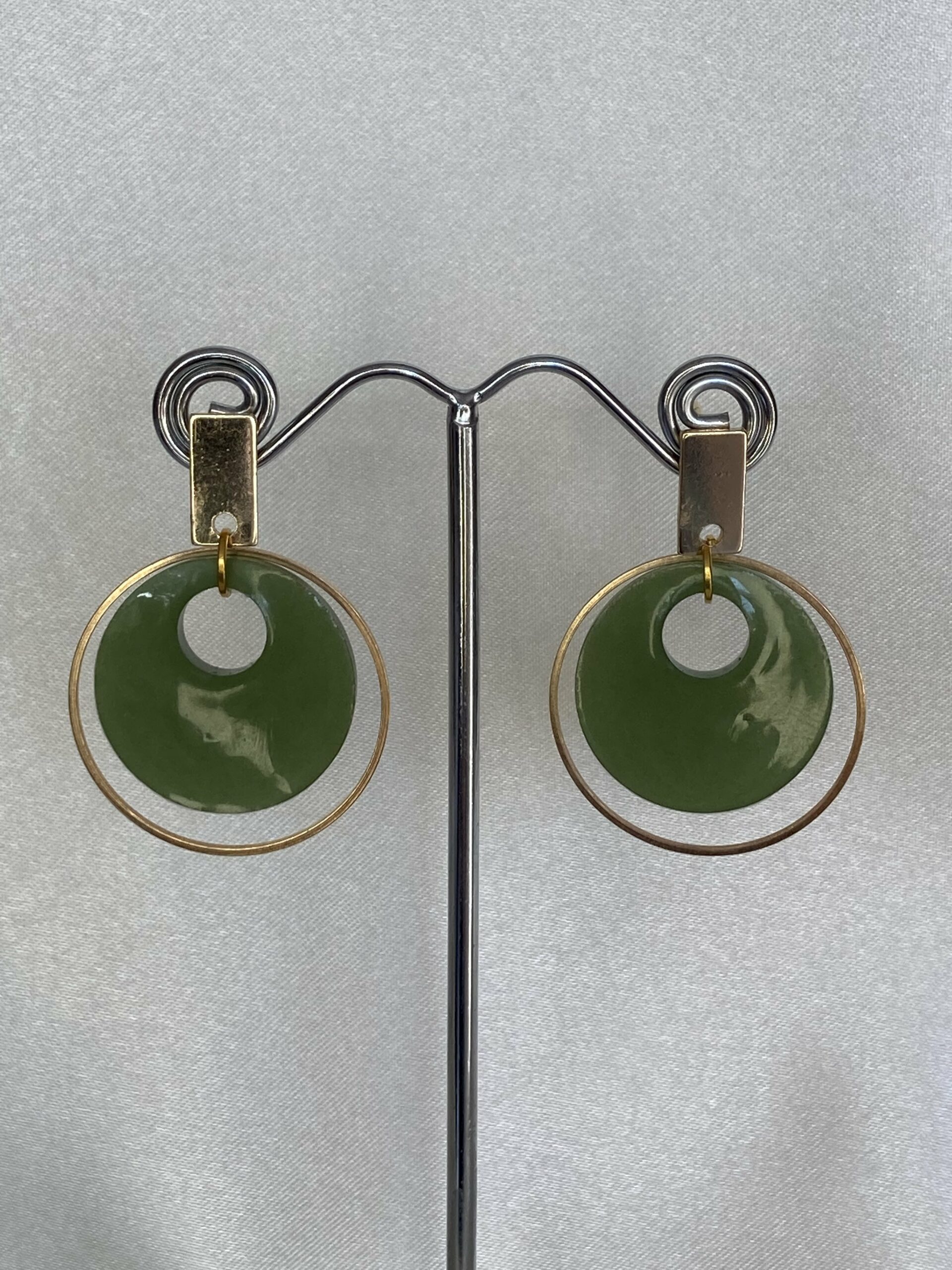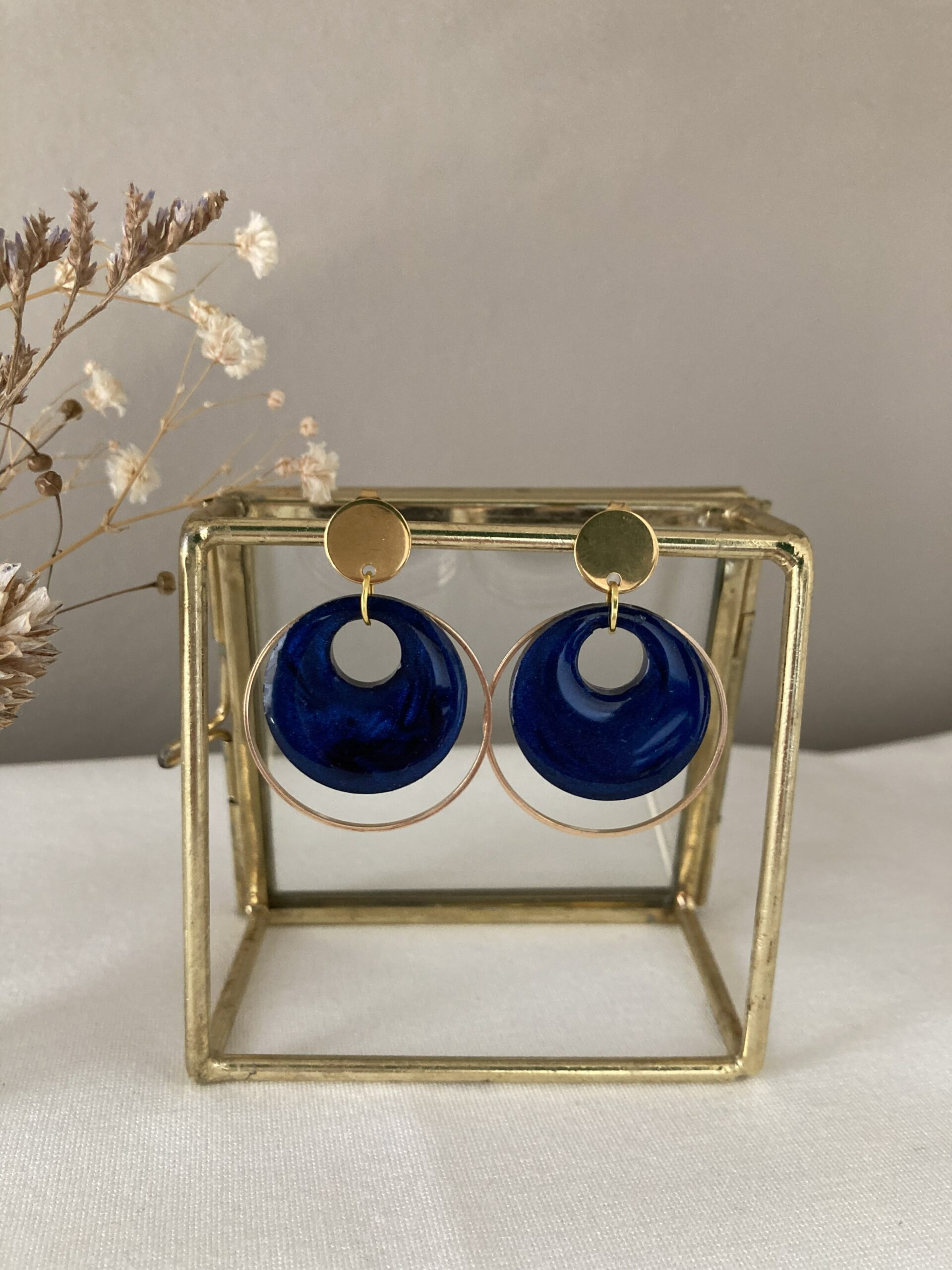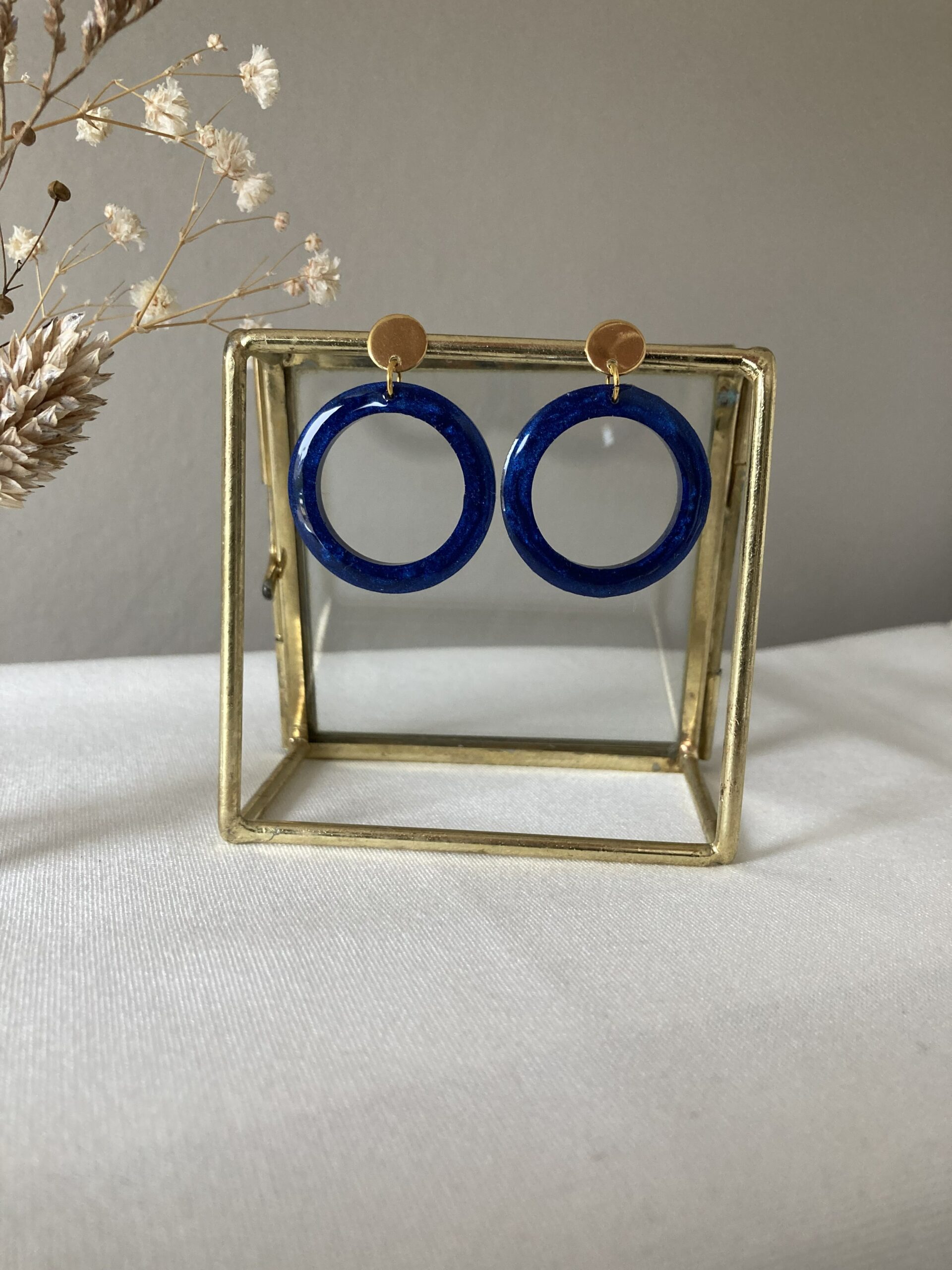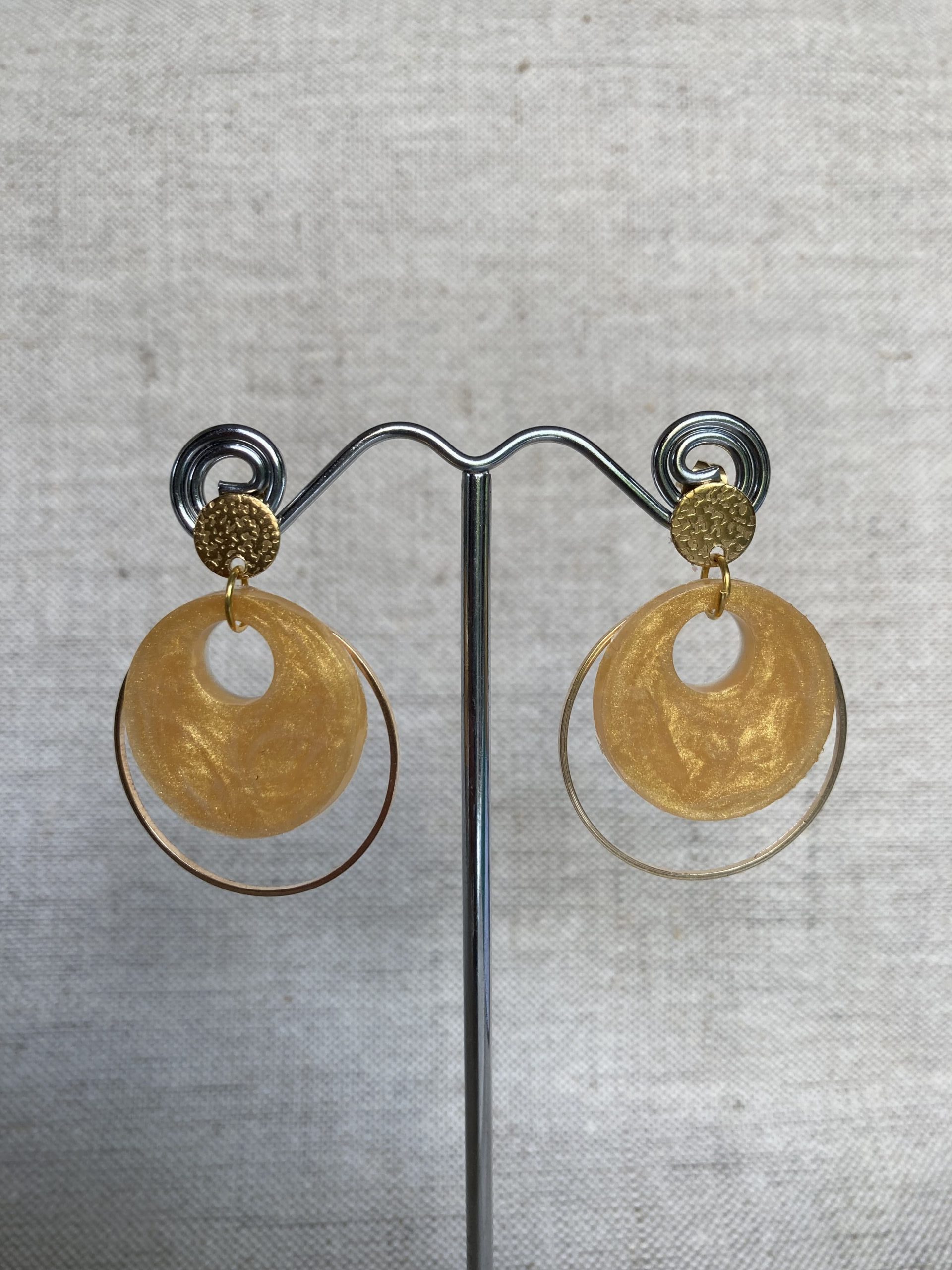 Als je deze ronde en strakke oorbellen bekijkt, zie je de glanzende roestbruine kleur in verschillende schakeringen terugkomen. De goudkleurige RVS ring omarmt de mooie glans. Gemaakt van resin, met gouden RVS oorstekers. Daarom blijven ze licht van gewicht. Ze hebben een totale lengte van 4 cm.