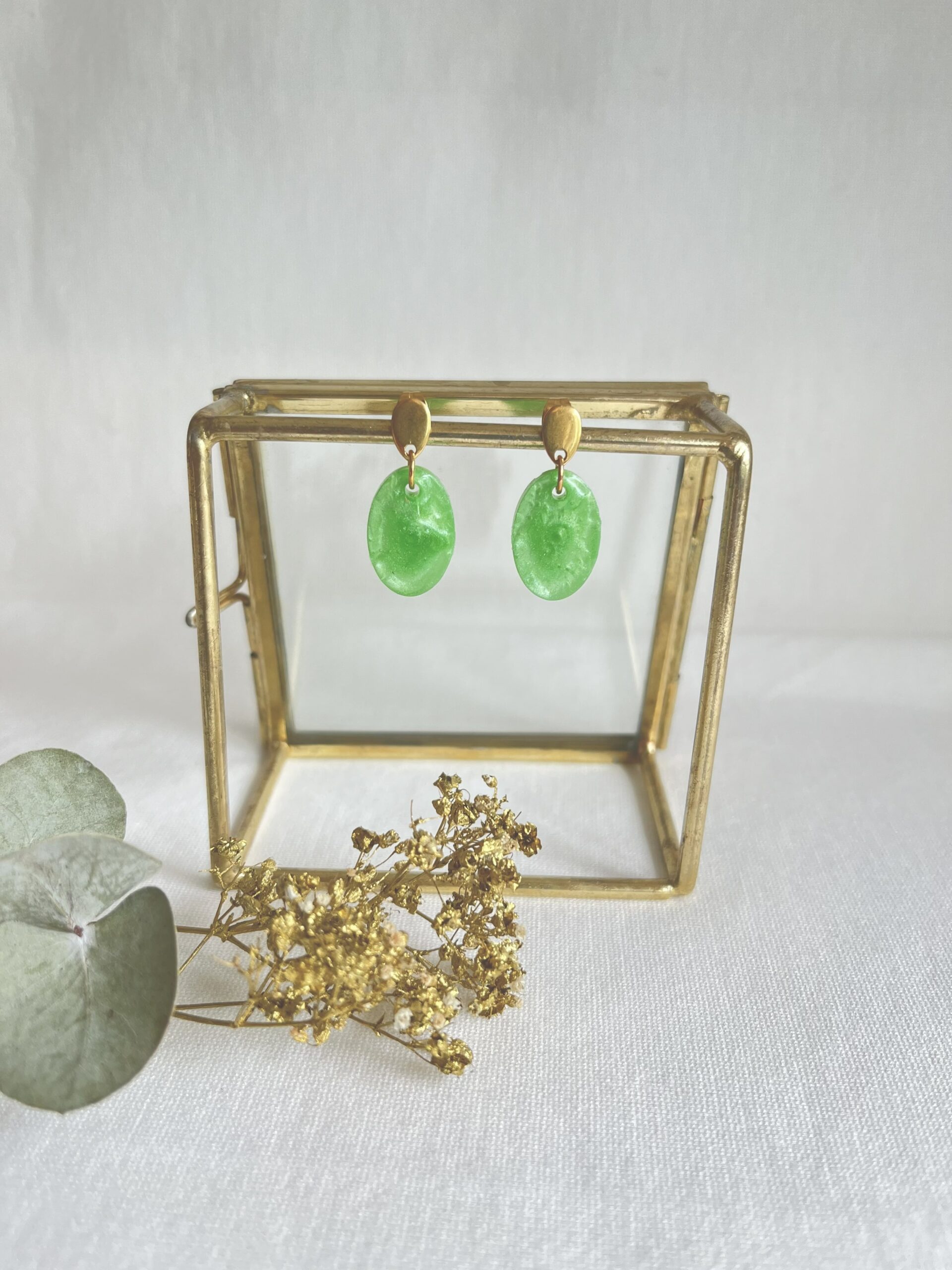 Oorbellen van resin van een naturel zandkleur in een mooi maatje ronde vorm aan zilveren RVS oorstekers. Het is net of de hangertjes facet geslepen zijn. De oorbellen zijn licht van gewicht en hebben een totale lengte van 3 cm.