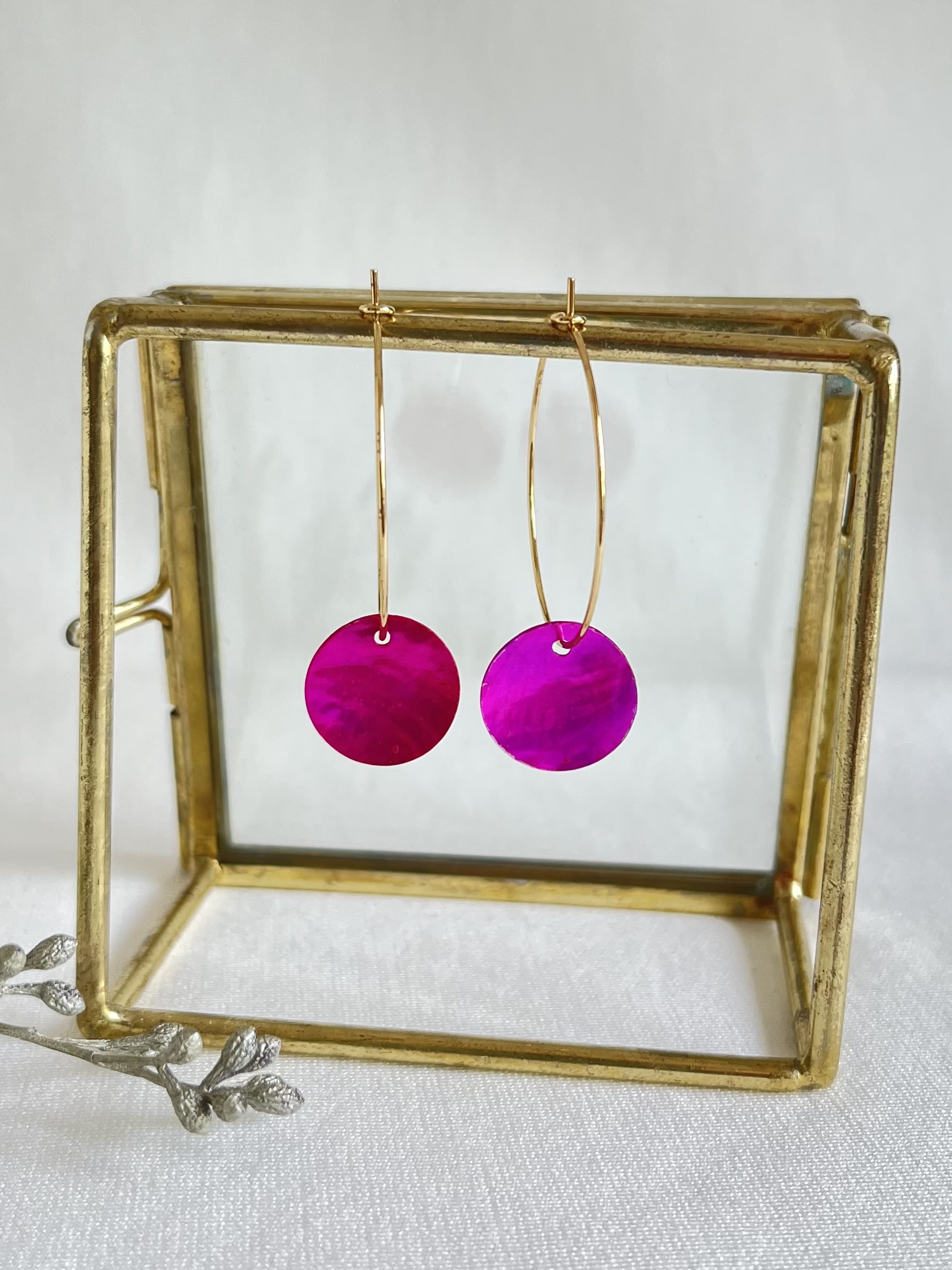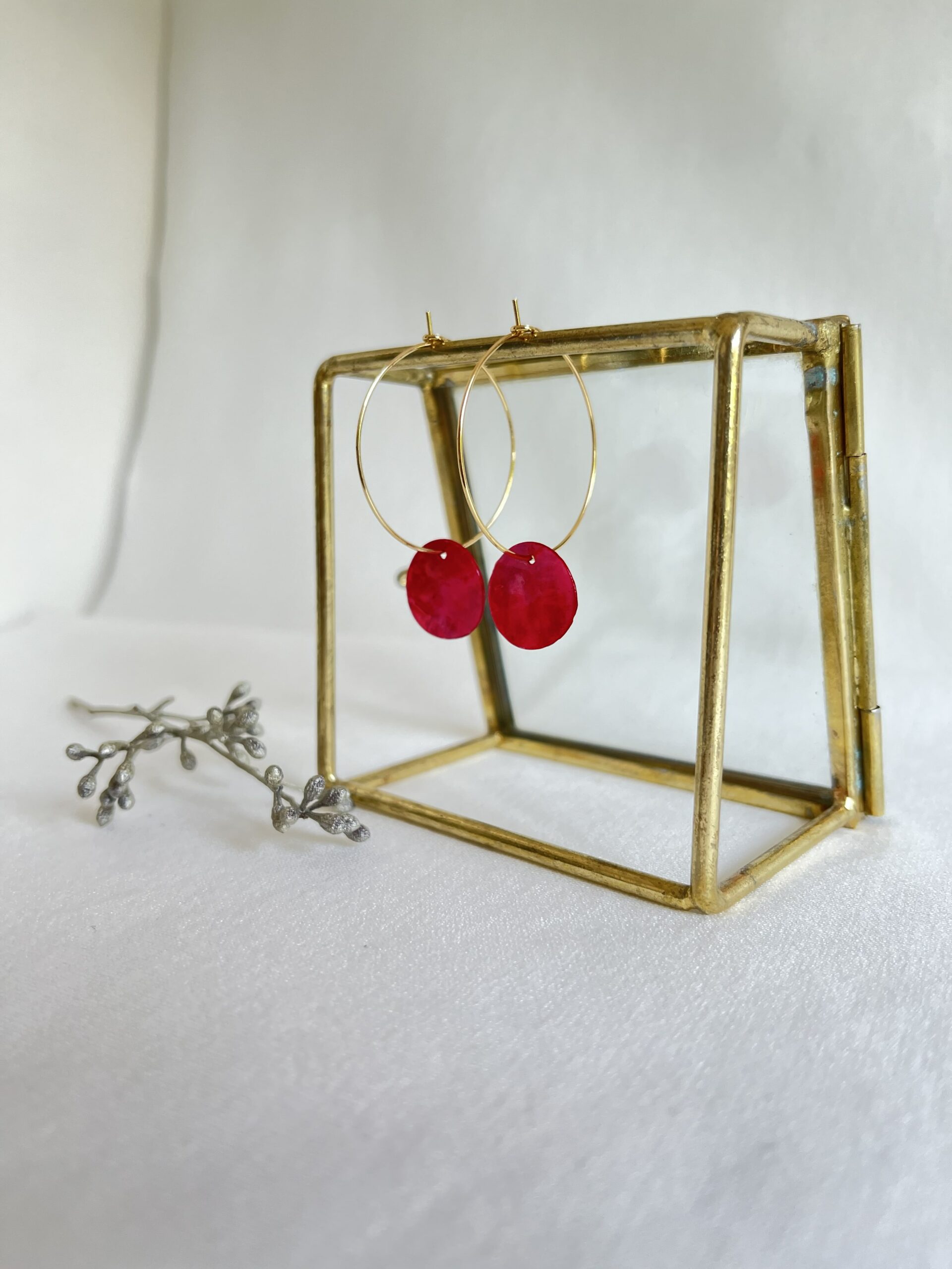 RVS gouden creolen met rode schelphangertjes. Subtiel, maar opvallend door de mooie glanzende rode kleur. Leuk single, maar ze staan ook leuk naast je oorknopje! De creolen zijn 30mm rond. De totale oorbel is 4 cm.