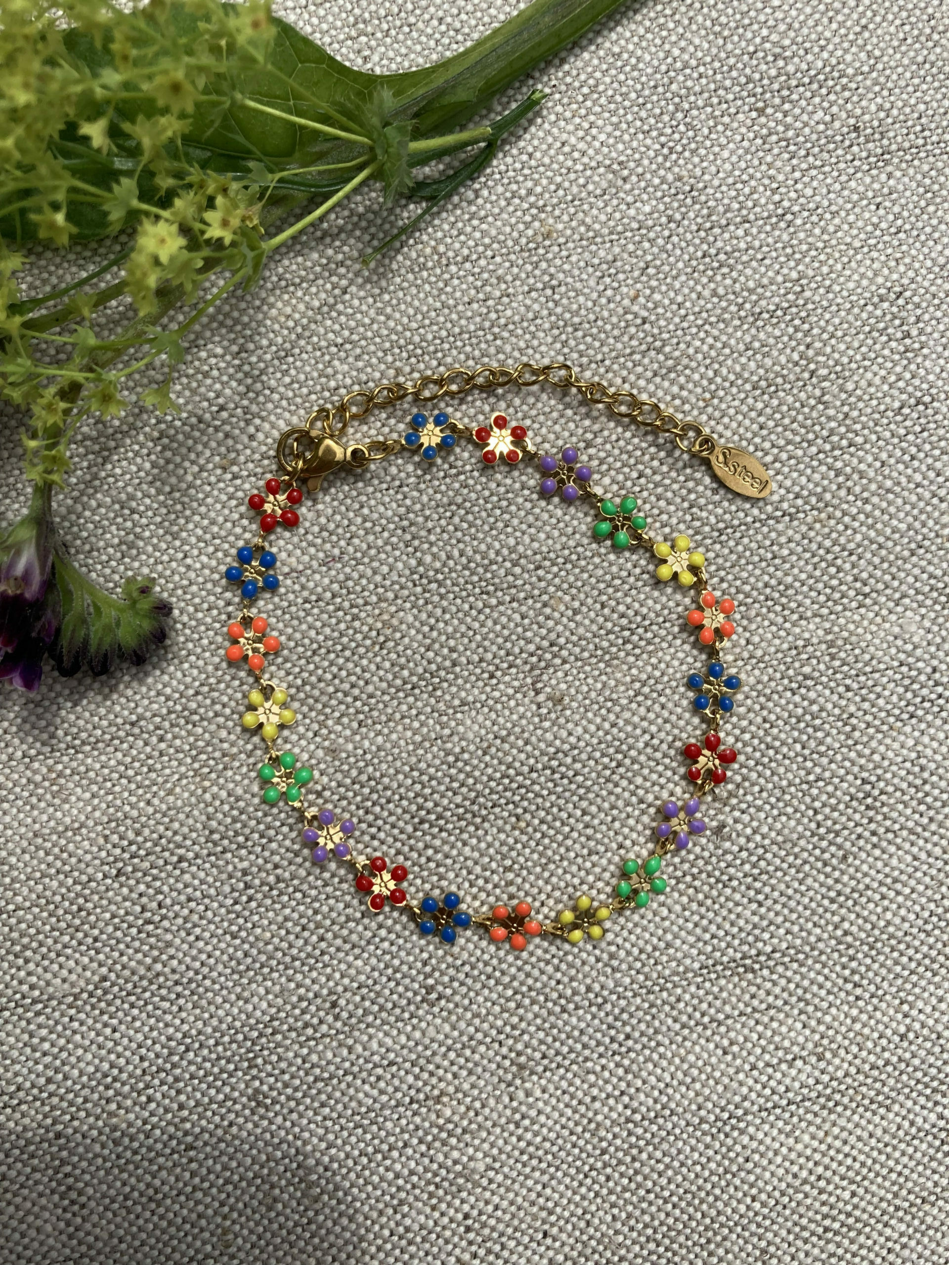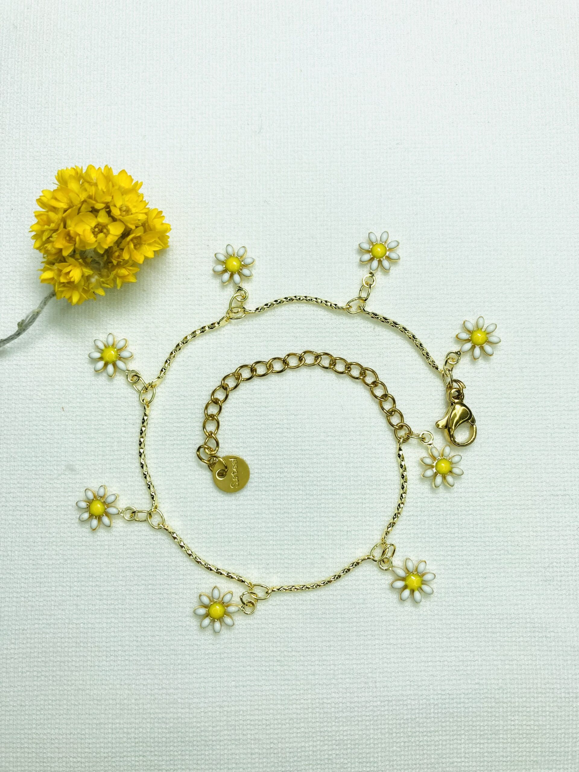 Schattig, dit setje met madeliefjes! Het RVS gouden armbandje met geëmailleerde madeliefjes is afgewerkt met een 18 KRT verguld RVS slotje en verlengkettinkje. De oorknopjes zijn ook 18K verguld RVS. Het armbandje is in iedere lengte te maken. Geef bij de bestelling de omtrek van de arm door. Op maat gemaakte artikelen kunnen niet geretourneerd worden.
