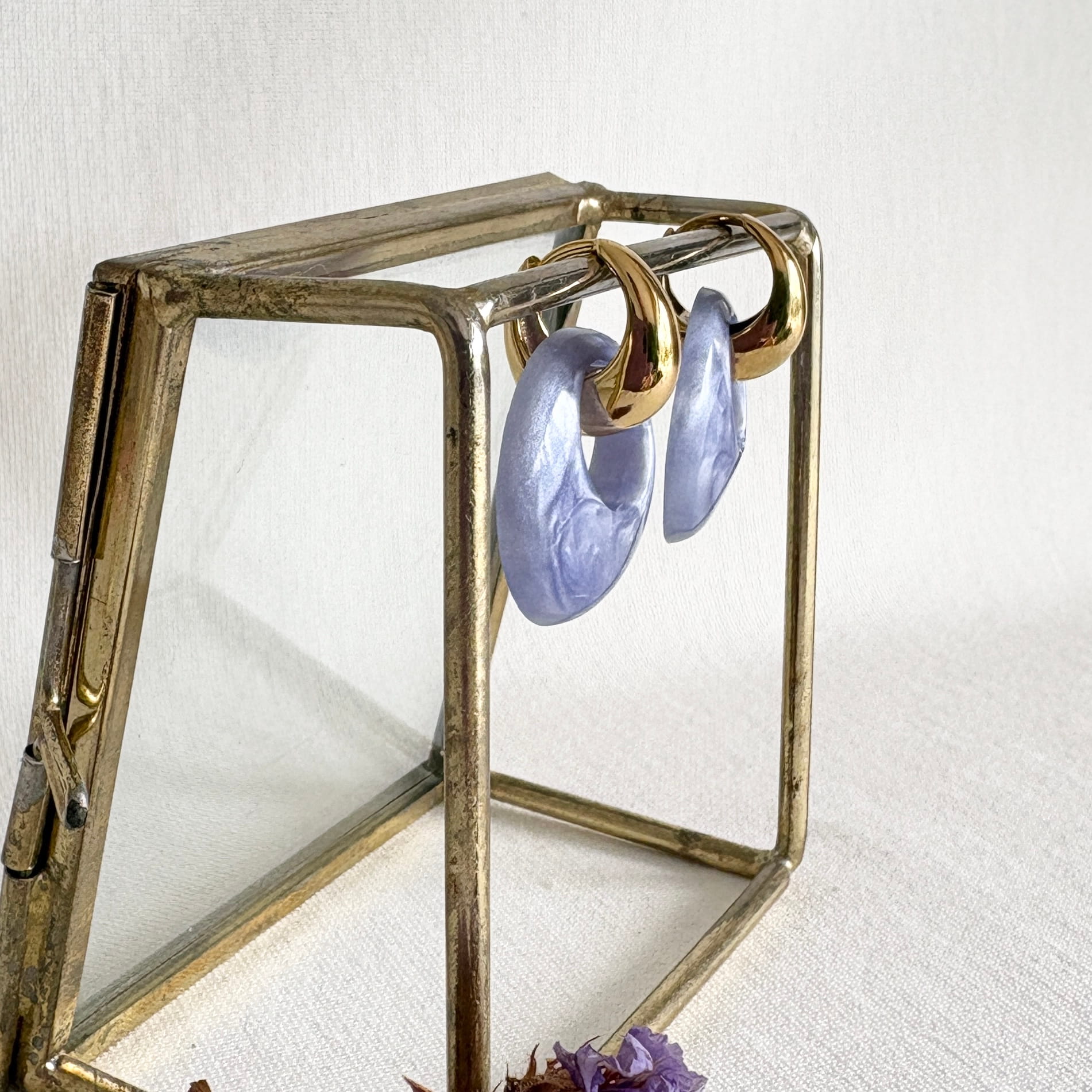 Mooi lavendel blauw zijn deze oorbellen in een vloeiende ronde vorm. De lavendel blauwe oorbellen zijn gemaakt van resin en door het te mengen met pigmentpoeder krijgen ze een mooi marmereffect en parelmoer glans. De creolen zijn van RVS goud. De oorbellen zijn licht van gewicht en hebben een leuke lengte van 3 cm.
