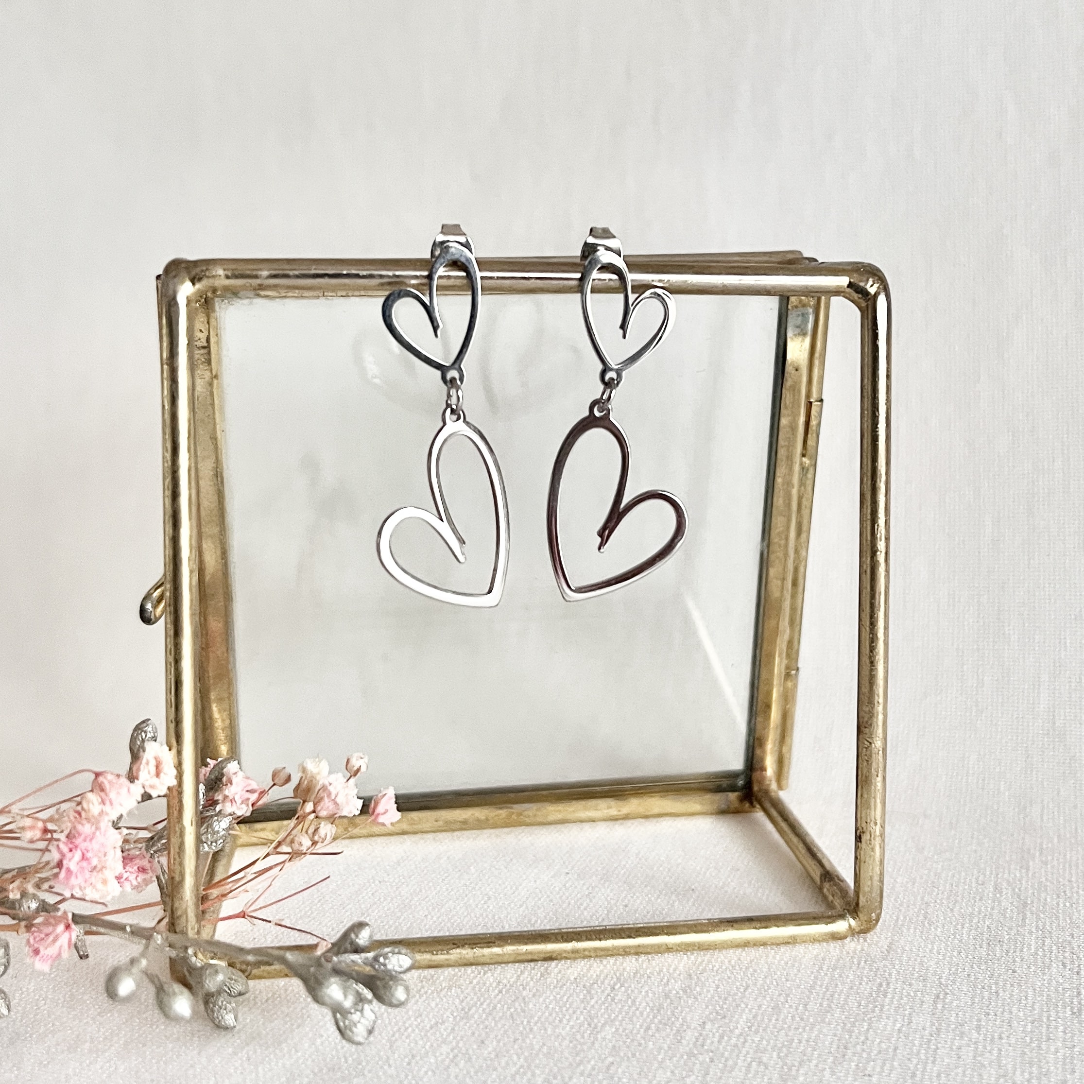 Leuke zilveren RVS oorbellen met 2 open hartjes! De hartjes hebben een speelse uitstraling omdat ze niet gelijk van vorm zijn. Als je van fijn houdt, dan zijn dit de perfecte oorbellen. Ze zijn heel fijntjes van vorm. De oorbellen zijn licht van gewicht en hebben een totale lengte van 4 cm.