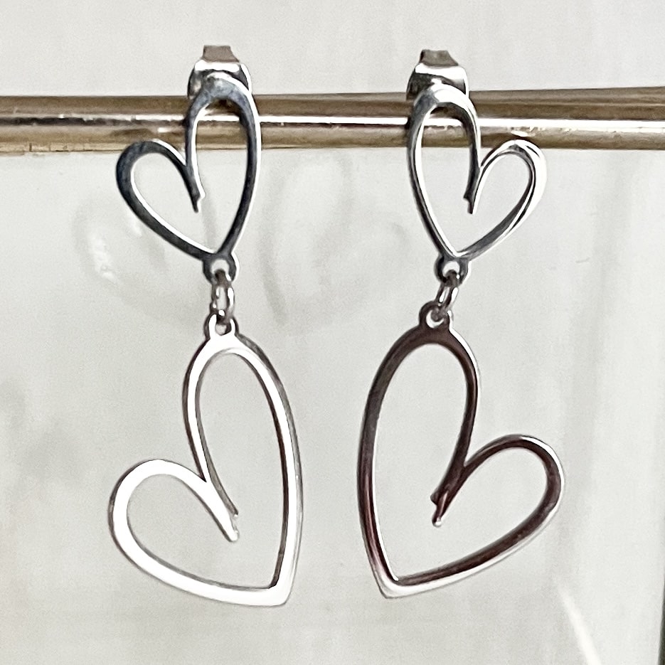 Leuke zilveren RVS oorbellen met 2 open hartjes. Licht van gewicht en lengte is 4 cm.