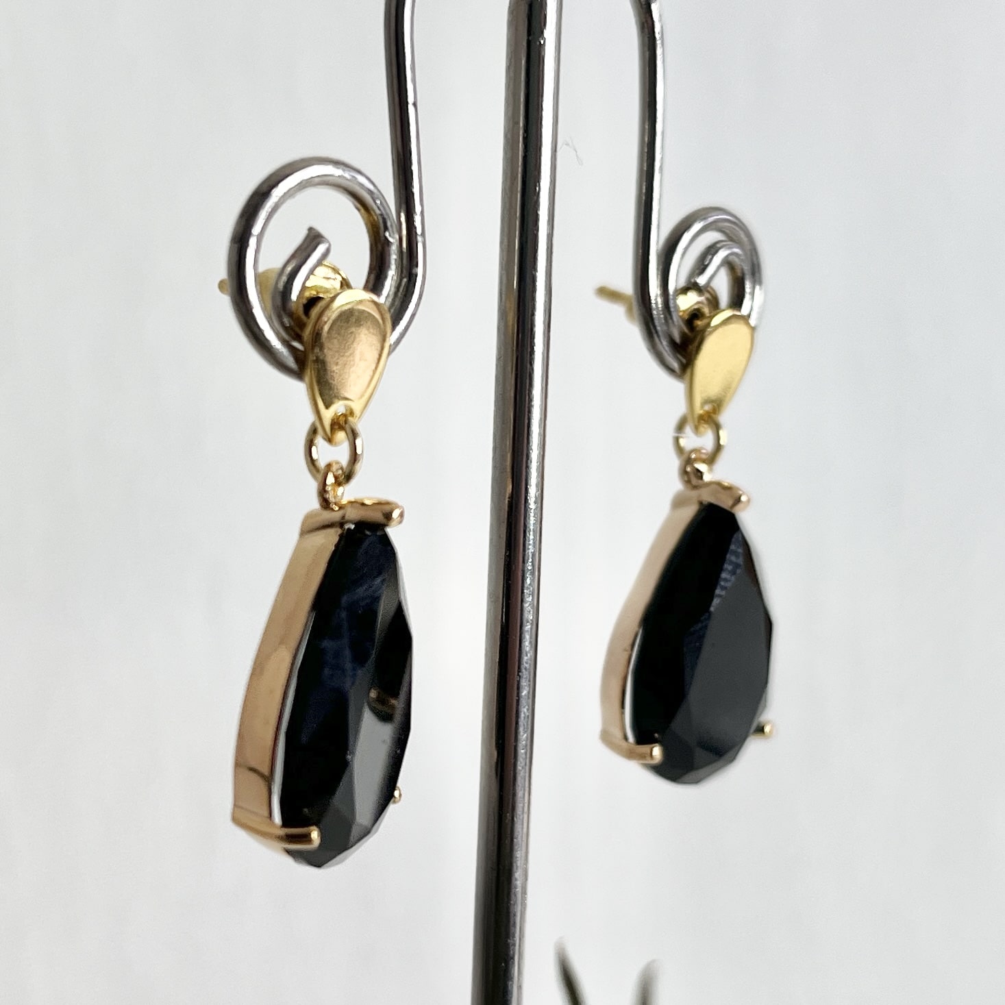 Zwarte oorbellen met een kristal druppel aan RVS gouden oorstekers. De oorbellen zijn licht van gewicht en de lengte is 2,5 cm.