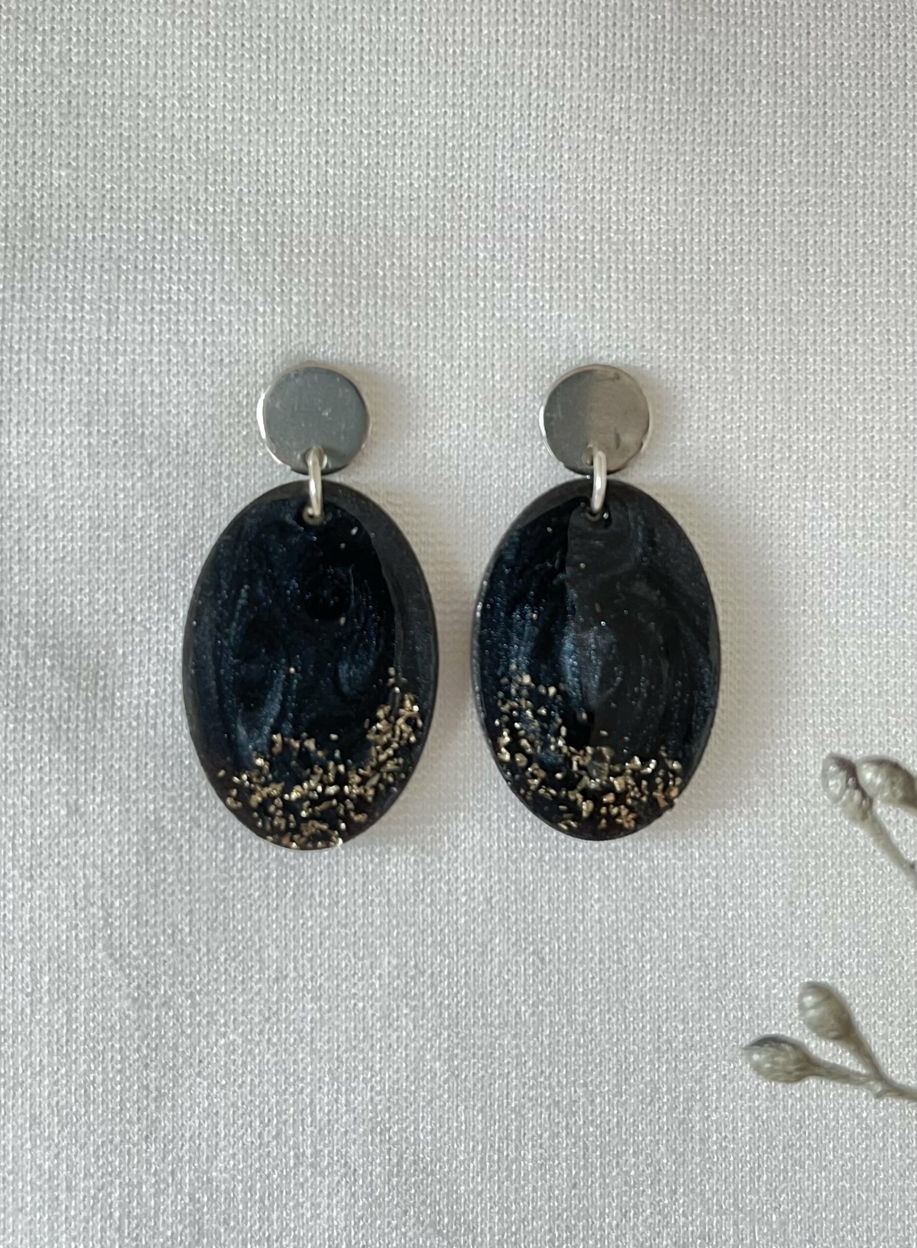 Zwarte oorbellen van resin met goudvlokjes aan vergulde oorstekers