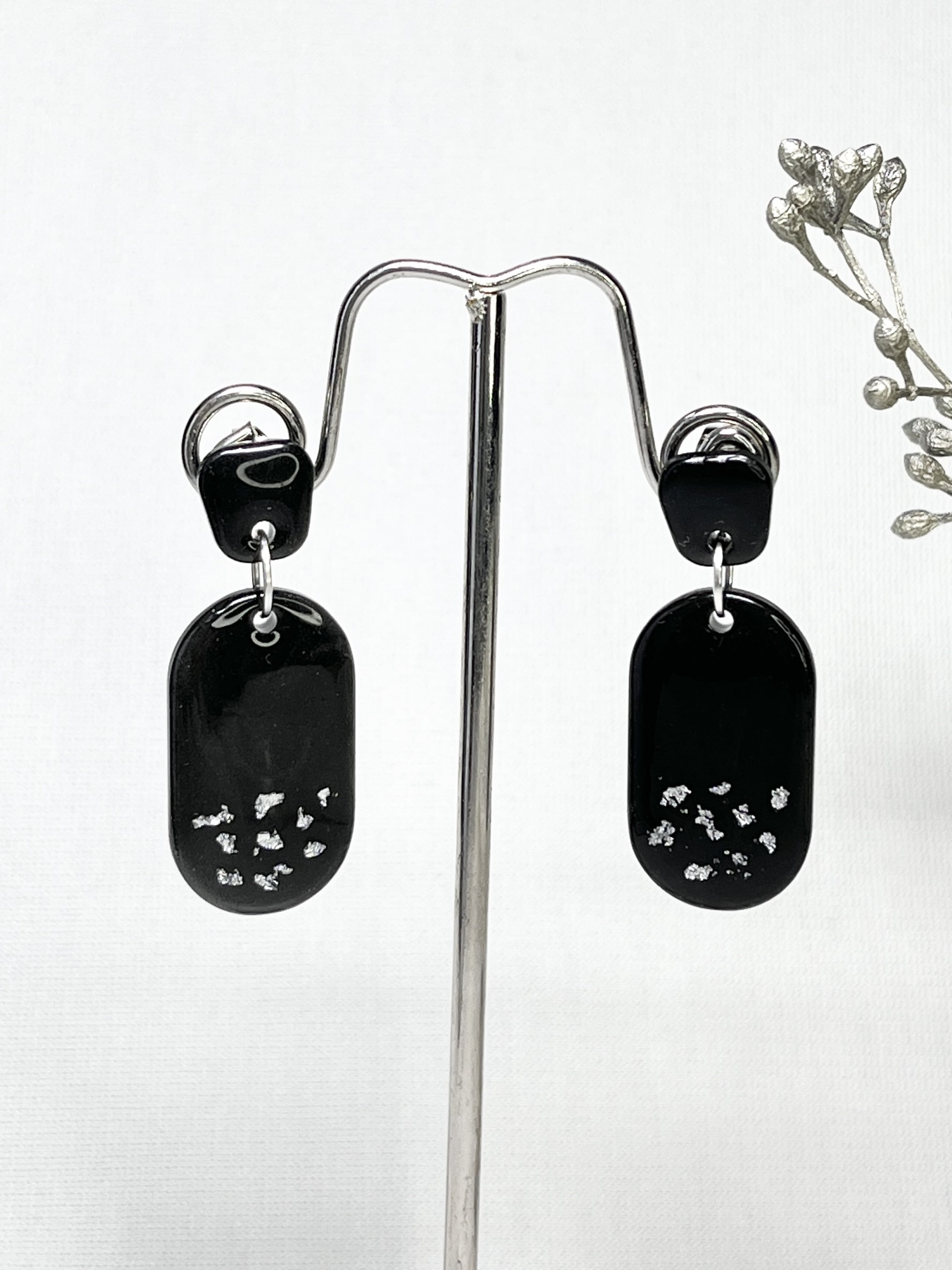 Zwarte oorbellen van resin met goudvlokjes in een mooie rechte vorm met afgeronde hoeken. De oorbellen zijn licht van gewicht en hebben een totale lengte van 3,5 cm.